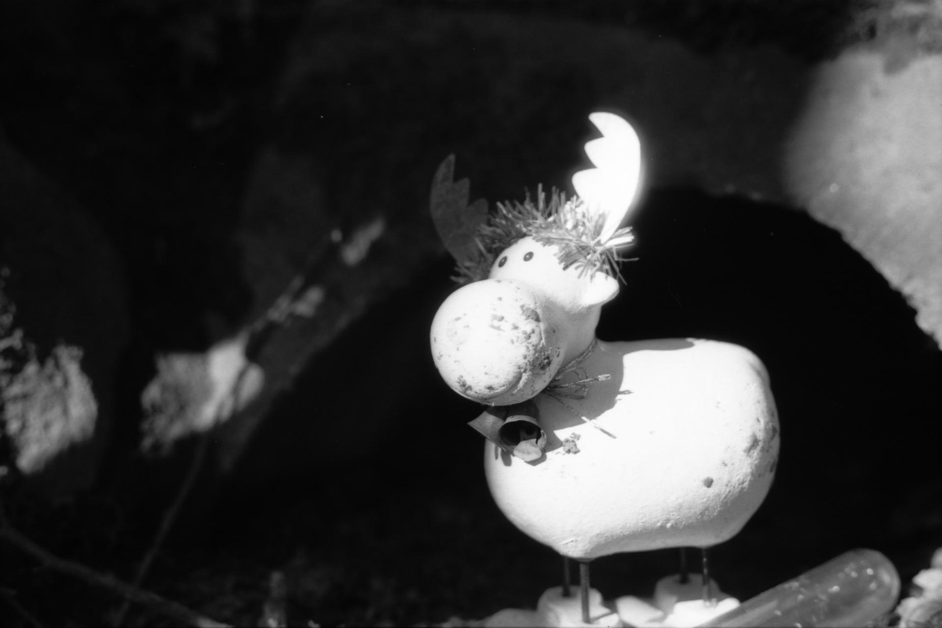 Und dann haben wir doch noch ein Döschen gefunden. (Zuiko 50mm, keine Belichtungsdaten.) Dieser wurde von einem kleinen Elch bewacht. Das Halsband, bestehend aus einem weißen Kabelbinder, ist auch hier wieder total überbelichtet und blutet genau so aus, wie ich das oben auf einem der anderen Bilder schon hatte. Was die Belichtungsdaten angeht: Die habe ich mal wieder vergessen aufzuschreiben, aber von den eckigen Blenden im Hintergrund schließe ich auf ca. f/4. Keine Ahnung, was die Zeit angeht. Ist ja ziemlich dunkel im Hintergrund und trotzdem blutet das Halsband aus, also nehme ich an, dass die Belichtungszeit relativ lang war.