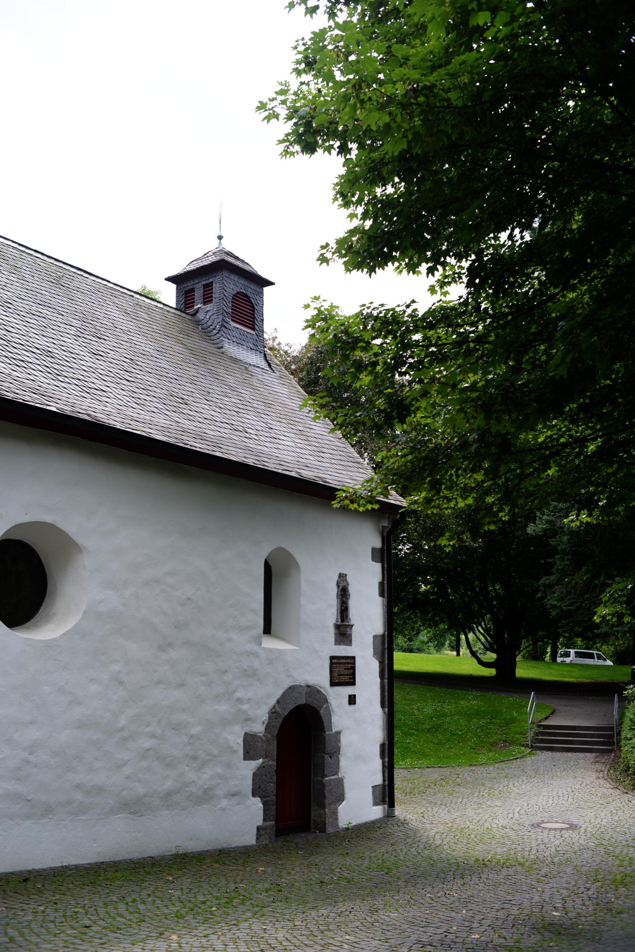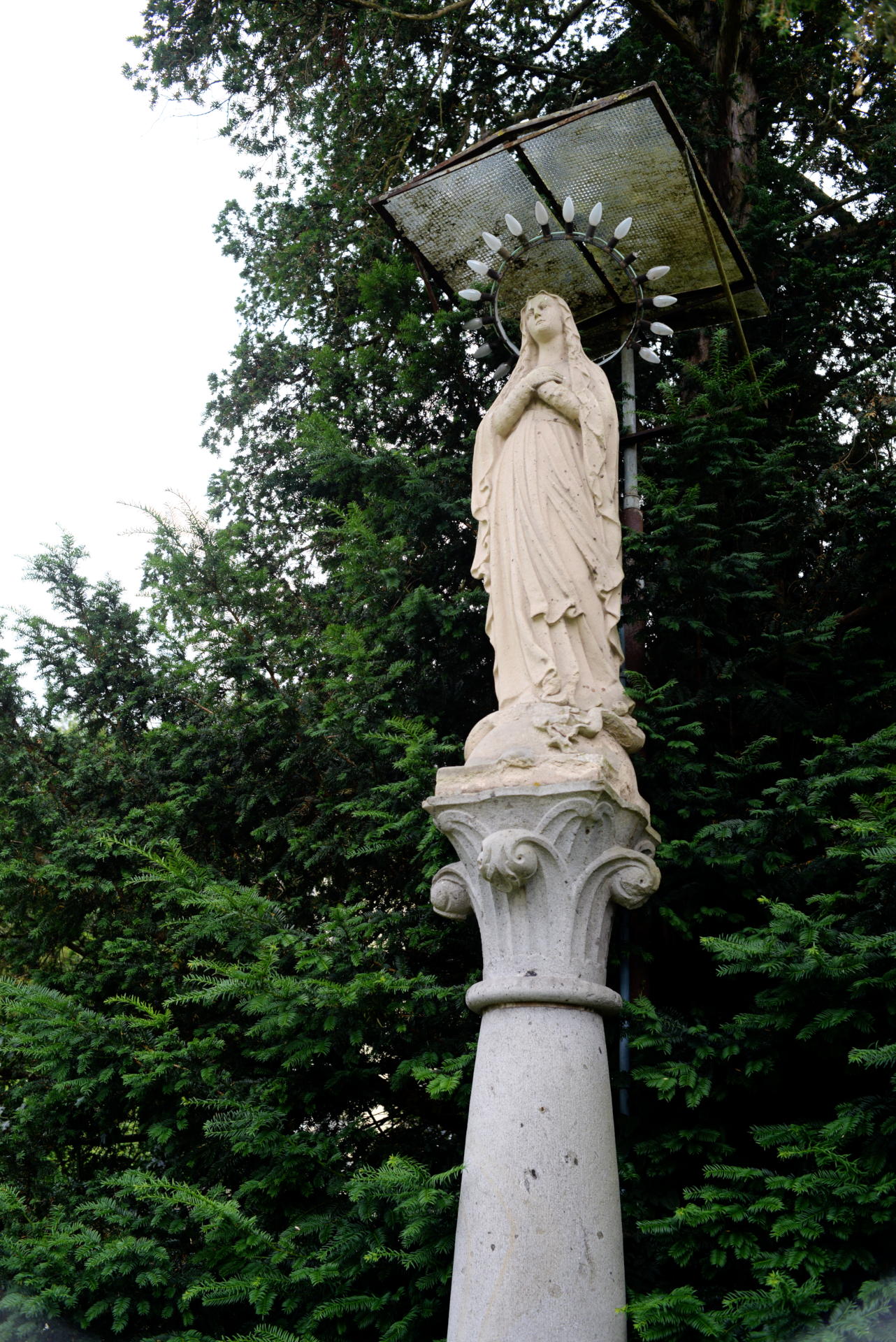 Zurück am Auto habe ich dann noch ein Gegenlichtbild von einem der Wallfahrtsdings gemacht, die hier an der Straße entlang stehen. (Zuiko 50mm, 1/250s, f/5,6.) Recht gut geworden, auch wenn es auf Grund des Gegenlichts etwas unterbelichtet ist. Hätte manuell ein bisschen höher drehen müssen, aber das ist bei der Kamera ja schwierig, weil es dafür ja nur den ISO-Drehknopf gibt. Trotzdem, die Reflexe auf der Straße sind schon recht spannend.