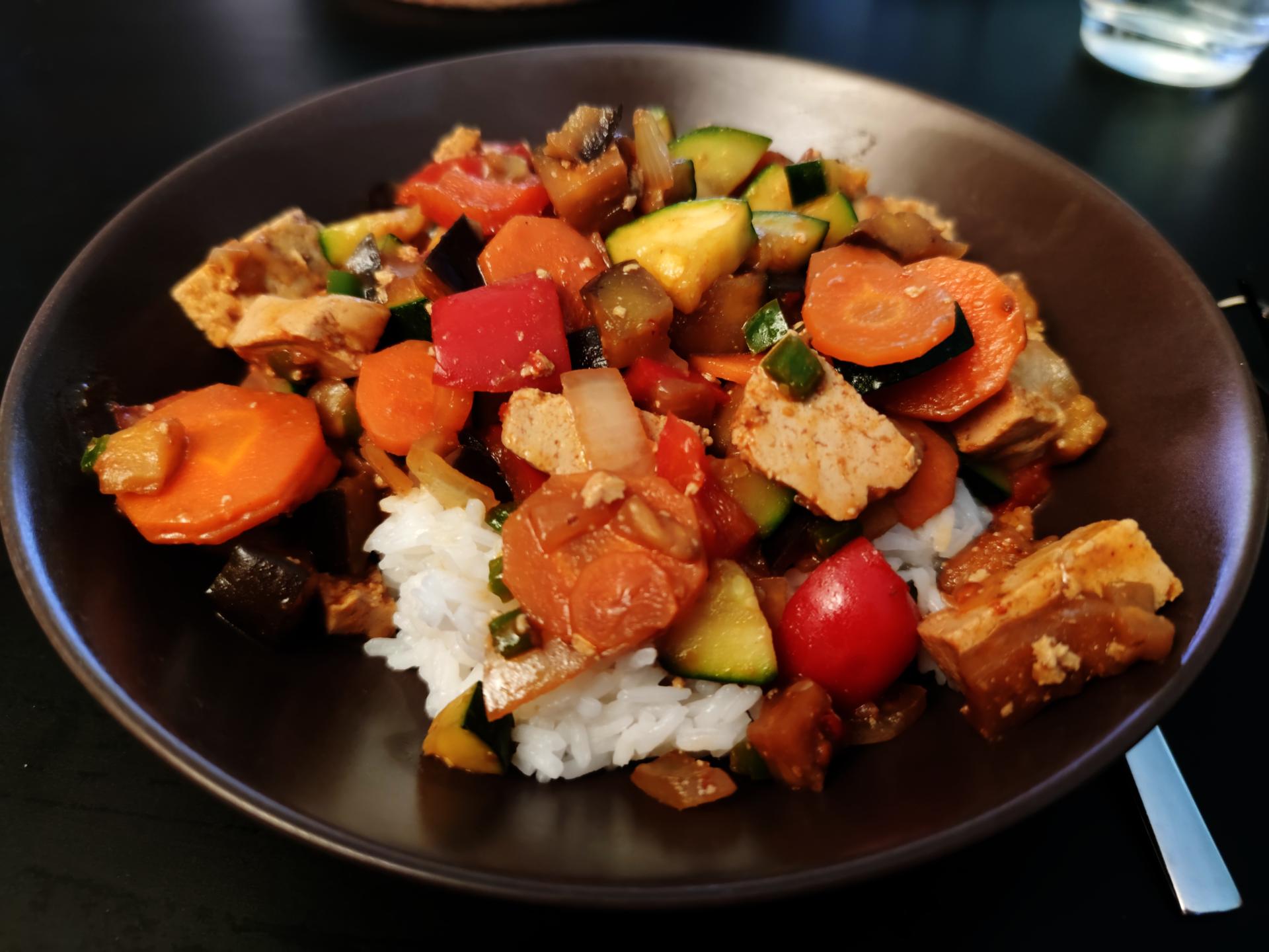 Das Ergebnis was sehr sehr sehr lecker und es ist noch genug übrig, um da von noch mal zu essen. Und sieht auch erstaunlich gut aus. Also, finde ich jetzt. Vor allem nach dem vielen Grillgut, das wir in den letzten Tagen vernichtet haben, war so ein veganes/vegetarisches Essen mal eine tolle Abwechslung.