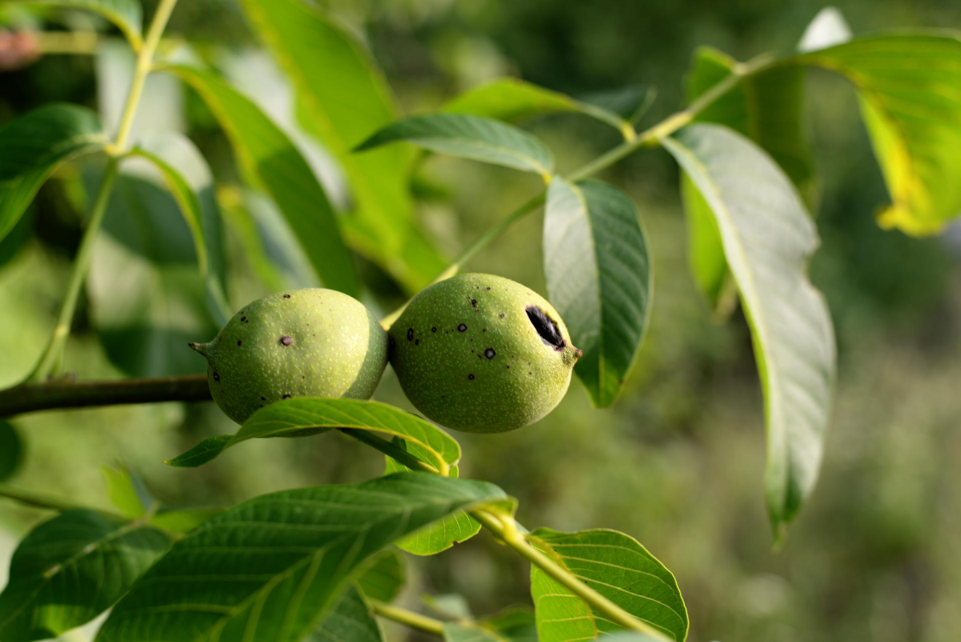 Das erste, was ich inspiziert habe, waren die Walnüsse. Die sehen von Außen recht gut aus, sind auch gut groß geworden. Sind aber auch hier noch nicht reif, auch wenn ebenso wie oben vor dem Hof gestern dieses Exemplar hier teilweise schon was fallen lässt. Zu trocken, nehme ich an.