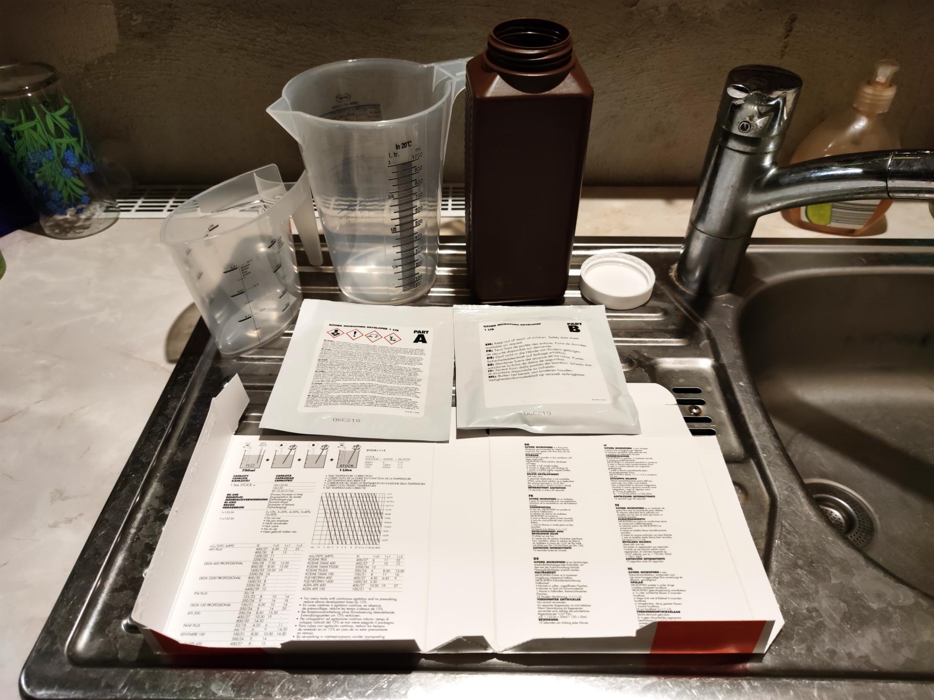 So, und da das Zeug ja erst mal abkühlen muss, nachdem man es bei 40° angerührt hat, und sich außerdem auch noch ein bisschen setzten muss, habe ich es auch gleich angerührt. Geht einfacher als gedacht. Einfach A ins Wasser, Rühren, B ins Wasser, Rühren, auffüllen, fertig. Stinkt allerdings schon ziemlich, besonders, wenn Part A mit dem Reduktionsmittel ins warme Wasser kommt.