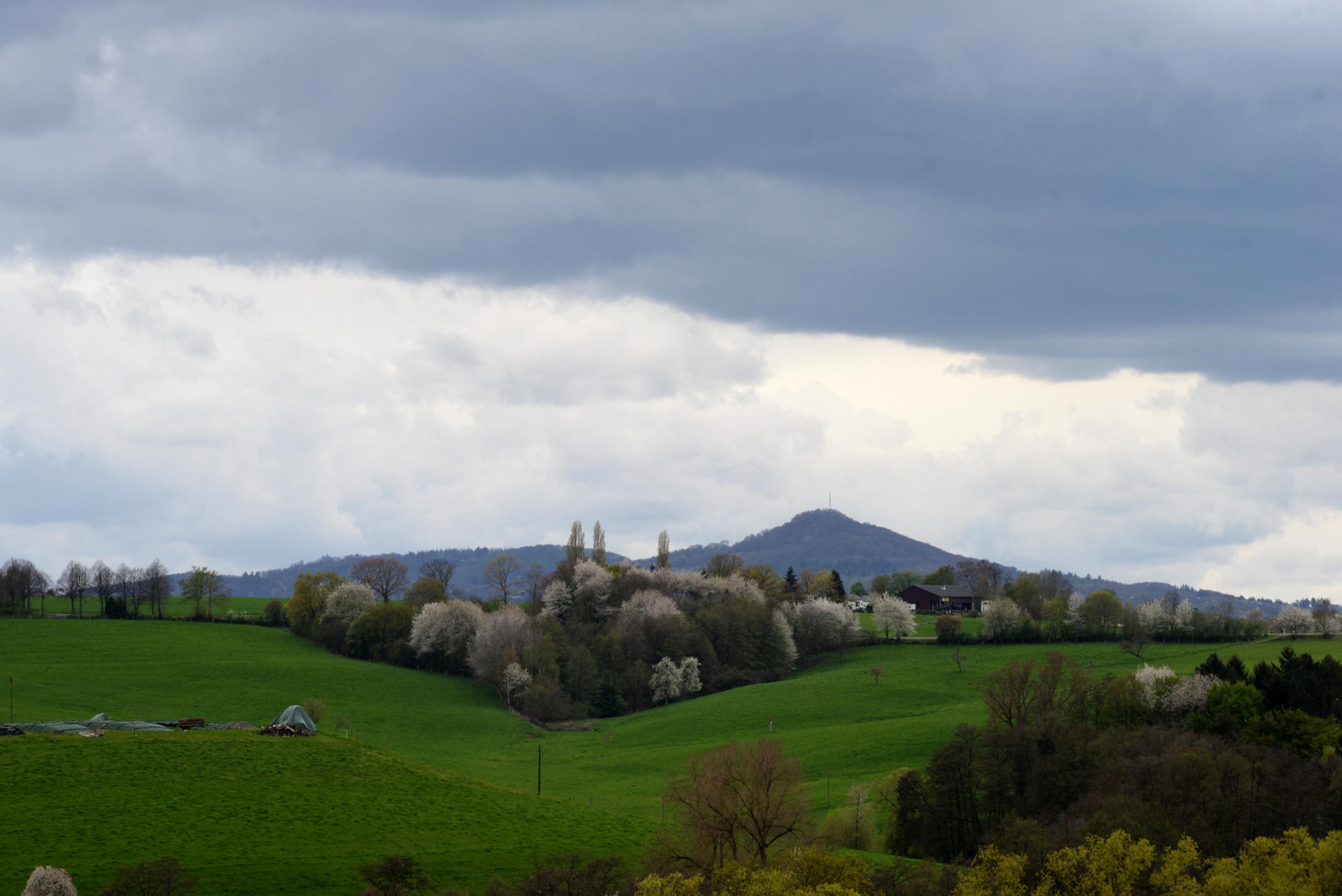 Apropos 50er, das habe ich immer wieder hektisch drauf geschraubt, wenn der nächste Regenschauer kam - mit dem 135er passt die Kamera nämlich nicht in die kleine Tasche, die ich dabei hatte. Und bevor alles nass wird... Jedenfalls habe ich dann die Gelegenheit genutzt und die Aussicht damit fotografiert. Muss ja auch sein. Ist zwar nicht das erste Mal, aber mit den frisch auskeimenden Feldern dann irgendwie doch wieder.