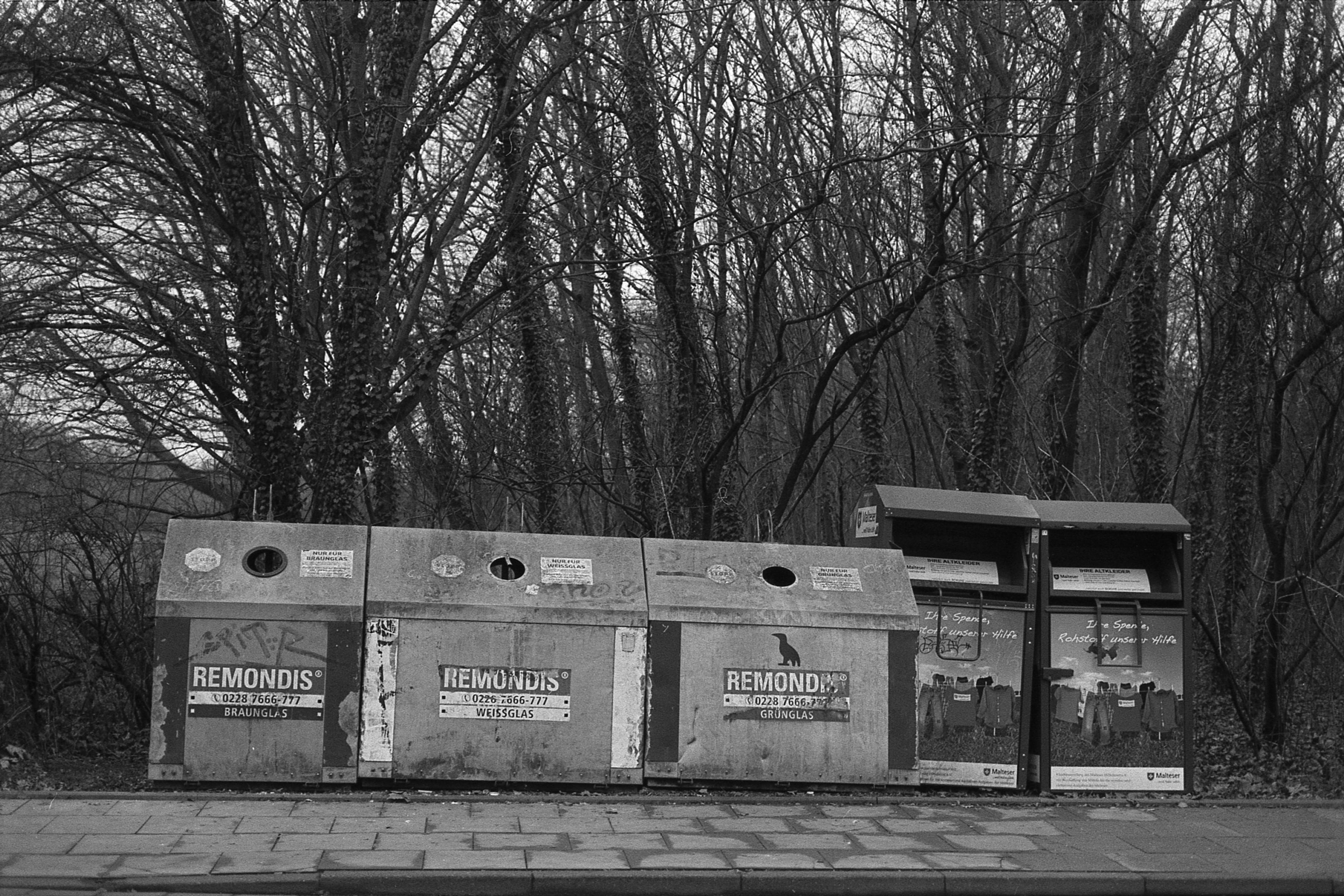 Als weiteres Kontrastprogramm zur kleinen Burg nebenan habe ich dann noch die Flaschen- und Kleidersammlungs-Container mitgenommen. (1/160s, f/2,8, 50mm.) Wie man an der Bordsteinkante sehen kann, das Bild ist eigentlich gerade, was mir eher selten passiert - die Container sind so schief. Warum man mit diesen Dingern die schöne Landschaft so verschandelt, wer weiß. Wahrscheinlich ist das der einzige Platz, der weit genug von bewohntem Gebiet entfernt ist, dass sich die Anwohner nicht beschweren, wenn es hin und wieder mal klirrt. Wo kämen wir da hin, das ist ja fast so, als würde man ein Windrad aufstellen! Überall gerne, solange es mich nicht betrifft. :-/