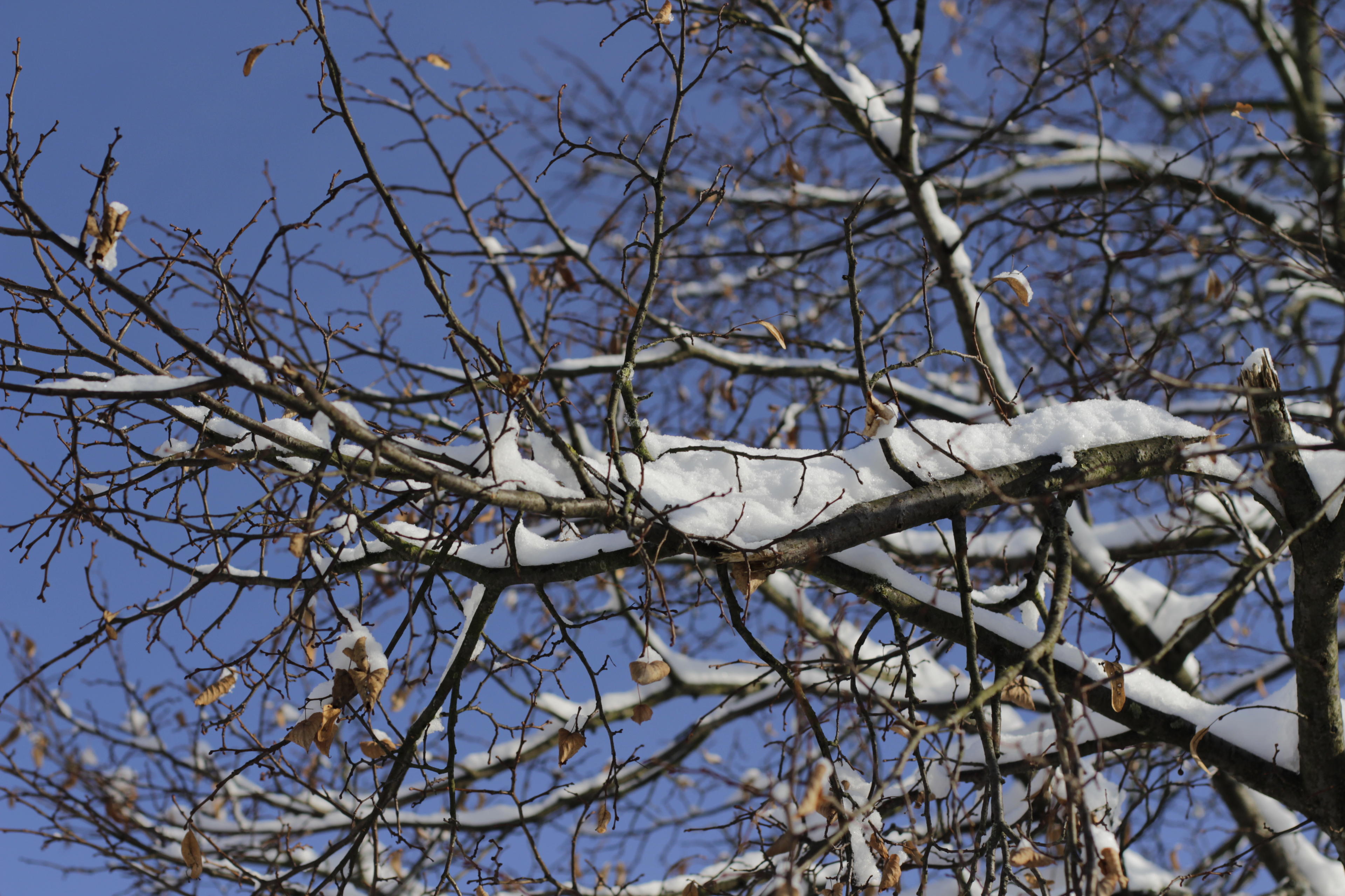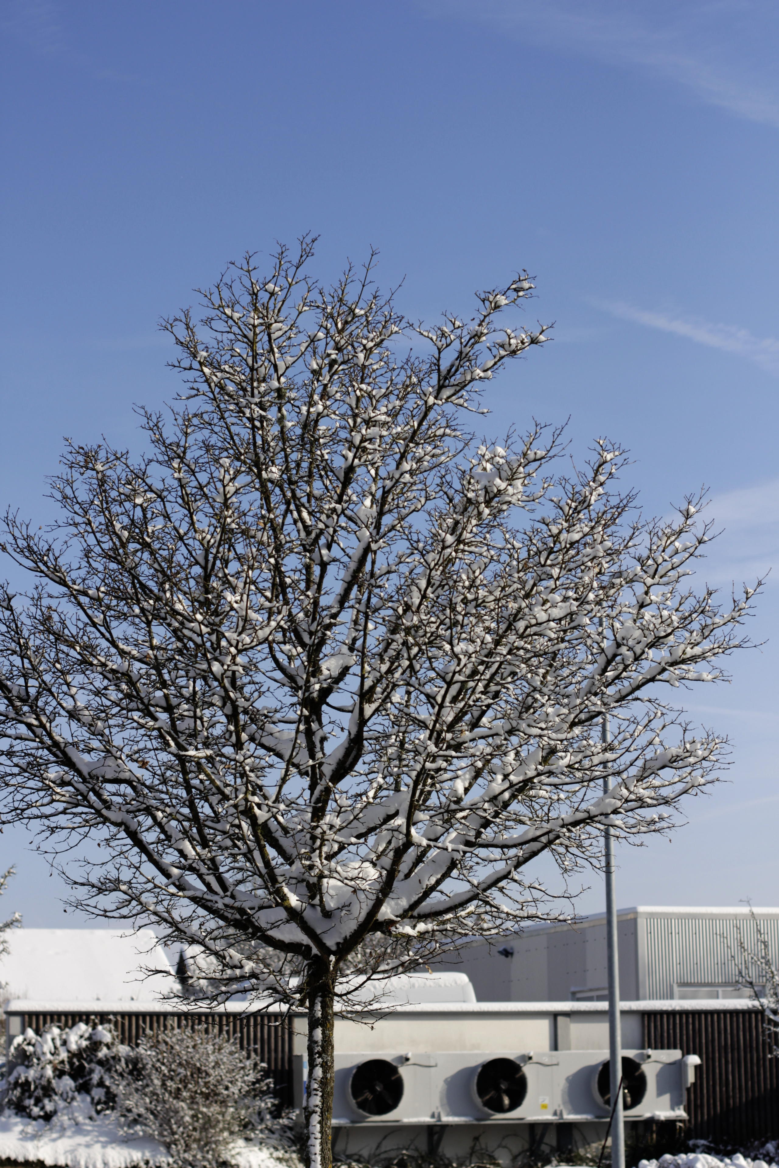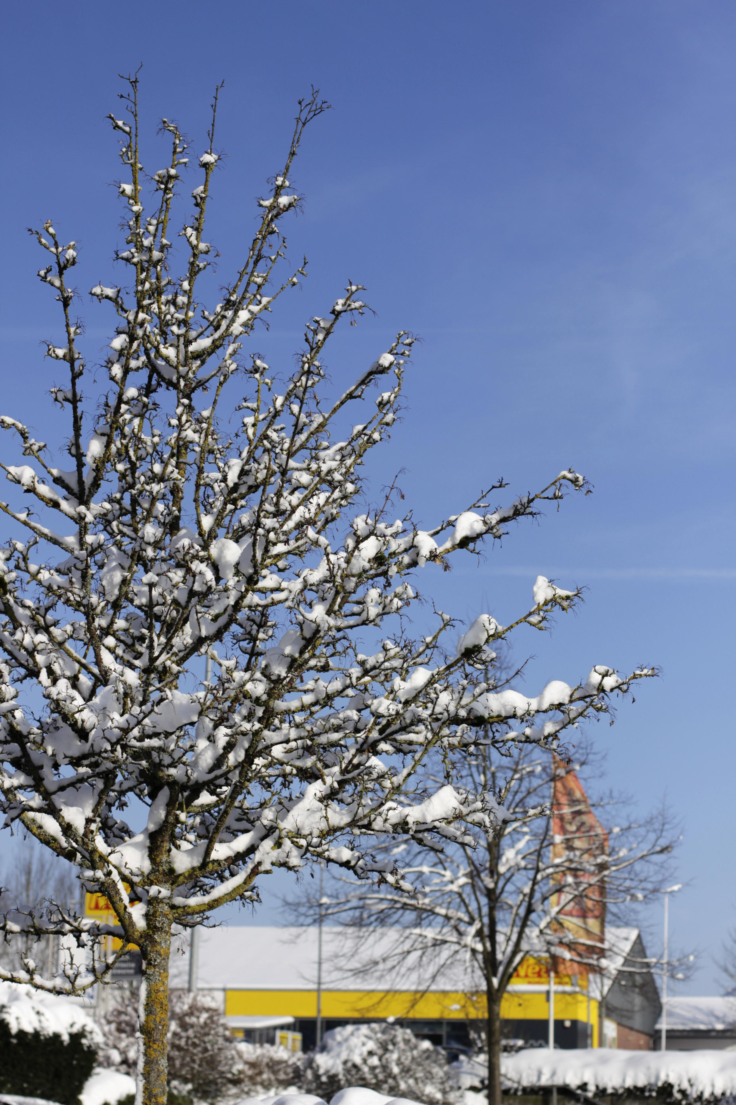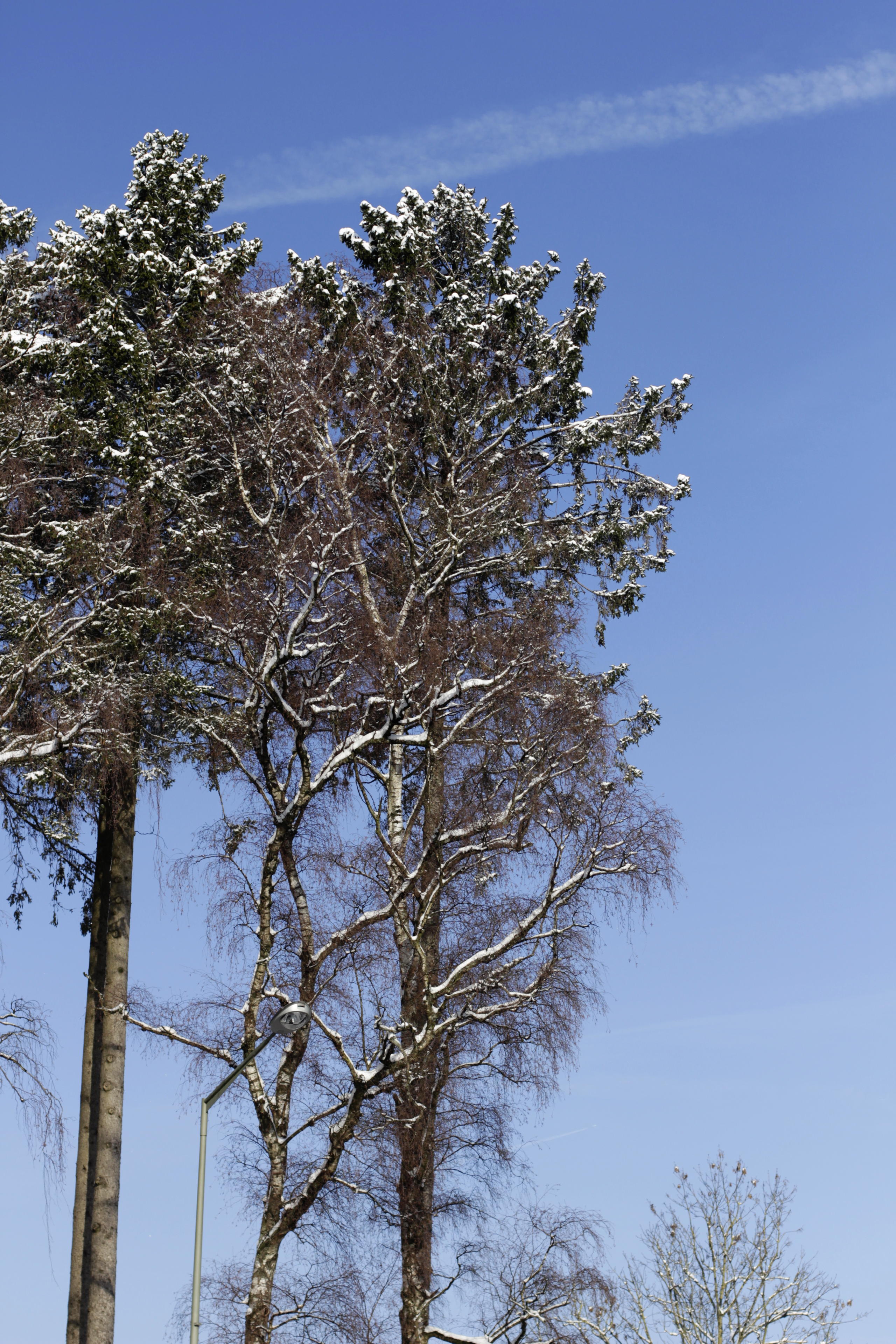 Nachdem so gegen 10 die Sonne raus kam und ich die Auffahrt frei geschaufelt hatte - ein Besenstiel hat es nicht überlebt -, habe ich mich dazu durchgerungen, mal unten an der Höhenstraße zu schauen, wie es dann da so aussieht. Die war frei, geräumt und gesalzen. Also habe ich mein Auto, das ich mittlerweile aufgrund meiner Vorarbeit bereits wieder erreichen konnte, mit dem Handfeger freigelegt und die Scheiben enteist. Denn mein Plan war nach wie vor: Einkaufen gehen für die Mutter. Denn die war da oben auf dem Dorf ja mehr oder weniger komplett eingeschneit. (Wobei, das stimmt nicht ganz, denn da gibt es immerhin einen Winterdienst, der bereits die Straße frei gelegt hatte. Im Gegensatz zu unserer Sackgasse, die die Anwohner selber machen müssen, weil hier auch kein Räumfahrzeug durch passen würde.) Eine kleine Rutschpartie bis nach Hennef rein und danach freie Fahrt später stand ich auf dem Parkplatz des Discounters mit A und habe Bäume fotografiert. Fragt mich nicht, was die anderen Leute gedacht haben mögen, aber ist ja eigentlich auch ziemlich egal.
