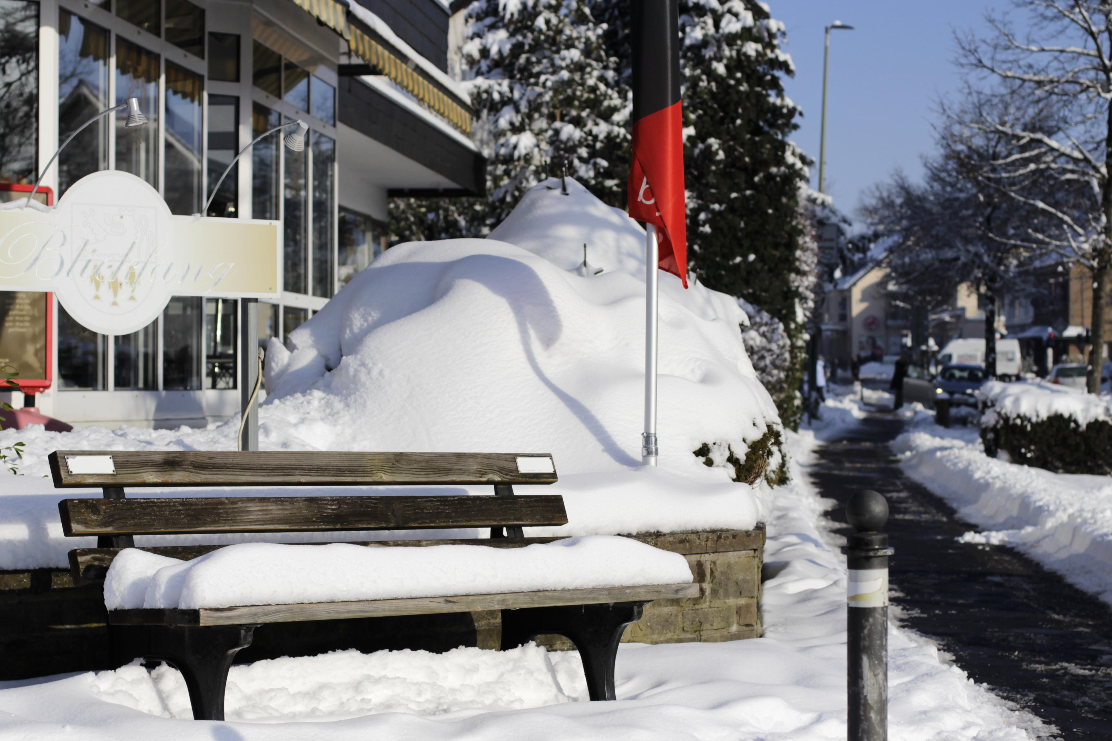 Das Ergebnis sehen wir auf diesen Bildern. Und vor allem, wie angekündigt kam die Sonne raus und es gab richtig guten Kontrast. Der Schnee hat richtig geleuchtet, die nassen Straßen hingegen haben praktisch alles Licht geschluckt. Perfekt zum Fotografieren. Die größeren Straßen waren übrigens tatsächlich alle geräumt. Ich mein, das ist die B56, die Lebensader des Rhein-Sieg-Kreises, insofern muss die auch Priorität haben, wenn man nicht schon vor 6 Uhr gefühlte zwanzigtausend Unfälle haben will.