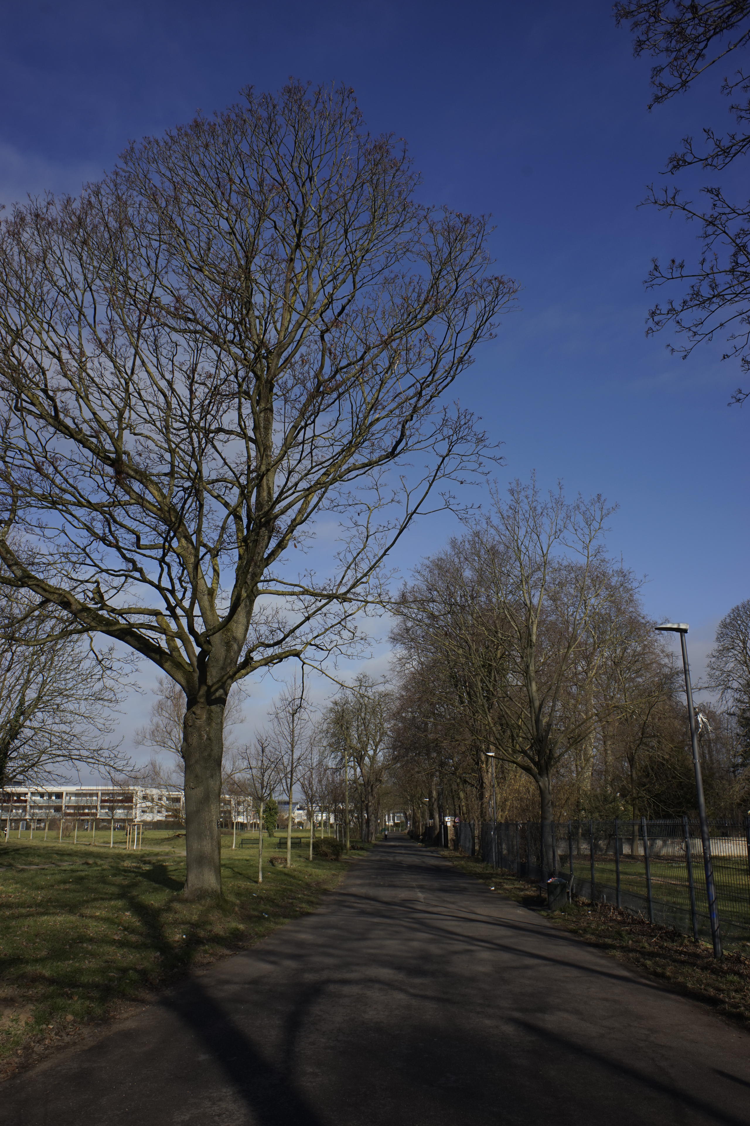 25.2.: Morgens früh musste ich zur Apotheke, weil es am Tag vorher mal wieder nix gab. Alles muss heutzutage bestellt werden. Blöd irgendwie. Ich jedenfalls schnell die Sony geschnappt, als ich sah, dass das Wetter entsprechend schön und hell war. Morgendlicher blauer Himmel macht immer gute Fotos. Und so hatte ich noch mal die Gelegenheit, ein paar Testbilder zu schießen, um die Minoltas genauer zu begutachten. (Spoiler: Nachdem ich festgestellt habe, dass die Bilder alle noch einen Tacken schärfer sein könnten, habe ich in der Kamera die Fokus-Ebenen-Korrektur auf -3 gestellt, das scheint schon ein bisschen zu helfen. Und noch immer frage ich mich: Warum können alle halbwegs modernen digitalen Kameras das, nur die Canon nicht?)