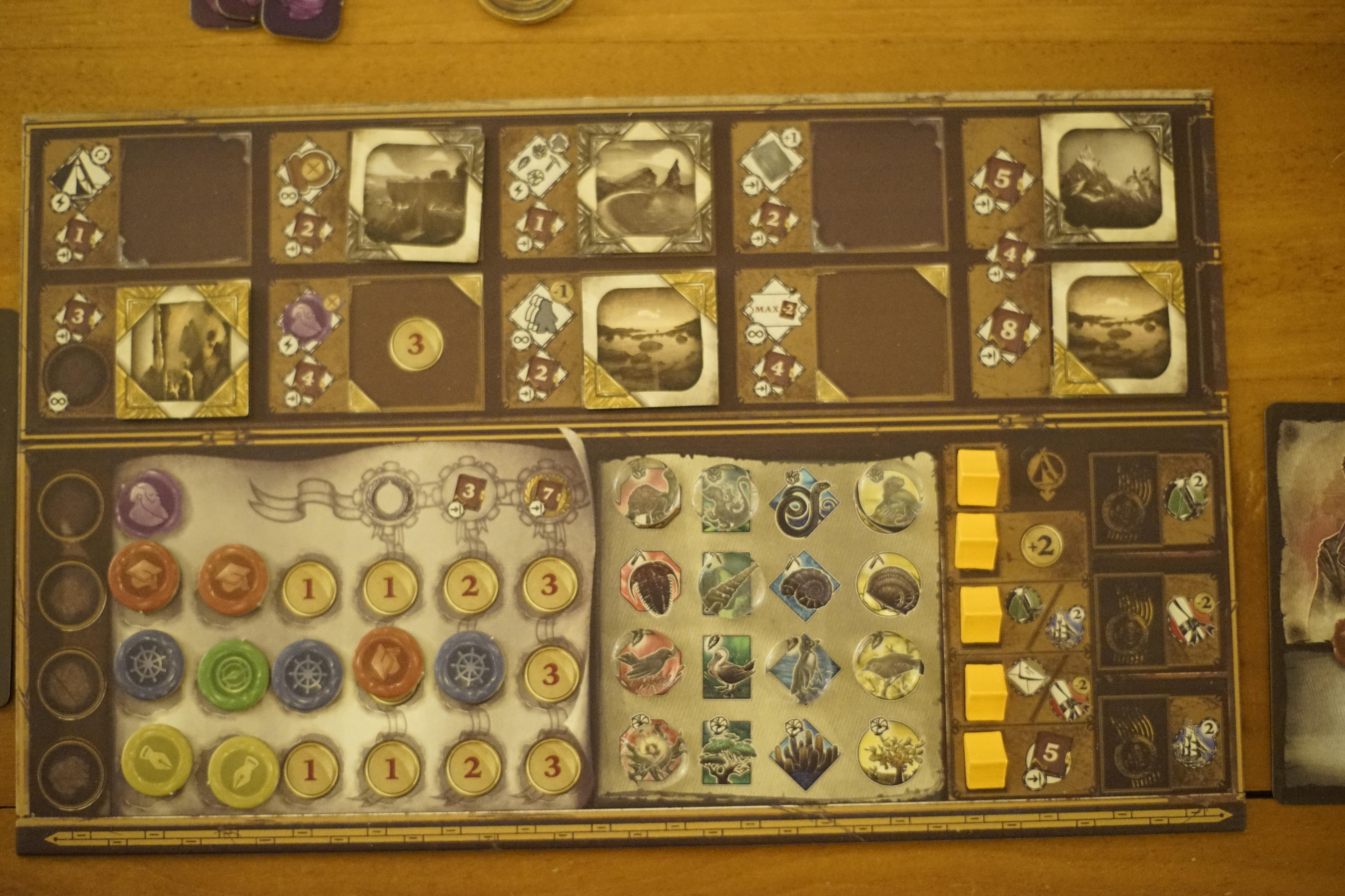 Zum Spiel selber: Man fährt mit seinem Boot der HMS Beagle hinterher und erforscht die Galapagos-Inseln, auf der man seine Forscher aussetzt und die für einen nach Pflanzen, Reptilien, Vögeln und Fossilien suchen. Dann gibt es eine - zu Beginn recht unübersichtliche - Menge von "Tagebüchern", an denen man seine Meeple arbeiten lassen kann (Worker Placement, also), was zu unterschiedlichen Effekten führt: