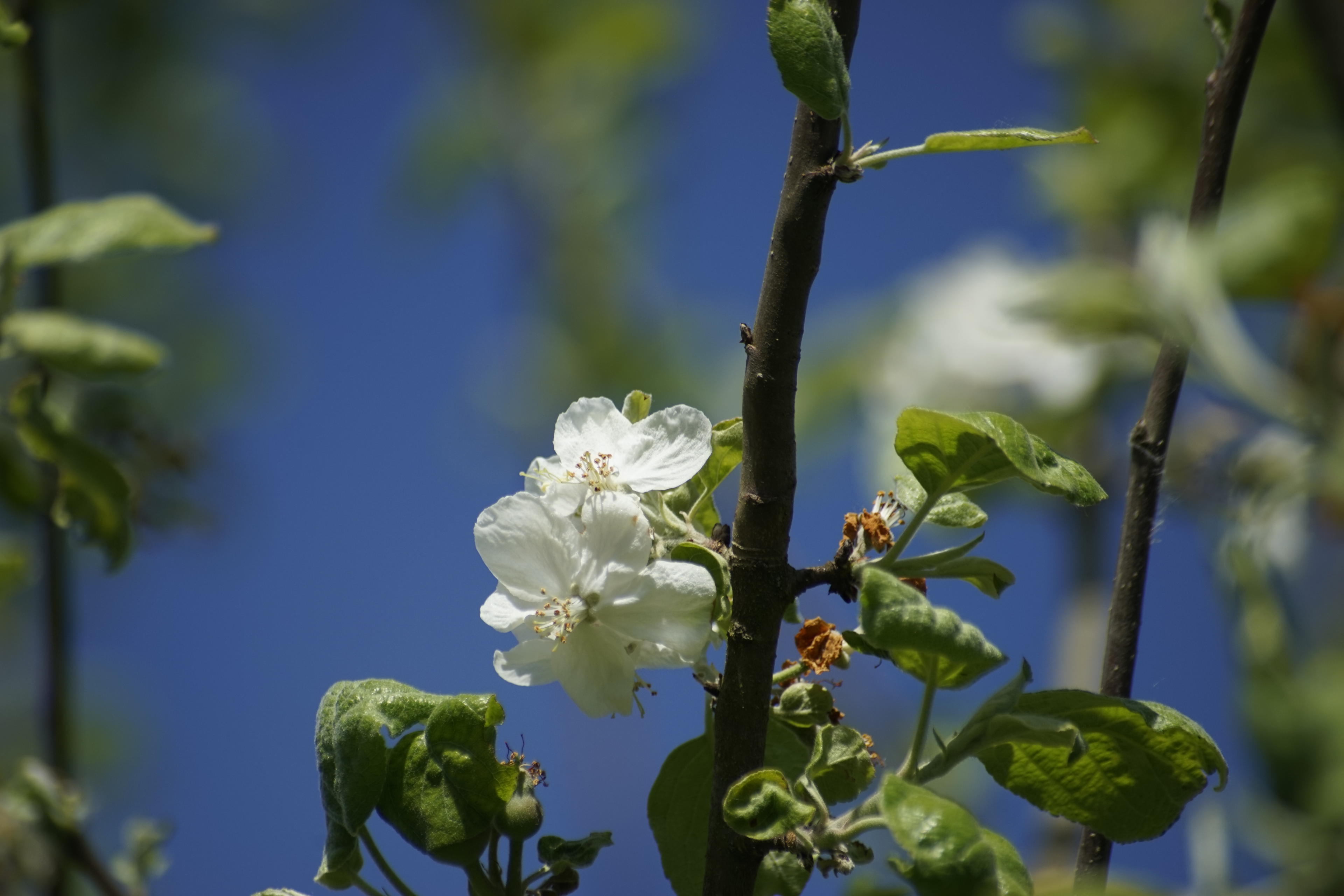Die letzten Apfelblüten sind auch noch zu sehen, während schon die ersten kleinen Knoten zu sehen sind, wo demnächst Äpfel wachsen werden.