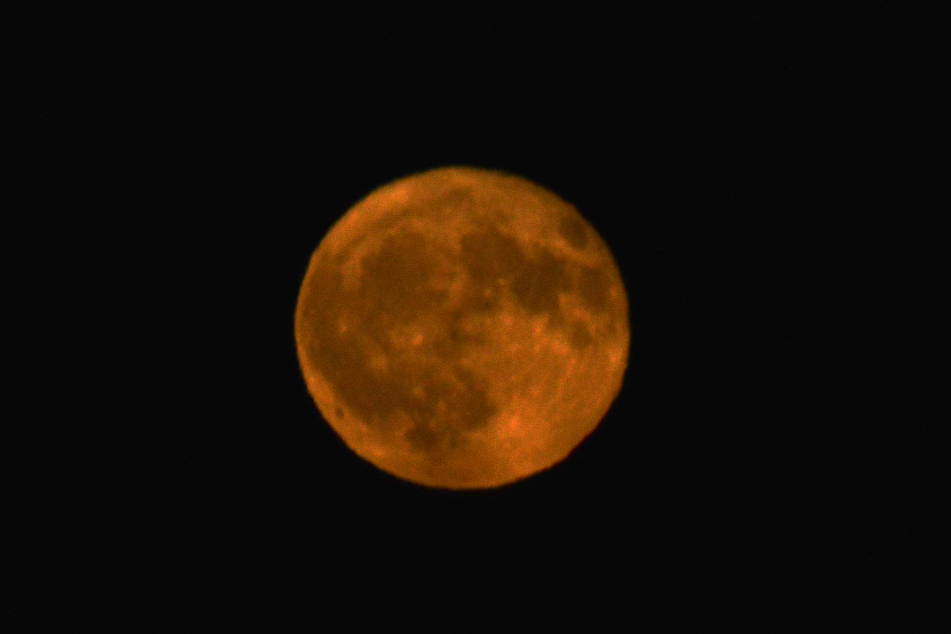 Hier jedenfalls ein paar Bilder von unserem Erdtrabanten, der besonders niedrig über dem Horizont vorbei gedüst ist, sodass er entsprechend rot und verflimmert ist. Die Farbe ist nicht ganz originalgetreu. Damit der überhaupt rot wurde, habe ich den Weißabgleich auf Tageslicht gestellt und dann noch ein bisschen an der Kurve gedreht, um das Ganze aufzuhellen. Gibt aber insgesamt einen guten Eindruck davon wieder, was ich durch den Sucher gesehen habe. Wie gesagt, alles etwas unscharf, weil die Atmosphäre gerade wetterbedingt turbulent ist (ist recht windig da draußen) und weil das Licht bei dem Winkel besonders lang durch gebraucht hat.