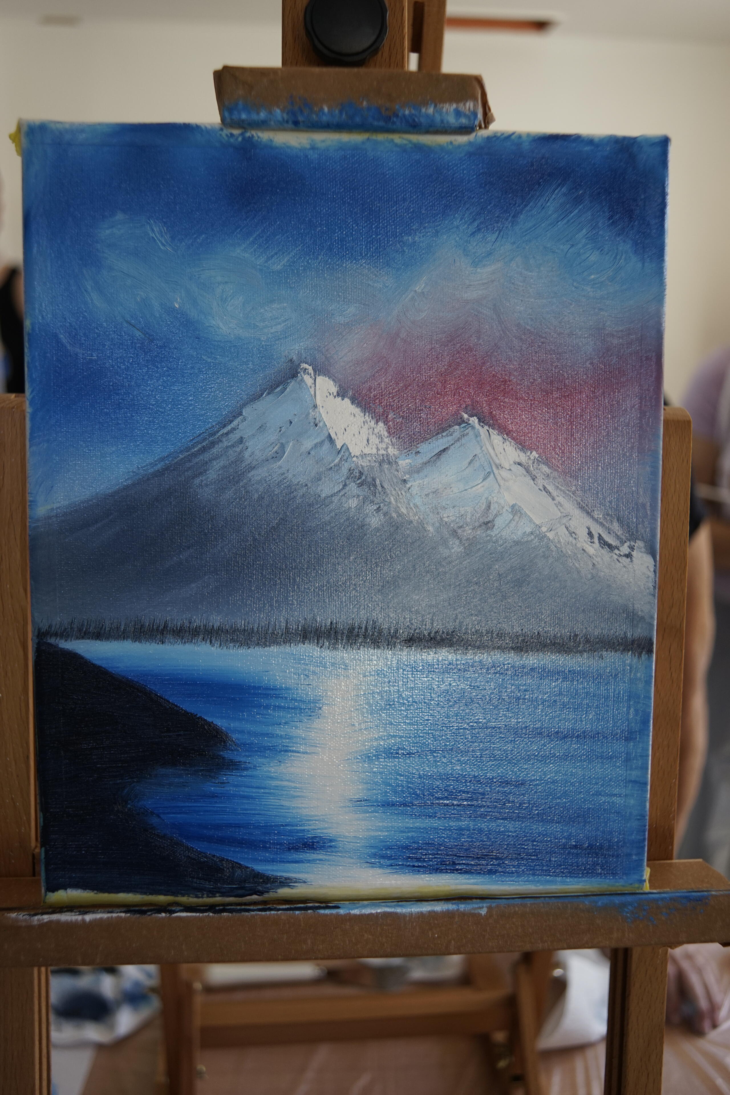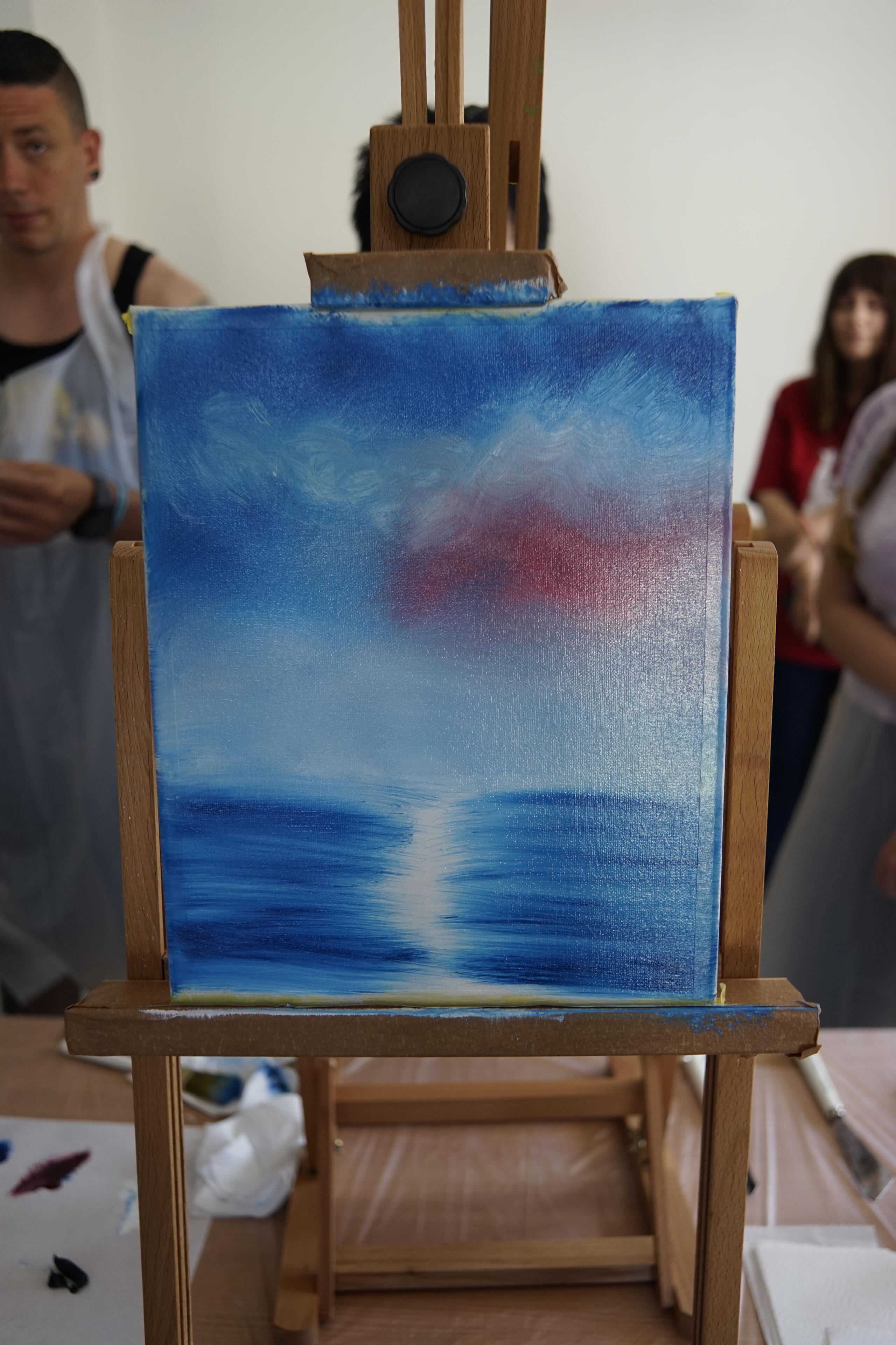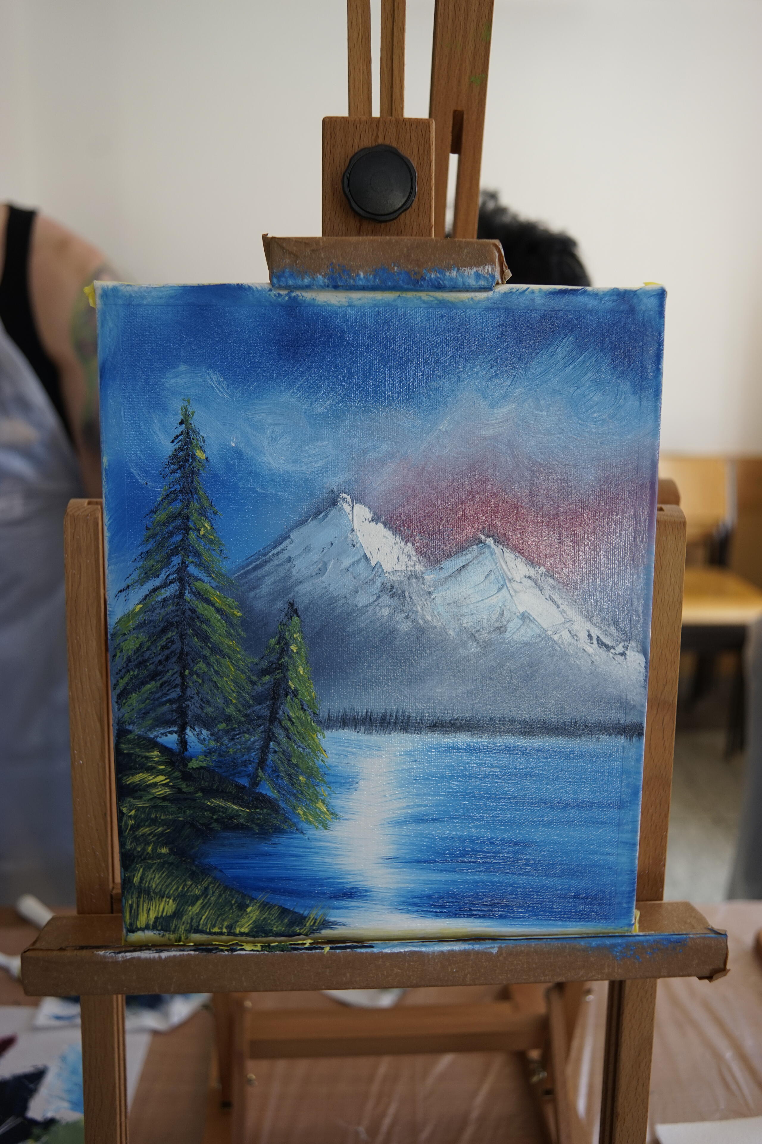 Wie man sieht, braucht man nicht viel: Eine grundierte Pappe und ein paar Ölfarben. Das wars dann auch schon mehr oder weniger. Von da an hat sie uns nur ein bisschen gezeigt, wie man den Pinsel halten muss oder den Spachtel ansetzen, wie man nachher ein bisschen wischt, et voila: Ein Bild entsteht. Echt spannend! Vor allem, weil wir alle das gleiche gezeigt bekommen haben und am Ende doch so viele, individuell unterschiedliche Bilder dabei raus kamen: Spitze Berge, flache Berge, mehr so Tanne oder eher Lärche, drohende Gewitterwolken oder leichter Cirrus. Sehr spannend!