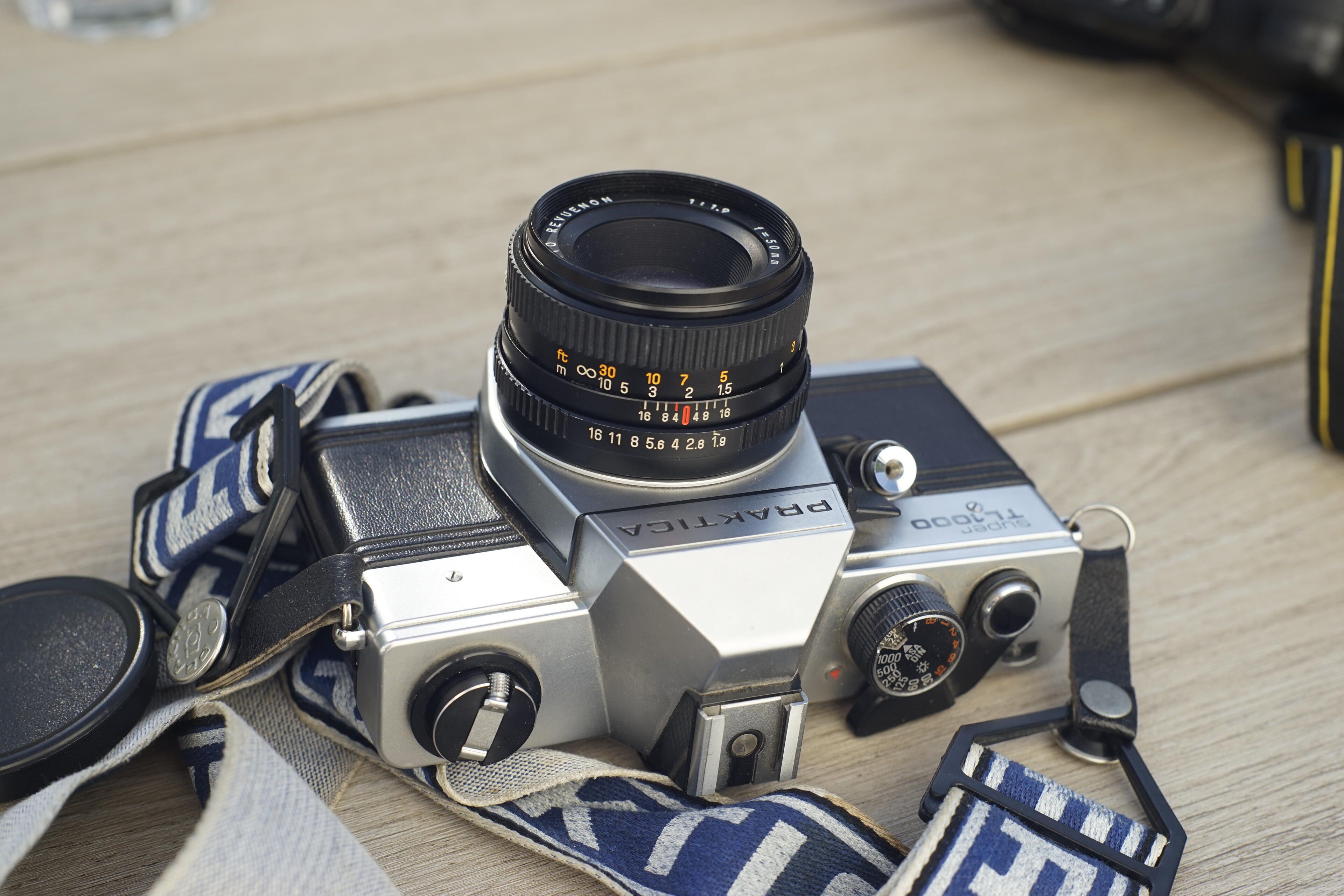 Da ich ja alte Kameras sammle und das bei allen mittlerweile angekommen ist, hat U mir eine Praktica Super TL1000 mitgebracht, die sie irgendwie über das Fratzenbuch für umme bekommen hatte. Die sollte ich ja eigentlich schon im Frühjahr mit nehmen, als wir in Kassel waren, aber ich hatte es vergessen und sie auch. Am Freitag konnte ich sie mir dann endlich mal genauer anschauen. Eine sehr solide Wahl für eine Kamera aus den späten 1970ern. Technisch damals vielleicht schon nicht mehr ganz auf der Höhe der Zeit mit dem alternden M42-Anschluss (mit Unterstützung für den Auto-Pin), aber von der Verarbeitung her scheinbar unverwüstlich: Der Auslöser schnackt und surrt wie gewollt, das Gehäuse sieht gut aus, obwohl es wohl mal einen etwas heftigeren Sturz hinter sich bringen musste (die eine Kante zeigt Impaktspuren mit Brucherscheinungen). Das schlimmste ist die praktisch nicht mehr vorhandene Lichtdichtung auf der Scharnierseite der Tür, aber das ist ja normal. Rundrum ist sie ansonsten mit einem schwarz getränkten Faden versiegelt, das passt und geht wahrscheinlich niemals kaputt.