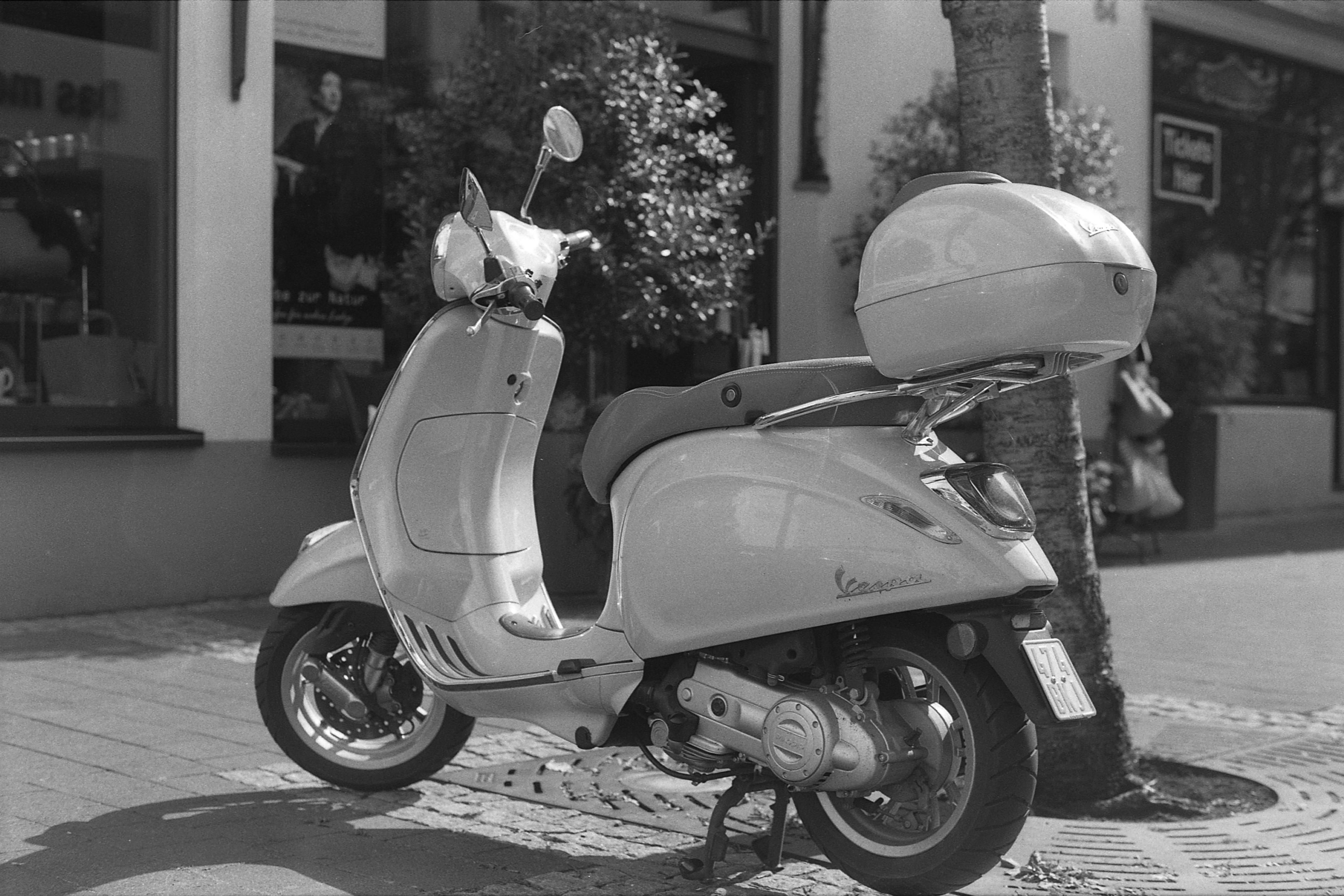 Vespas wurden erfunden, damit ich die fotografieren kann, scheinbar. (55mm, 1/150s, f/4.) In der Stadt sind mehr Schatten und die Belichtung muss nicht ganz so exzessiv sein. Das gute Stück macht macht sich so recht gut vor den leicht unscharfen Schaufenstern. Gefällt mir. Das war dann übrigens, wie man sehen kann, schon in Bonn selber.