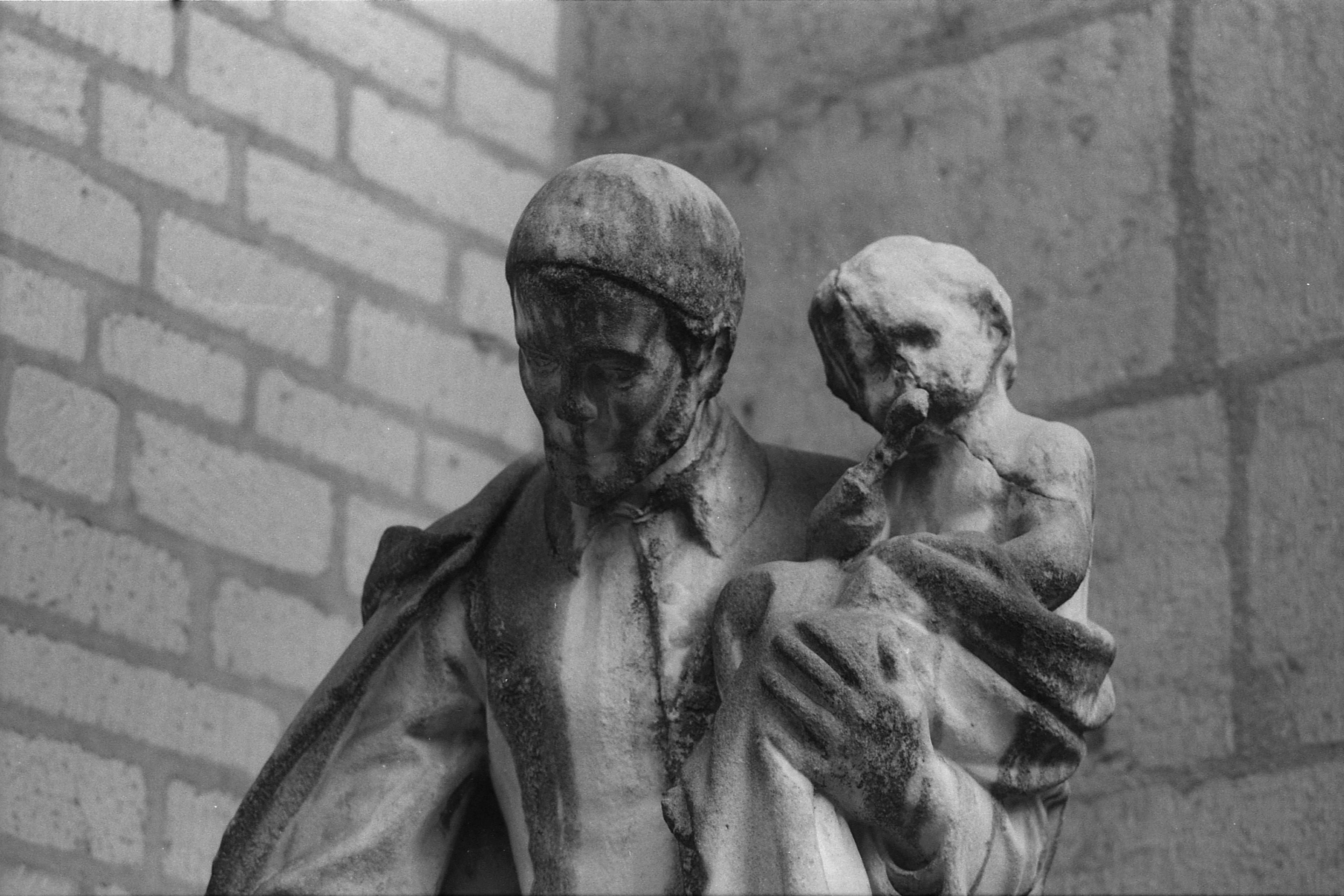 Auf dem Rückweg nach Beuel zum Auto wiedermal durch die enge Gasse an der Dingsbums-Kirche geschlichen, wo ich den in Stein gehauenen kirchlichen Amts- Slash Kinderträger mitgenommen habe. (100mm, 1/180s, f/4.) Was ist mit dem Blag eigentlich passiert, dass es diesen Riss quer durch den Kopf hat? Nuckelt das eigentlich am Finger? Fragen über Fragen!