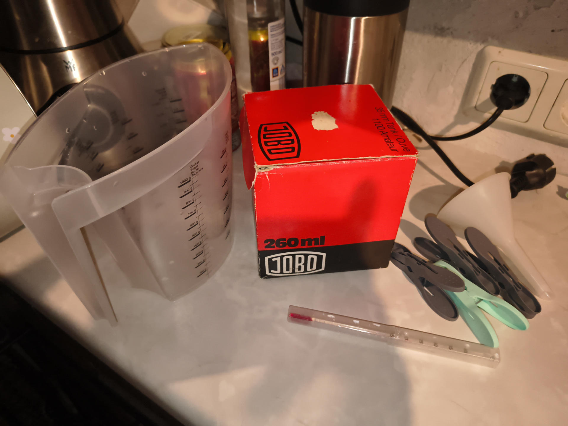 Jedenfalls, bevor ich den Film mit dem Entwickler bekannt gemacht habe, hatte ich natürlich erst mal ein wenig in einen der Messbecher abgefüllt und darin den Schnippsel vom Leader getestet, der ja eh immer abgeschnitten werden muss, um den Film richtig in die Spule zu kriegen. Der war nach 7 Minuten schon gut durch geschwärzt, was eigentlich ein Hinweis hätte sein sollen, dass ich doch nicht so sehr (auf 8 Min.) hätte verlängern sollen. Aber da war das Zeugs ja auch noch in der Abkühlphase nach meiner leichten Überhitzung!