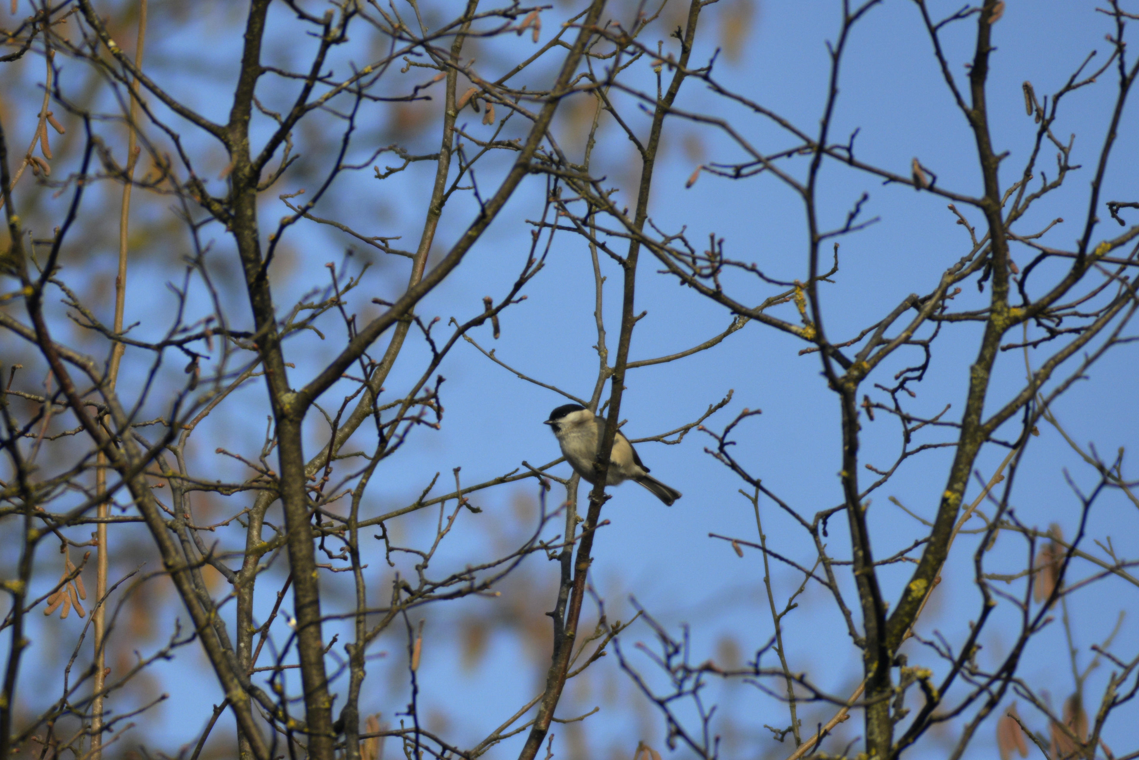 Zurück zu den Fotos: Hier sehen wir (wahrscheinlich) eine Sumpfmeise. (Ich kenn mich nicht aus. Grüße an Finchen, die hat das in ihrem Vogelbuch nachgeschaut.) Ist aber auch eigentlich egal, wie das Tier heißt, Hauptsache Vögelchen! (Kann auch eine Weidenmeise sein. Da wir hier viele Weiden entlang des feuchten Hanfbachs haben und ich mal davon ausgehe, dass bei beiden Vögeln der Name Programm ist,... hilft das auch nicht weiter, kann beides sein.) Aber man kann sehr gut erkennen, dass mit dem Sigma sogar aus der Mitte das Bildes noch hervorragend Crops gemacht werden können. Das ist jetzt sozusagen 1:1, nur eben auf Web-Größe runter komprimiert, was ein paar Artefakte hauptsächlich im Farbverlauf des Hintergrunds produziert hat. Aber der Vogel ist ausreichend scharf. Und niedlich! Glück gehabt: Auf dem nächsten Bild ist er schon aufgesprungen und aus dem Fokus geflogen!