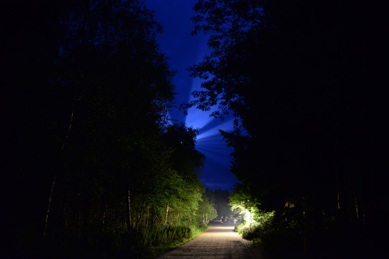 Wenn man dann noch ein Bisschen näher dran geht, kann man auch noch die beleuchtete Auffahrt durch den Wald mit auf das Bild bekommen. Oder auch nur die Spitze: