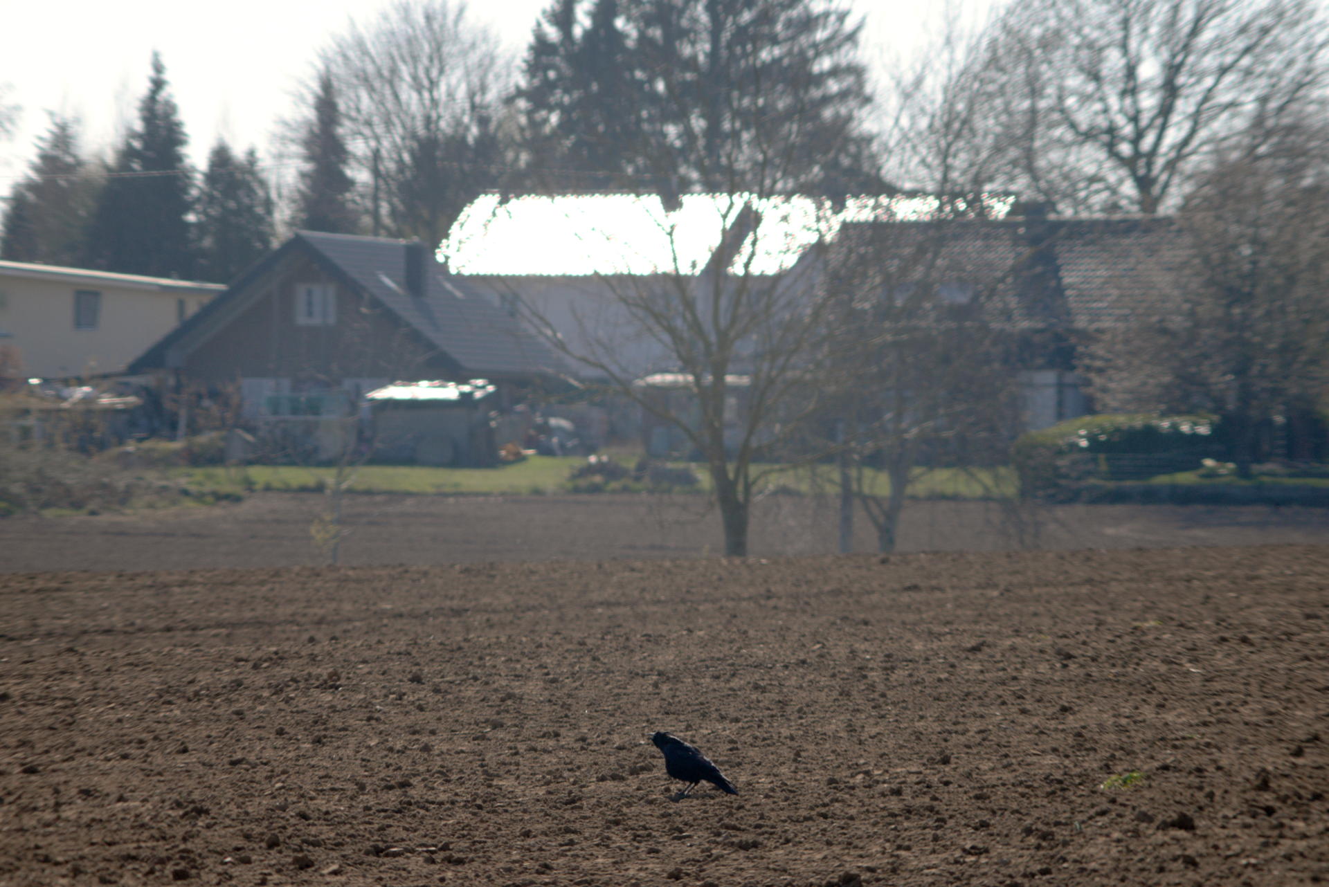 Ein paar hundert Meter weiter gab es dann Krähen zu sehen. Die saßen fein auf dem frisch gepflügten Acker und jagten leckere Wasweißiche. Fressen Krähen Würmer? Wenn sie sie kriegen, wahrscheinlich. Die haben mich ganz genau beobachtet, während ich die ganze Zeit drauf gehalten habe.