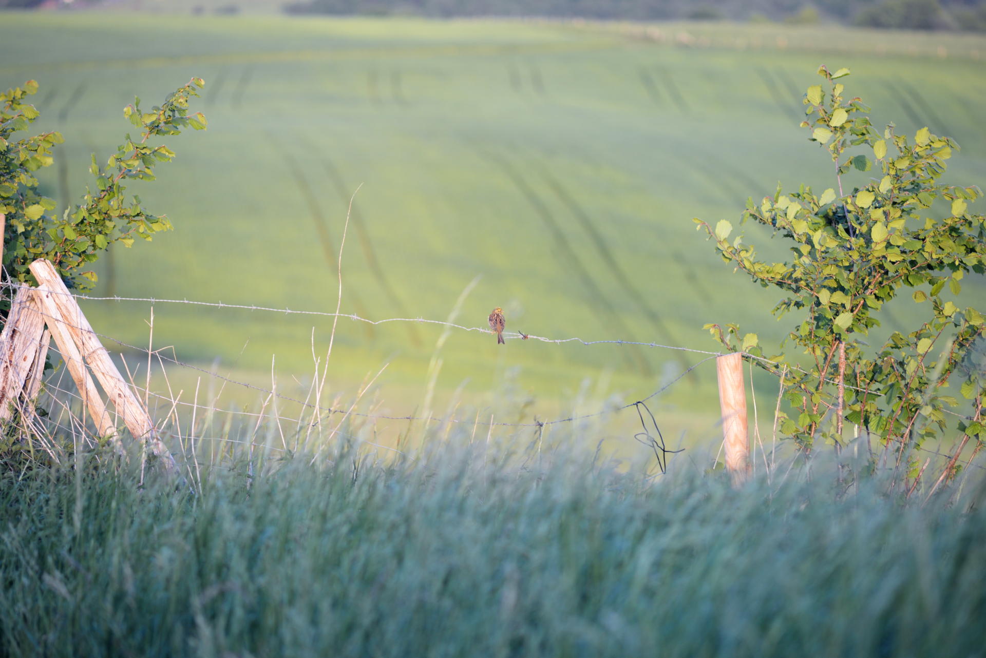 Auf dem Weg zurück zur Straße, also auf dem Feldweg den Berg runter, habe ich das kleine Vögelchen auf dem Stacheldraht zuerst gar nicht gesehen. Und es ist nicht abgehauen, als ich das Objektiv gewechselt habe, das hat mich am allermeisten erstaunt. Jetzt nur noch wissen, was es ist? Die Goldammer? Ich glaube, aber ich bin ja bekanntermaßen schlecht mit Namen, auch mit denen von Tier und Pflanze.