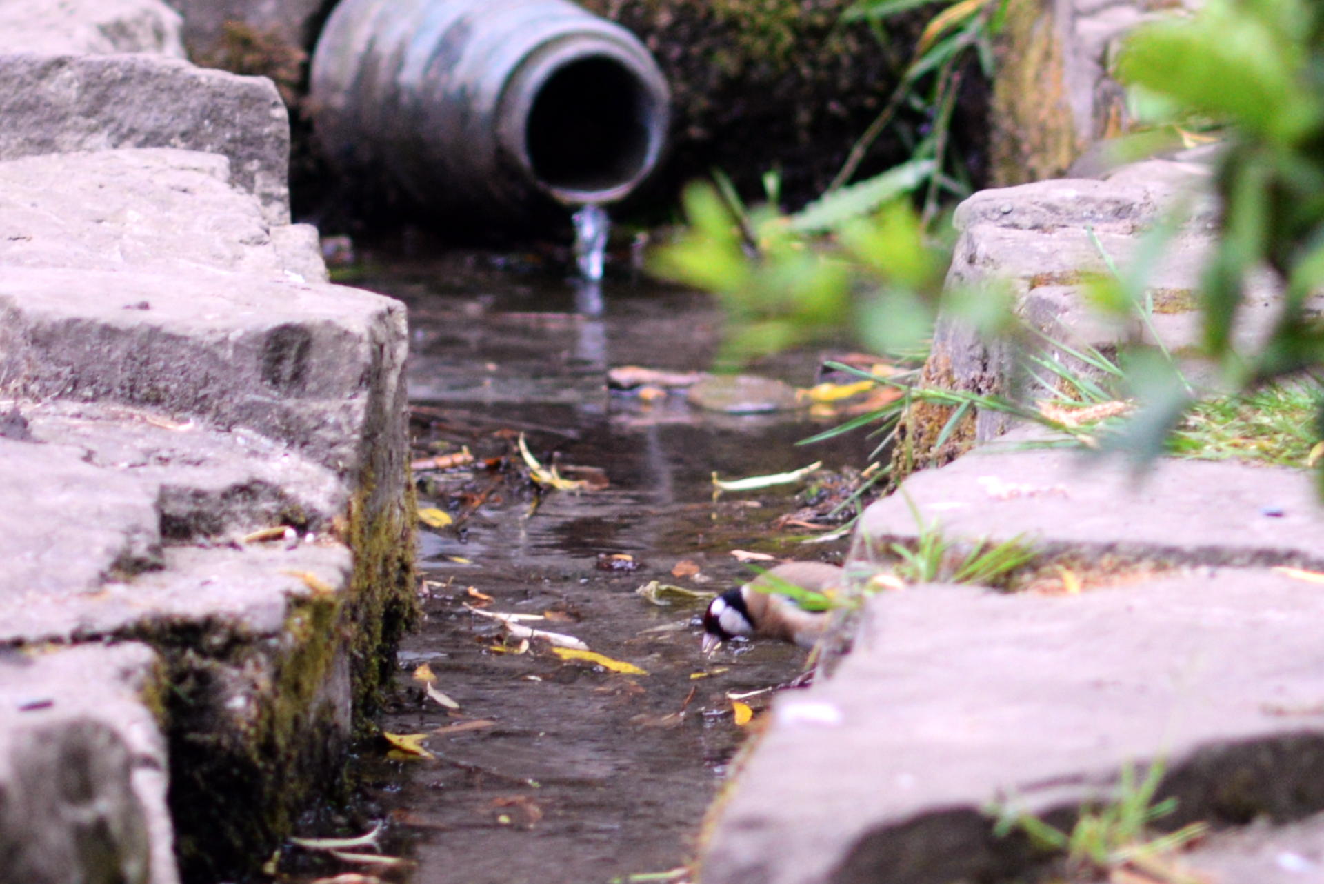 Nach der Kohlmeise dann noch einen etwas exotischeren Vogel gesehen, nämlich einen Stieglitz. Der kam an den kleinen Wasserlauf geflattert, der den Teich speist, und hat erst mal einen kräftigen Schluck genommen. Leider kann man den gelber Streifen auf den Flügeln praktisch gar nicht erkennen.