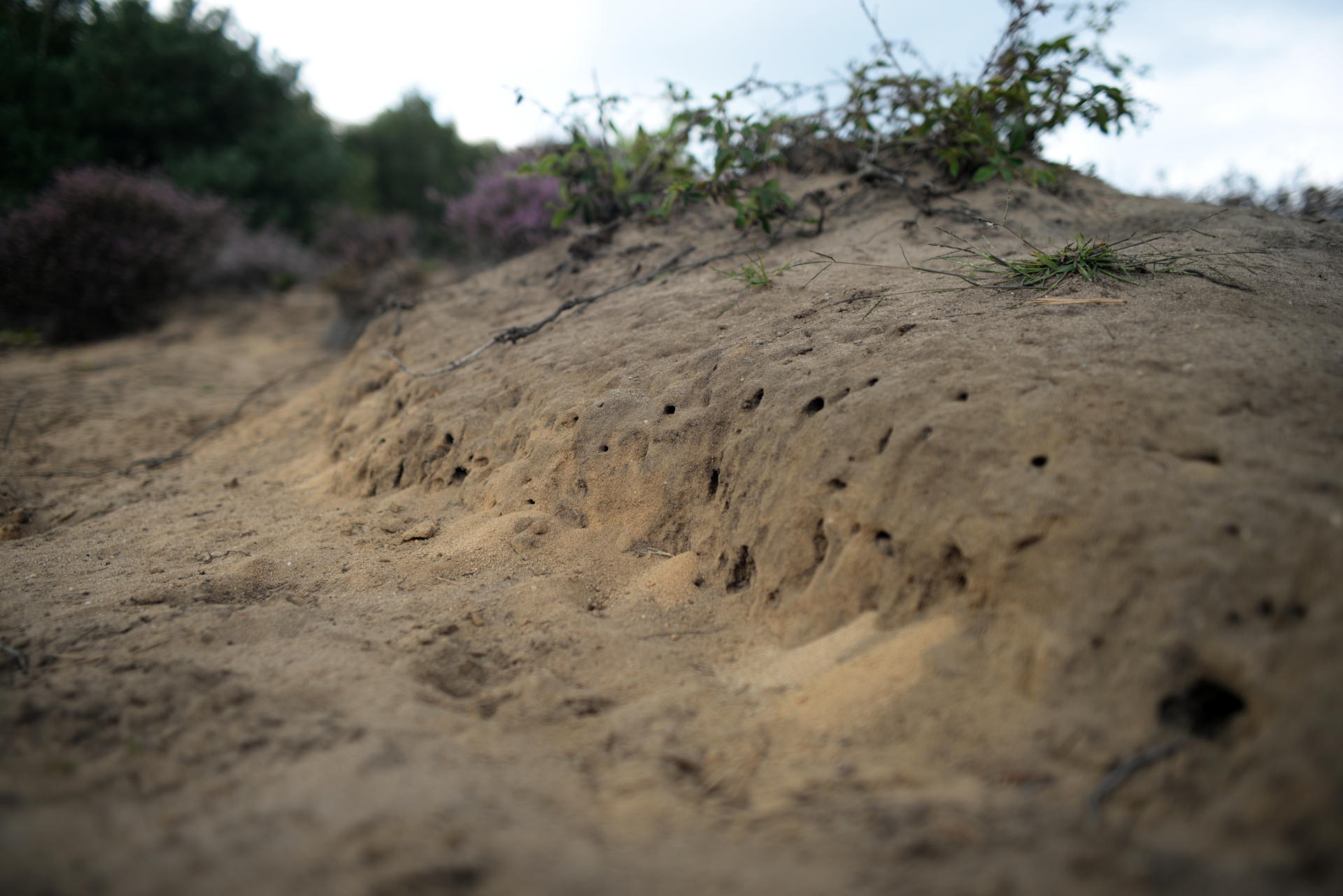Im Sand fanden sich auch diverse Pfotenabdrücke, wahrscheinlich von den Hundekackebeutelbefüllrn. Neben all den Reheabdrücken fielen die schon auf. Frage mich nur, was für große Viecher solche großen Pfotenabdrücke hinterlassen. Dänische Dogge? Oder streift der Wolf jetzt schon durch die Wahner Heide. Ob das auch der Wolf, der hier Hügelchen buddelt? Man weiß es nicht...