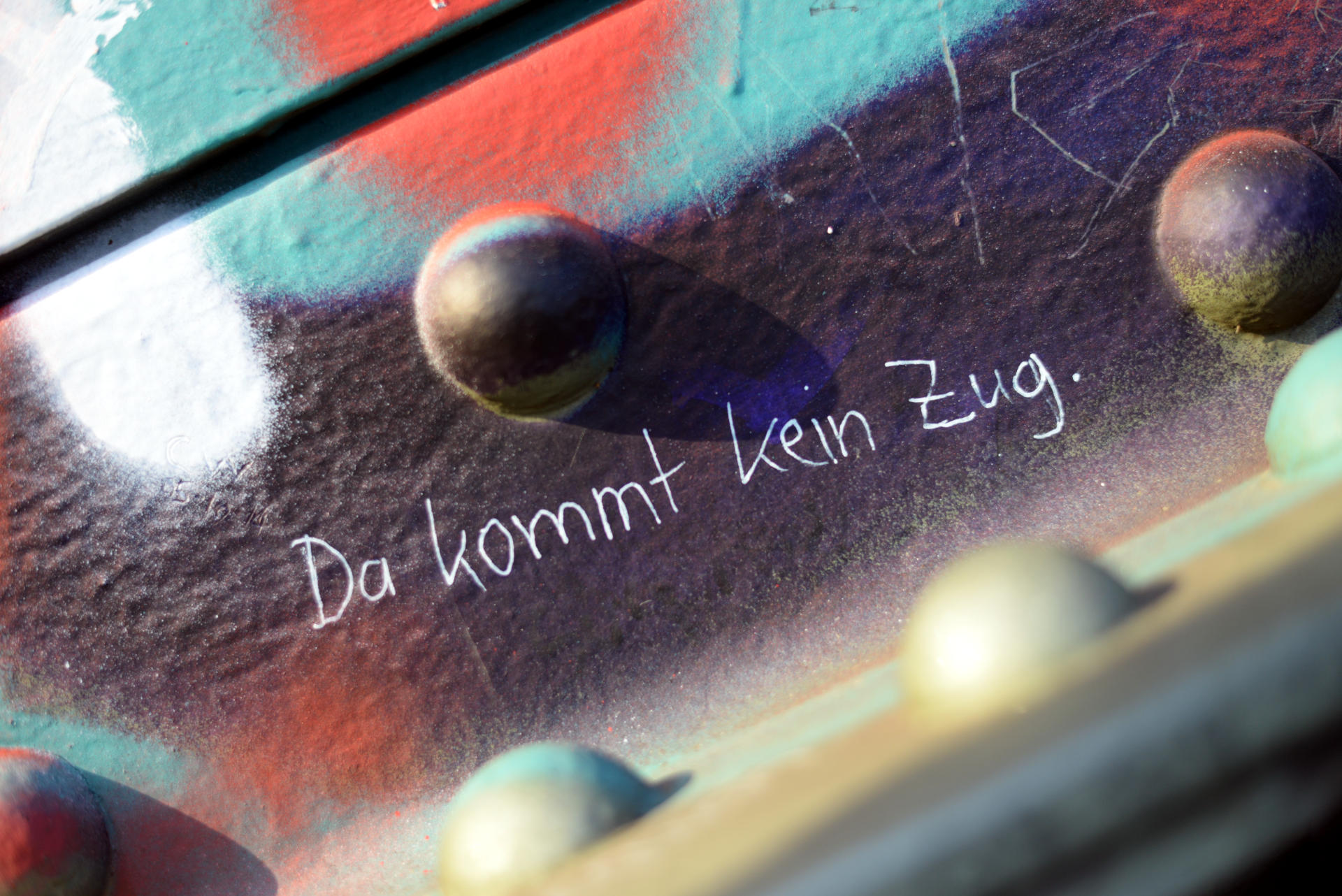 Dazu gehören auch diese drei bunten Bilder mit Nachrichten an die Nachwelt. Völlig zufällig ausgesuchte Beispiele dessen, was einen hier oben so erwartet. Ich könnte ja stundenlang solche Details suchen und fotografieren. Aber stundenlang hatten wir nun wirklich keine Zeit.