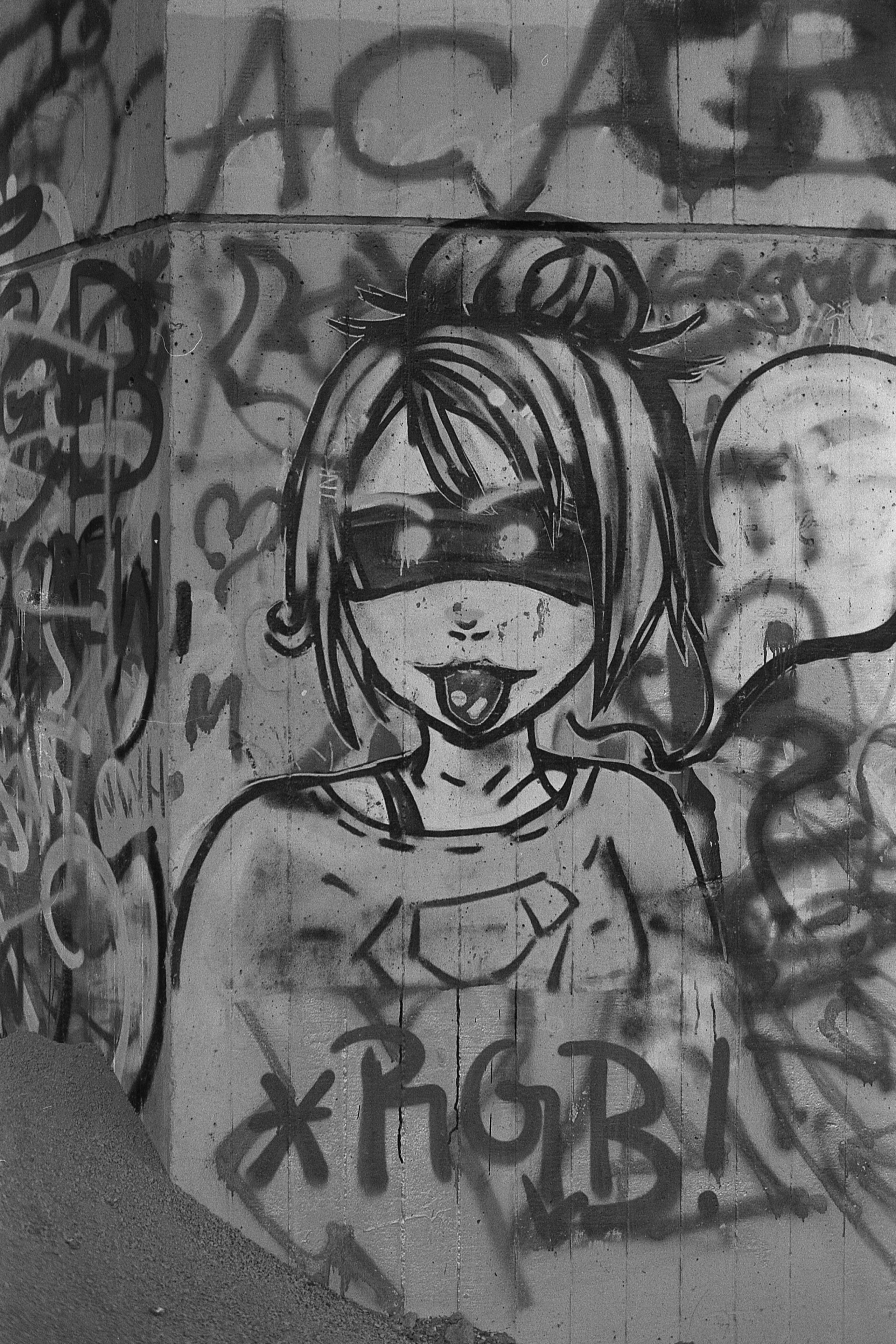 Um wieder auf die Brücke und somit zurück zum Auto zu gelagen, sind wir unter selbiger Brücke durch geschlichen, was ganz gut ging, und da fand ich noch das ein oder andere interessante Graffiti. (1/90s, f/2,8.) Maskierte Mädchen, die einem die Zunge raus strecken: Wer kann da nein sagen?