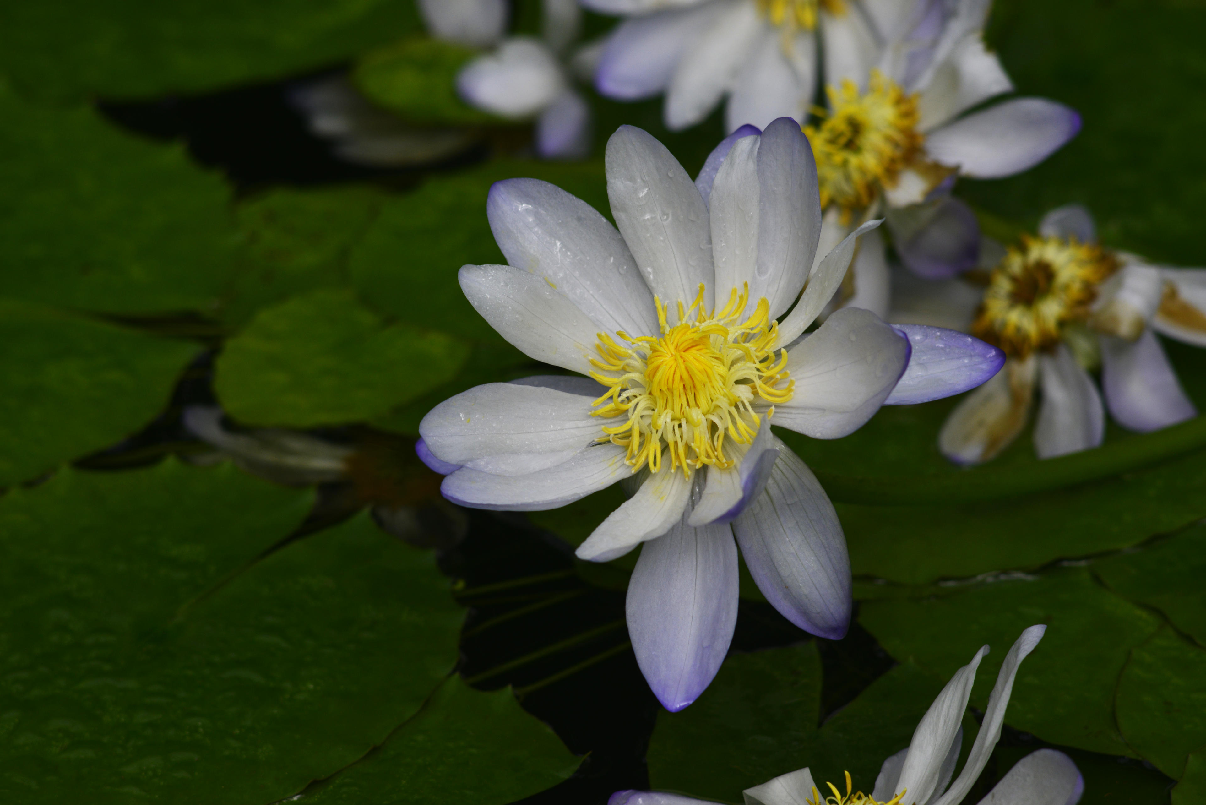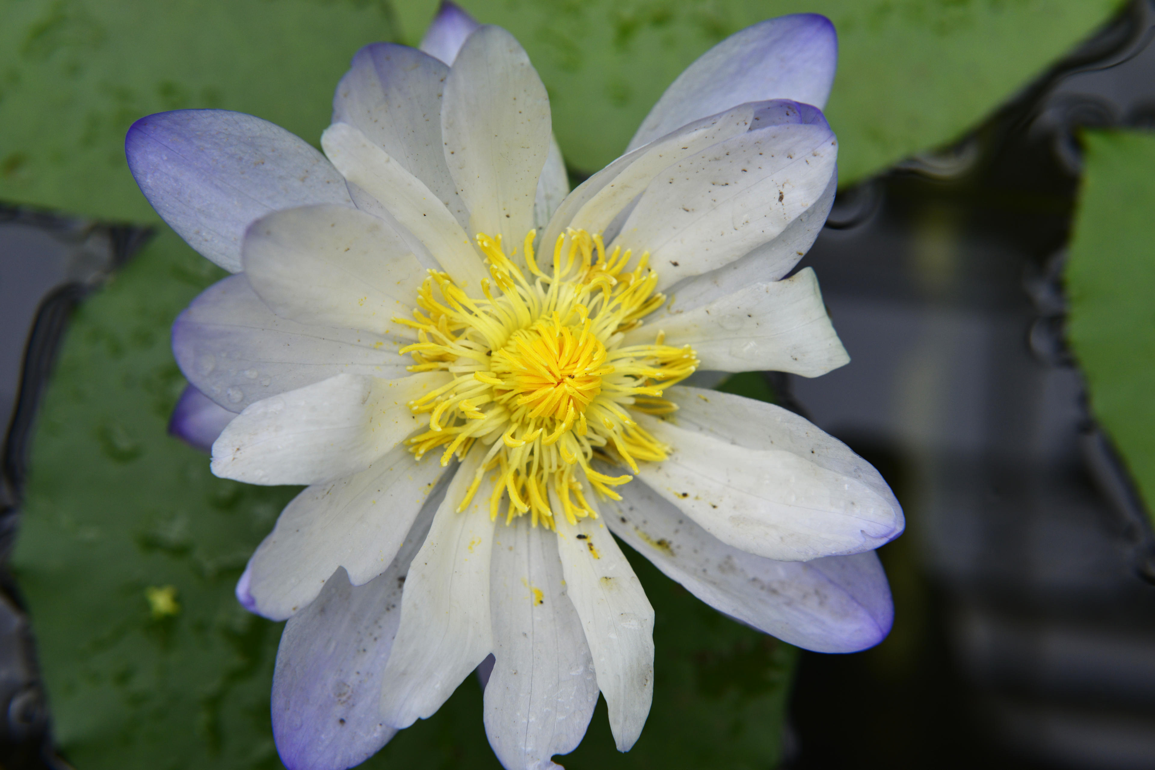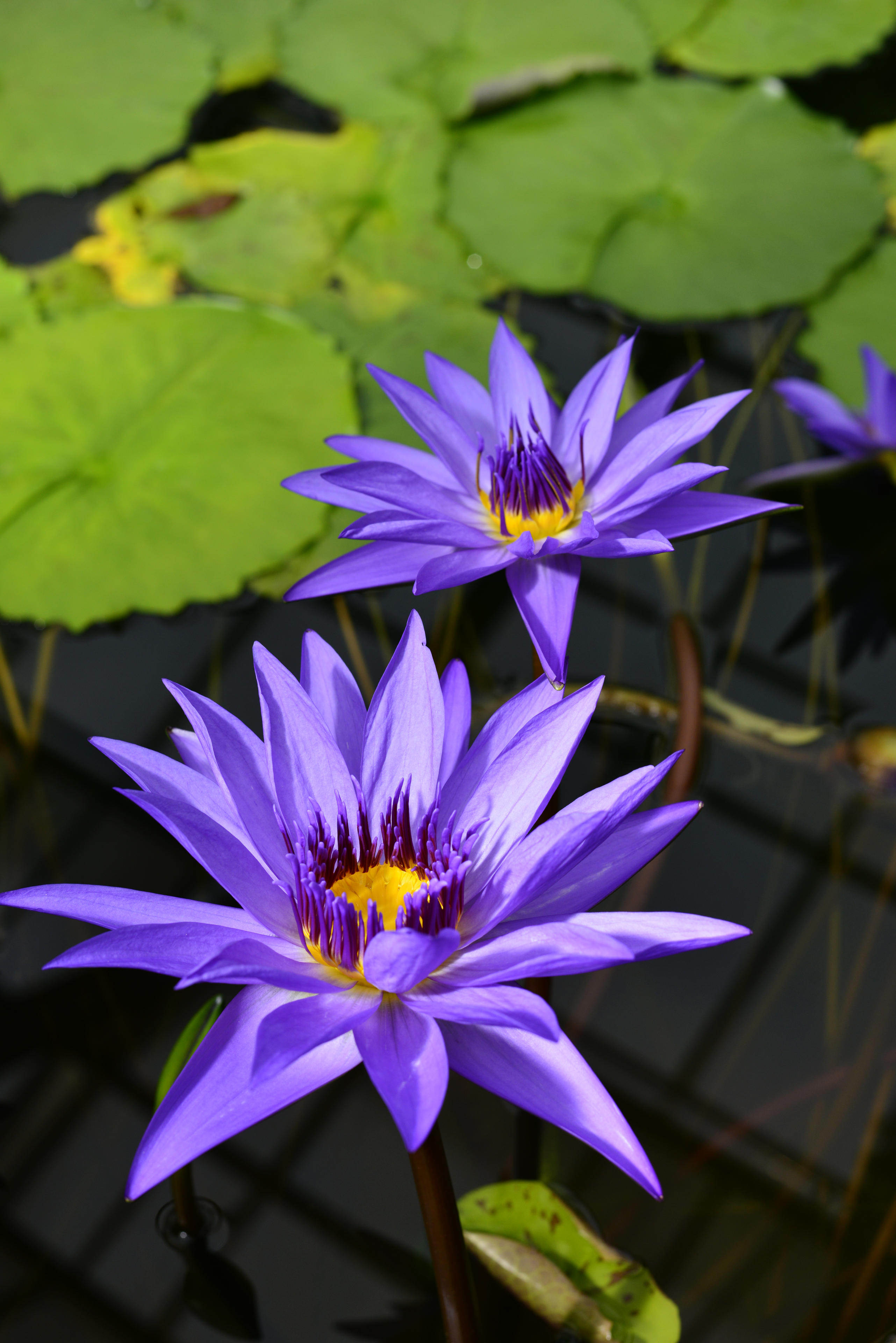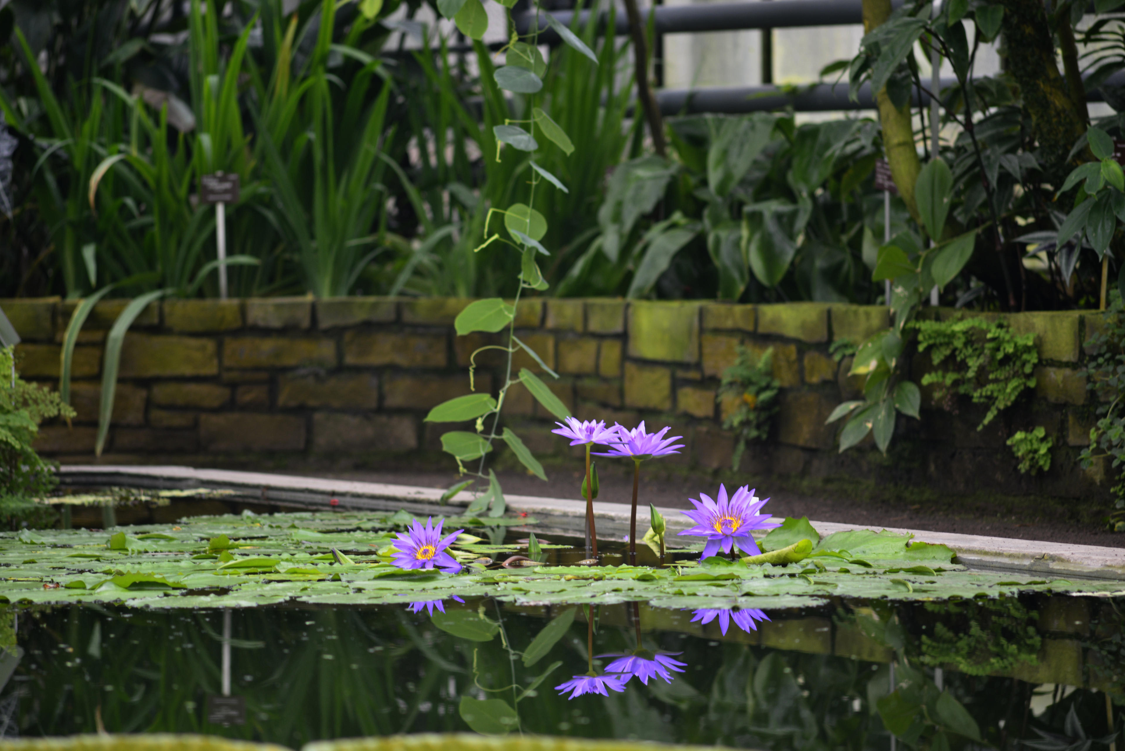 Die Seerosen hingegen ziehen immer eine spektakuäre Schau ab. Diese Exemplare hier haben schon eine bestechende Farbgebung. Diese fast schon ins Lila tendierende Blau und die krass gelben Staubblätter dazu, das macht schon was her. Die weiter auf dem künstlichen Teich schwimmenden habe ich mit dem 200mm recht gut ran holen können. Sehr hübsche Gewächse, von denen ich gut verstehen kann, dass sie sich jemand auf seinen repräsentativen Teich geholt hat.