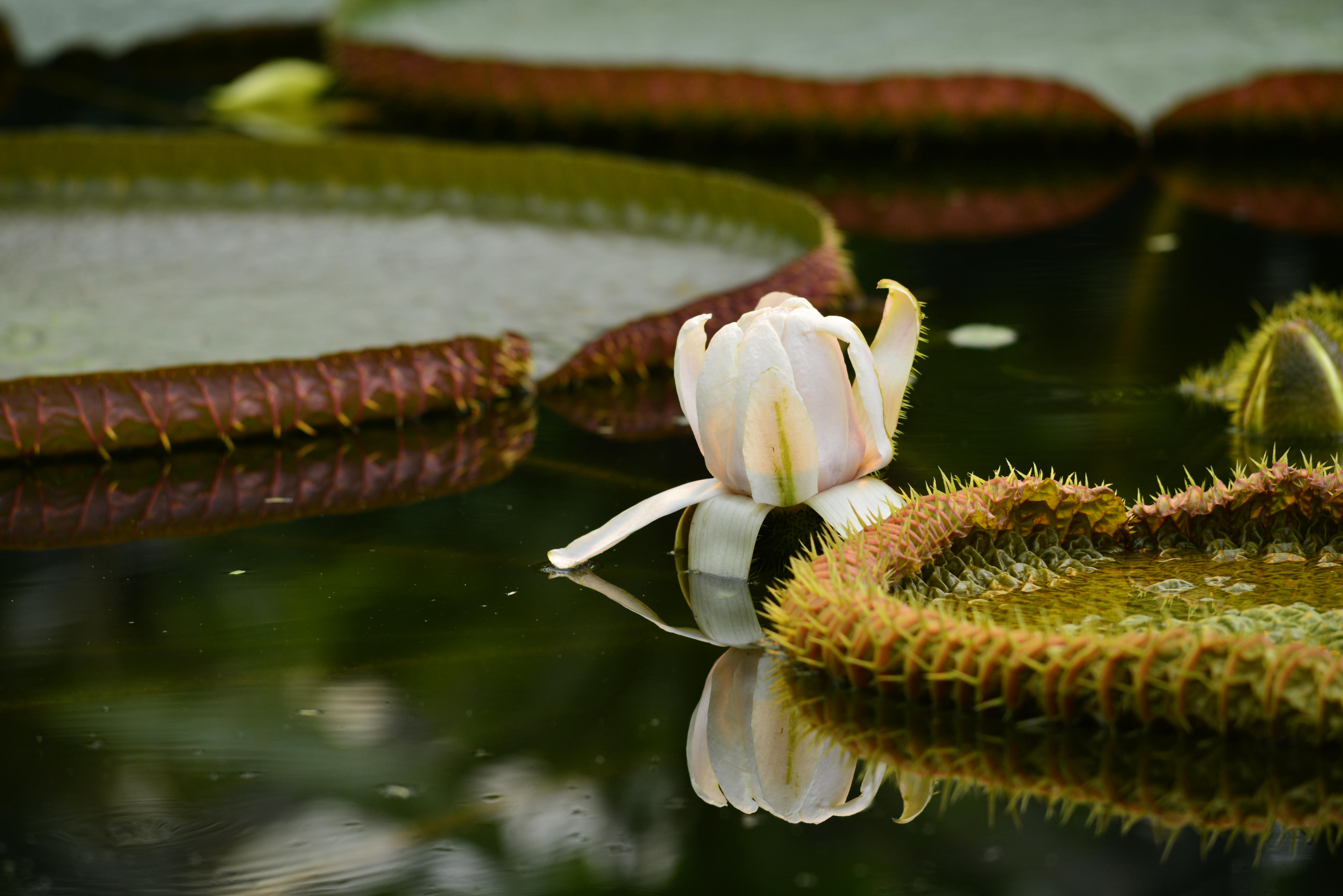 Die Kollegen von der anderen Spezies sind aber auch nicht viel schlechter. Von der Farbgebung ählich, aber kräftiger und die Blüten scheinen mir als Laien auch einen ganz anderen Bau zu haben. Und dann war da noch diese ein einzelne weiße, die wohl zu den riesigen Blättern gehörte, die da auch dem Wasser schwammen. Jedenfalls sehen diese Anhängsel an den Blättern sehr ähnlich aus. Aber, ich wiederhole es gerne noch mal: Ich habe keine Ahnung von Botanik. Ich bin froh, wenn ich die einheimischen Blumen auseinander halten kann.
