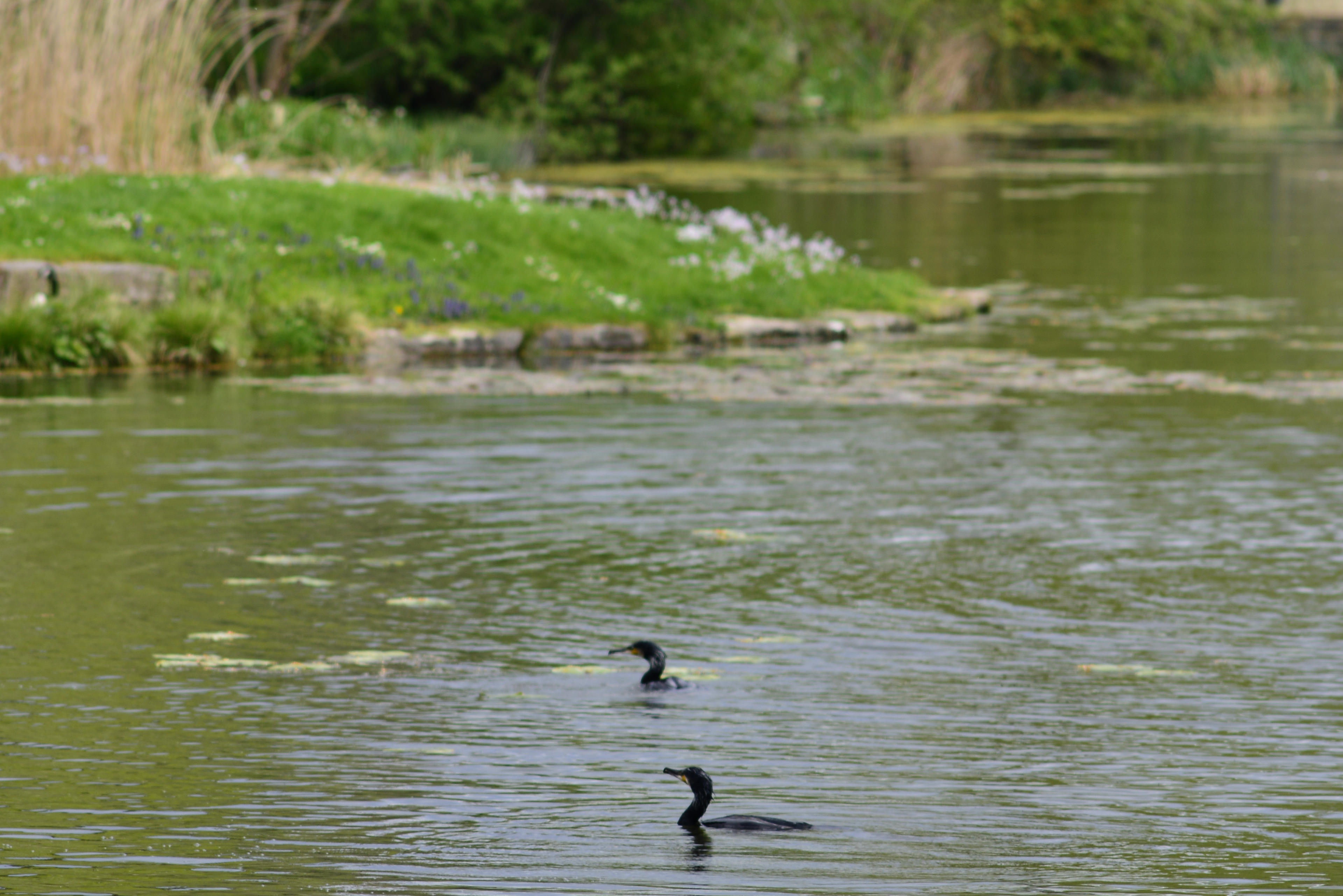 Auf dem See in der "Mitte" des Areals fand ich dann noch zwei Kormorane, die fleißig auf Fischjagd waren - und auch tatsächlich welche gefangen haben! Solche Kaventsmänner! Das ging leider so schnell, dass ich davon keine Bilder habe. Aber immerhin saß dann nachher einer der beiden am Ufer und ließ sich die Sonne ins Gefieder scheinen. Besser als Fön, "ich kann nicht leben ohne dieses Gerät"!