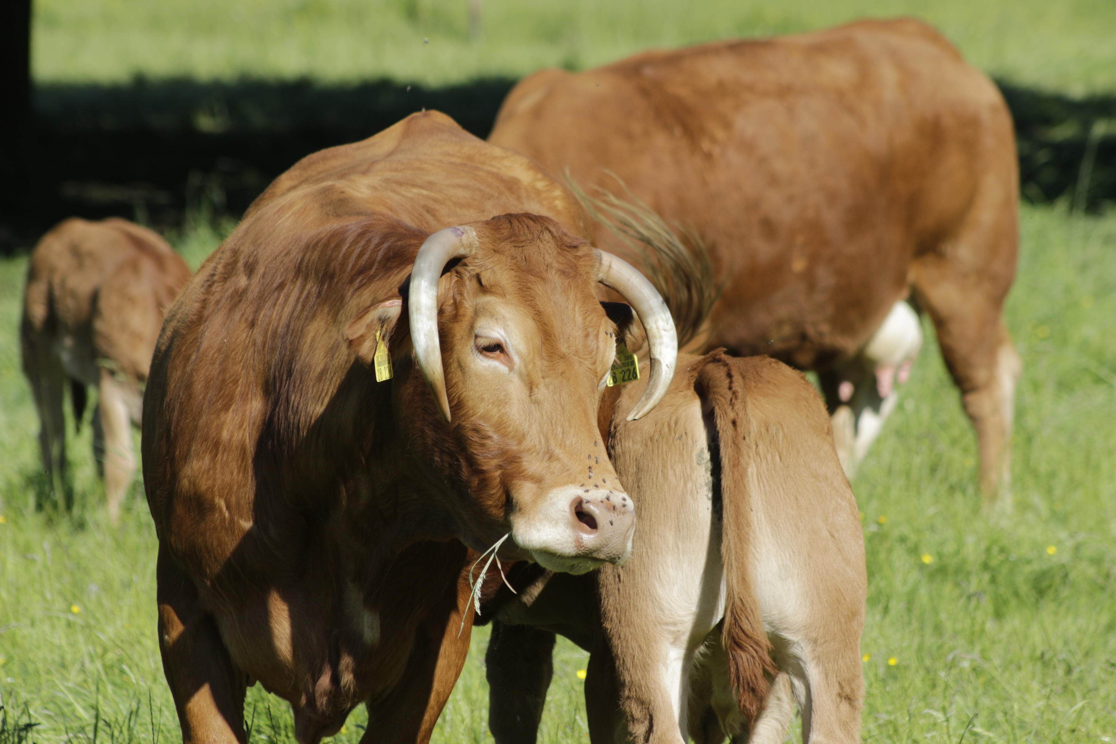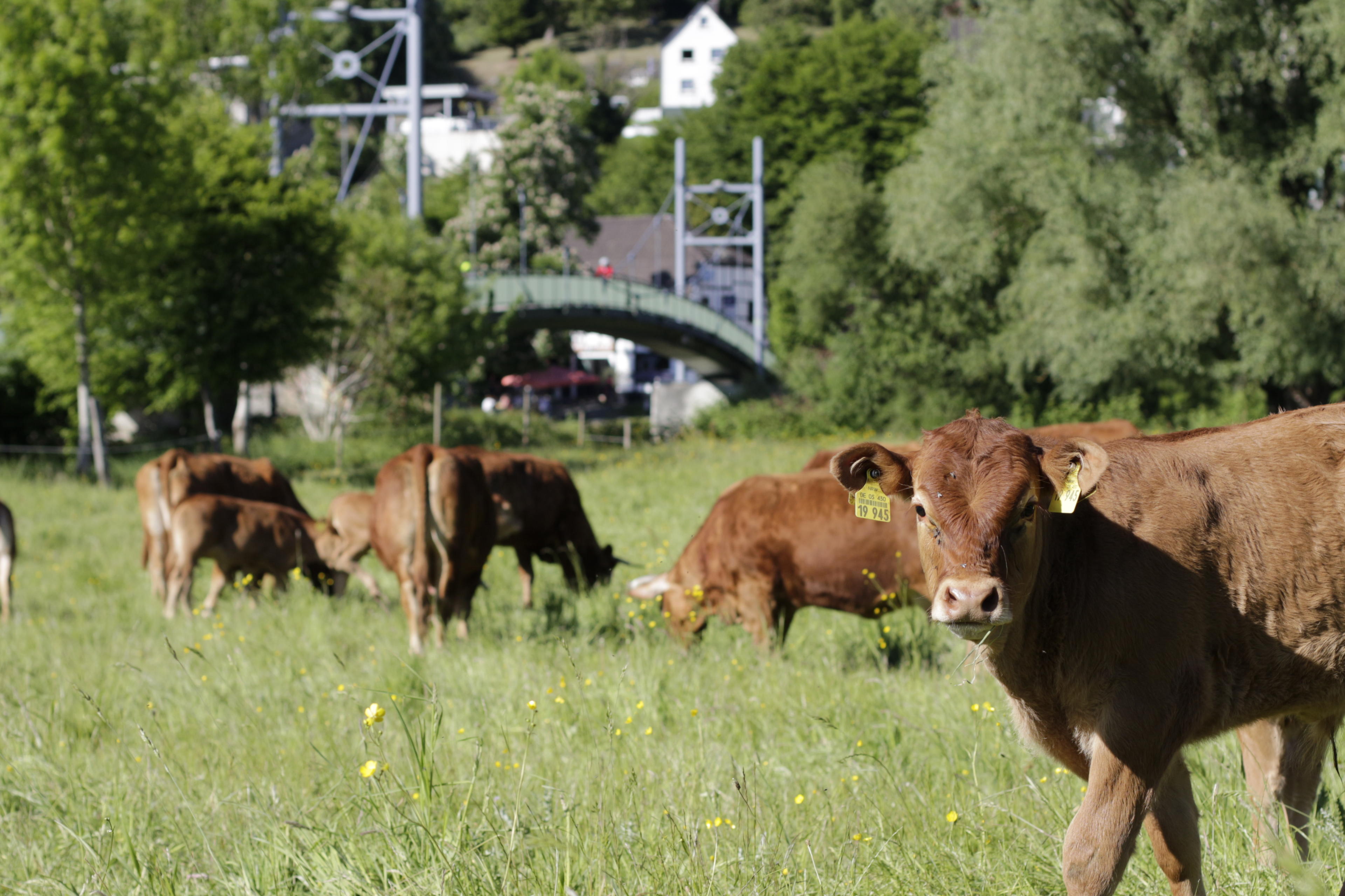Irgendwie haben wir es dann aber doch noch bis zur Brücke an der Sieglinde geschafft. Da sich hier ein ganze Herde von Mutterkühen mit ihren Kälbern direkt am Weg versammelt hatten, habe ich einfach mal drauf gehalten und dementsprechend einen riesigen Haufen Kuhfotos mit nach Hause gebracht. Die fasse ich jetzt mal ein bisschen mehr zusammen, weil, was soll ich da schon groß zu sagen: Sind Kühe. Ich könnte jedoch schwören, dass uns der Typ, der uns da entgegen kam und wieder diesen alten Witz mit den Kakao-Kühen von sich gegeben hat, schon mal an dieser Stelle begegnet ist. Vor allem, weil das eindeutig Viecher für Fleischzucht sind. Aber schon schön, dass die Kälber hier nicht direkt von ihren Müttern getrennt werden und sogar einfach so säugen dürfen. Beste Bioqualität! Lecker! Jetzt so'n kleinen Jungbullen! :-D (Jaja, ich bin wieder fies, aber so ist das nun mal. Die stehen da nicht rum, damit ich sie fotografieren kann, sondern damit der Bauer vielleicht wenigstens einen kleinen Gewinn macht und nicht wieder einer Pleite geht.)