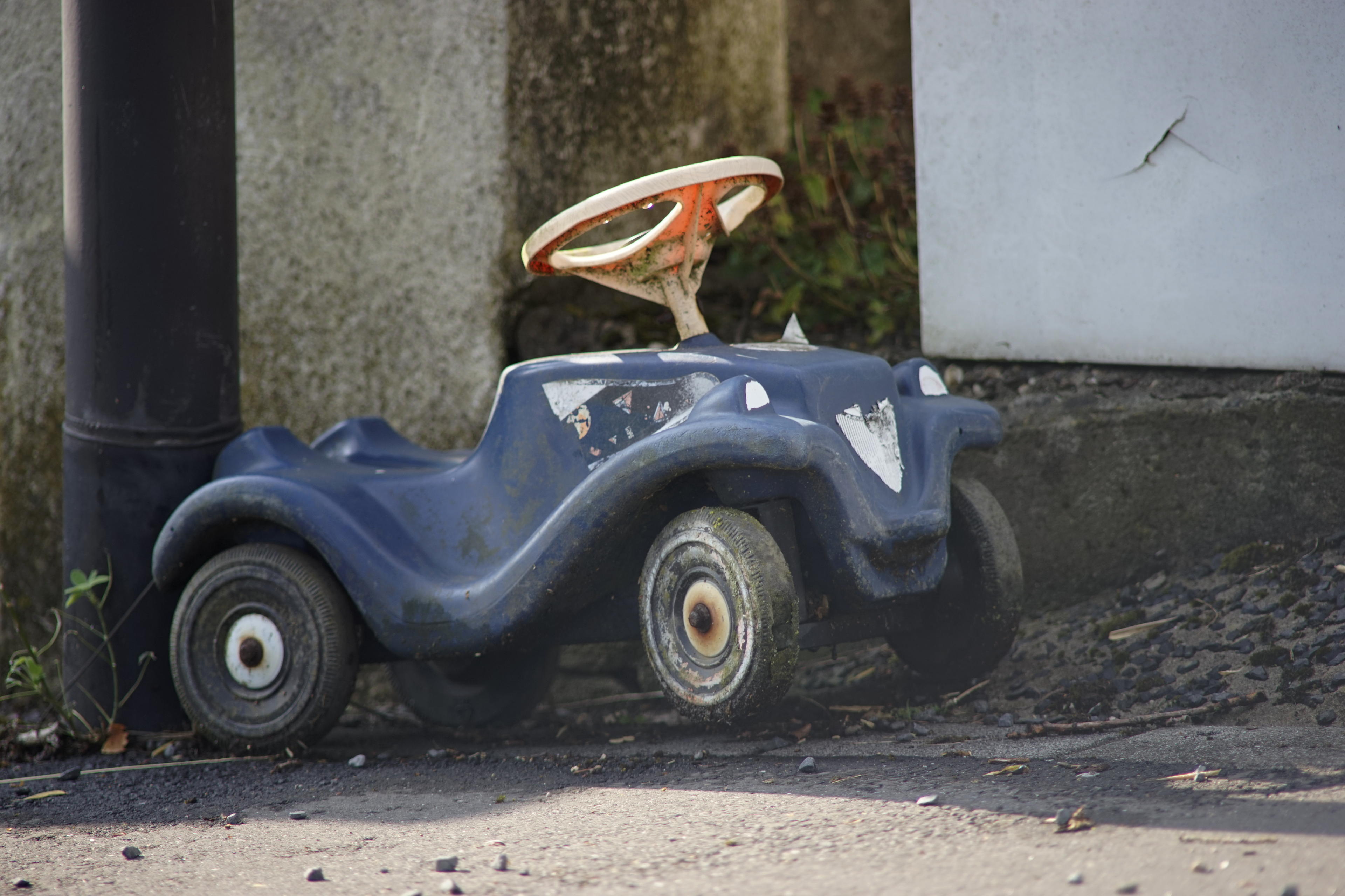 Bin jedenfalls den Berg hoch, den üblichen, den hinterm Haus. Und habe unterwegs so einiges vor die Linse genommen, was bekannt sein sollte. So etwa das Bobby-Car. Und wenn man es schafft, die Fokusebene richtig zu platzieren, bekommt man auch im Gegenlicht und bei Schattenwurf ganz gute Bilder hin. Wie ich in den beiden oben verlinkten Artikeln schon erwähnt habe, gehe ich bei solchem billigen Altglas grundsätzlich nicht davon aus, dass man damit moderne Fotos machen kann. Aber dafür schafft man sich das ja auch nicht an, sondern eben für die Quirks, die diese alten Linsen haben. Und weil man es hinterher geworfen bekommt für 'n Appel und 'n Ei!
