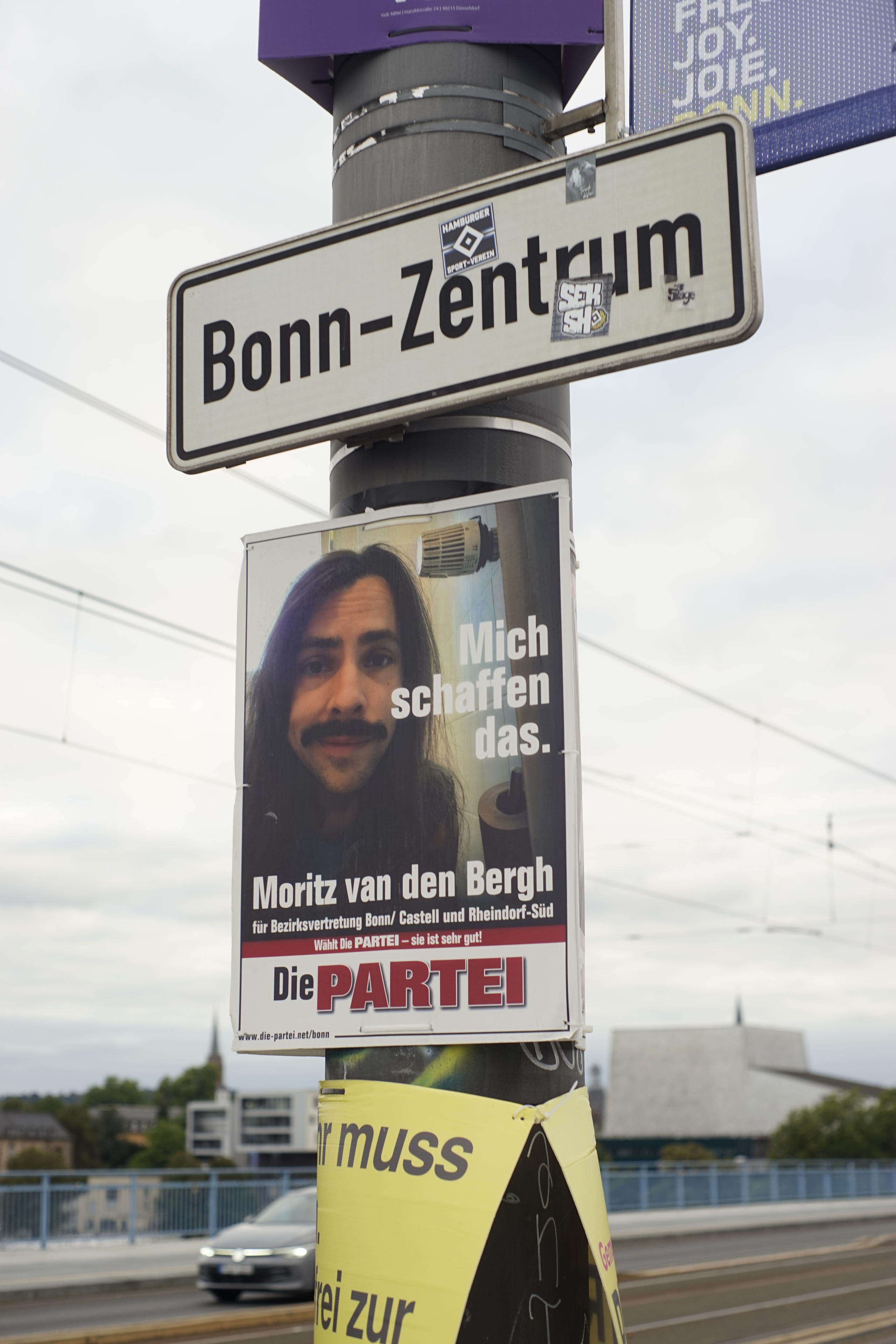 Unter der Brücke in Beuel war Konzert. Erstaunlich, dass die so einen Lärm machen können und keiner beschwert sich. Und das in Bonn, wo Skaterparks auf der Abschussliste stehen! ("Können die Blagen nicht bekifft in der Ecke liegen, dann sind sie wenigstens leise", oder wie? Ich versteh' die Leute nicht. Aber das ist ja nichts Neues.) Oben auf der Brücke habe ich die witzigeren Wahlplakate mitgenommen. Da ist die Auswahl ja eher gering, weswegen es sich hauptsächlich um die einer bestimmten PARTEI handelt. Sowas hängt bei uns auf'm Land ja eher nicht rum, weil. Müssen wir mal eine Ortsgruppe gründen.)