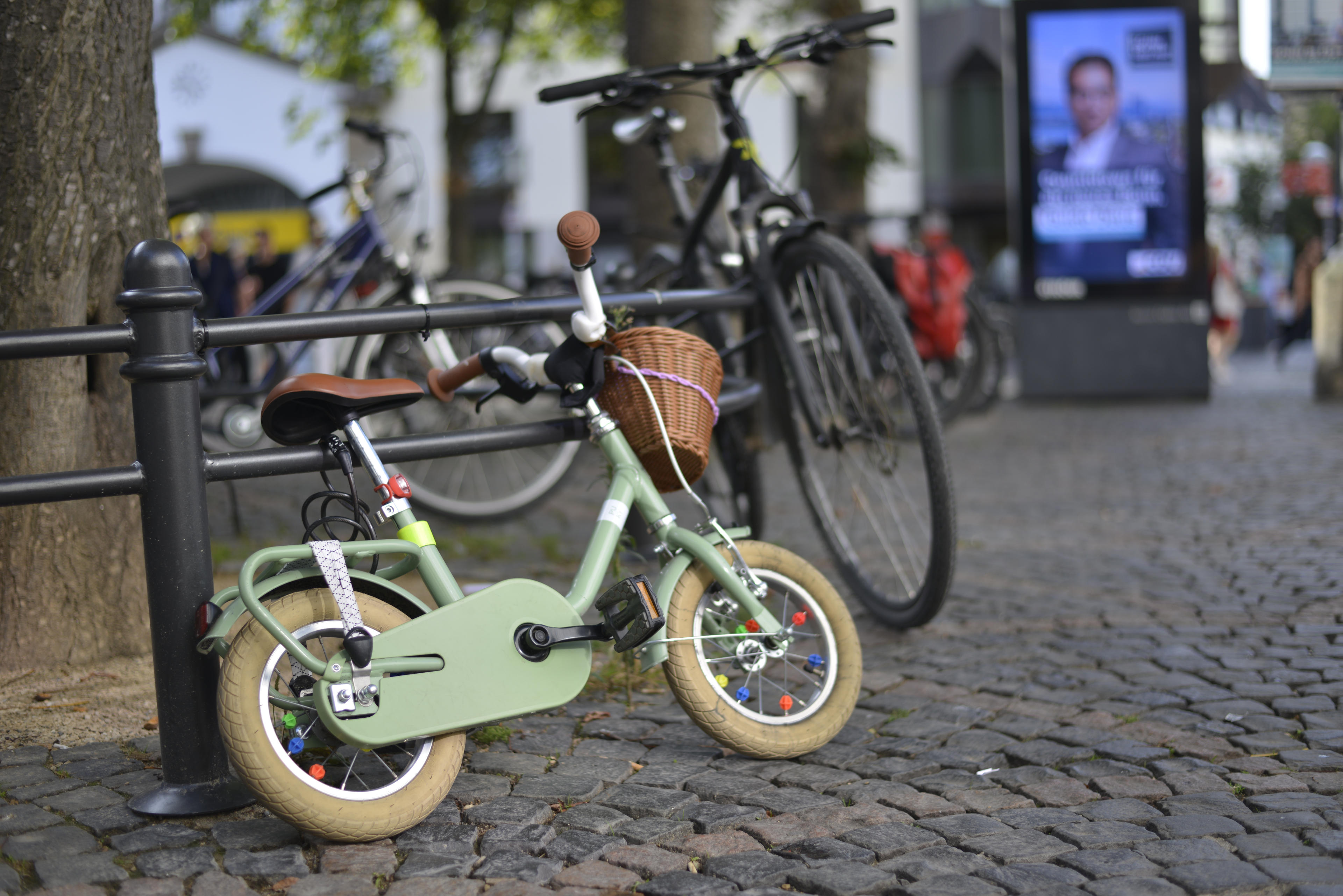 Trotz der doch recht voluminösen Größe der D800, mit dem Griff zusätzlich unten drunter vor allem, ist sie mit so einem kleinen 50er doch recht unauffällig, stelle ich immer wieder fest. Weshalb auch der Mickey-Maus-Ballonist nicht gemerkt haben sollte, dass ich seinen Popo fotografiert habe. Also, eigentlich habe ich dieses schnullerartige Gebammsel an seinem Arm ins Visier genommen. Das War auf dem Rathausplatz, auf dem wir aber nicht allzu viel Zeit verbracht haben, weil da die Wahlveranstaltung der CDU abging, die ich jetzt nur mäßig interessant fand. Stattdessen weiter zum Münster, wo die DLRG und andere Vereine so eine Art Sommerfest hatten. An die anderen kann ich mich nicht richtig erinnern, denn die waren praktisch in dem Moment fertig, als wir da aufgetaucht sind. Das Ordnungsamt ist wohl sehr streng, wenn die ihre Zeiten überschreiten. Da stand auch das Kinderfahrrad rum, das mich miondestens so magisch angezogen hat wie die Vespas oben!