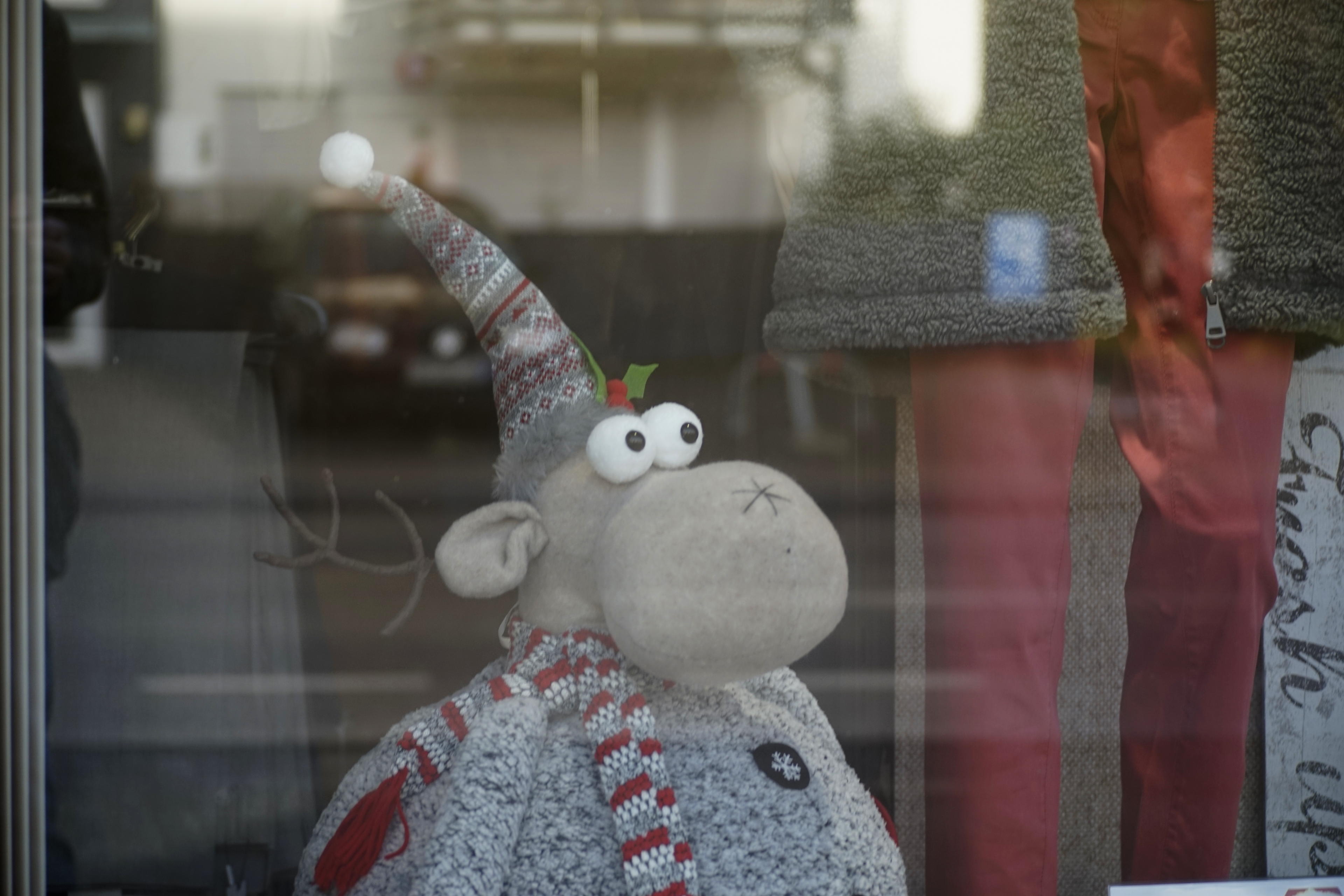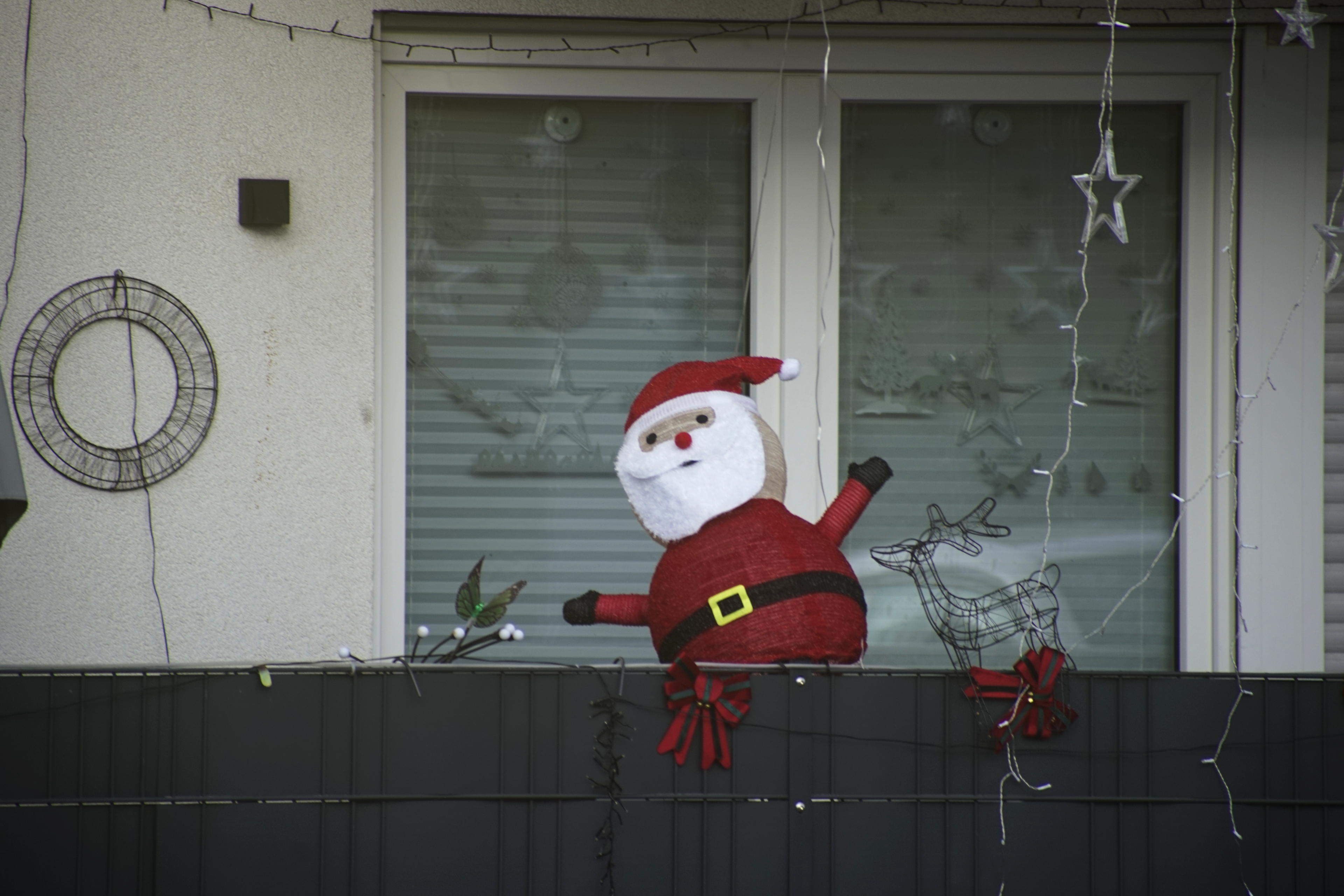 Der Stern da oben kommt ganz gut, auf die kurze Entfernung und mit der passenden Unschärfe der Balkone, die sich nach oben immer mehr verstärkt, finde ich gut. Auch das Schaf im Schaufenster hat was. Aber den Vogel abschießen tun mal wieder die Weihnachtsmänner, die hier in so manche Obergeschosswohnung einzubrechen versuchen.