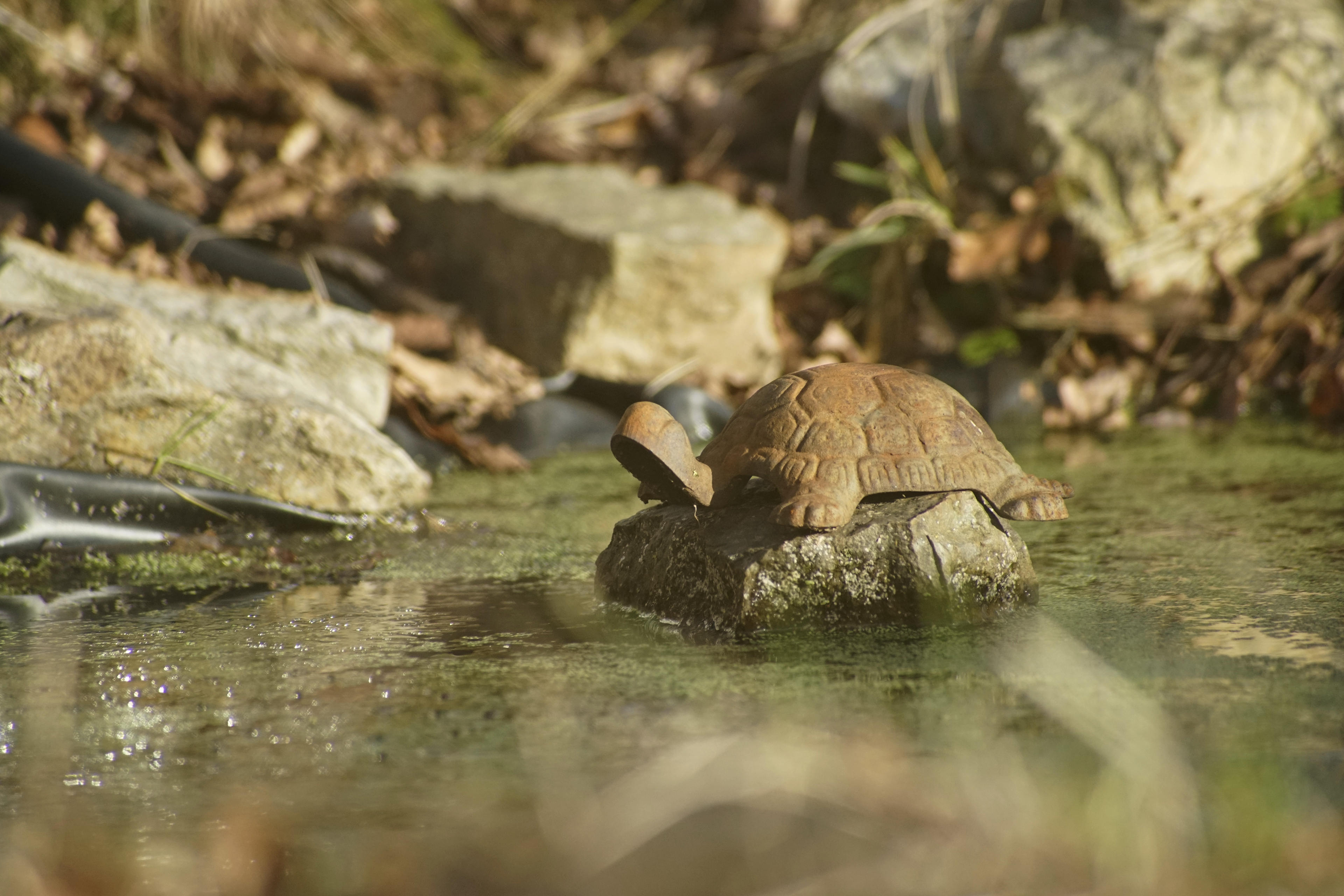 Die Schildkröte sitzt übrigens nicht im Dorfteich, nur dass das kein falsches Bild vermittelt. Das ist ein paar Meter vorher in einem privaten Garten. Aber da war auch mal wieder die lange Brennweite von Vorteil! Mit "normalen" Objektiven hätte ich dieses Bild wohl nicht gemacht. Die Blumen und der rote Generator stehen hingegen am Teich, welchen ich selber gar nicht fotografiert habe. Der ist mehr oder weniger langweilig, nur so'n Loch im Boden. Sieht ein bisschen nach einem Bombenkrater aus. Ich hab keine Ahnung, aber vielleicht hat hier einer einen Fehlwurf getätigt, als sie eigentlich die Meys-Fabrik treffen wollten. (Ich habe ehrlich gesagt viel zu wenig Wissen darüber, was hier im Krieg alles passiert ist. Ich weiß, dass Eitorf tatsächlich ein Ziel war, wegen der vielen Industrie. Aber hier in Hennef? Ich habe keine Ahnung.)