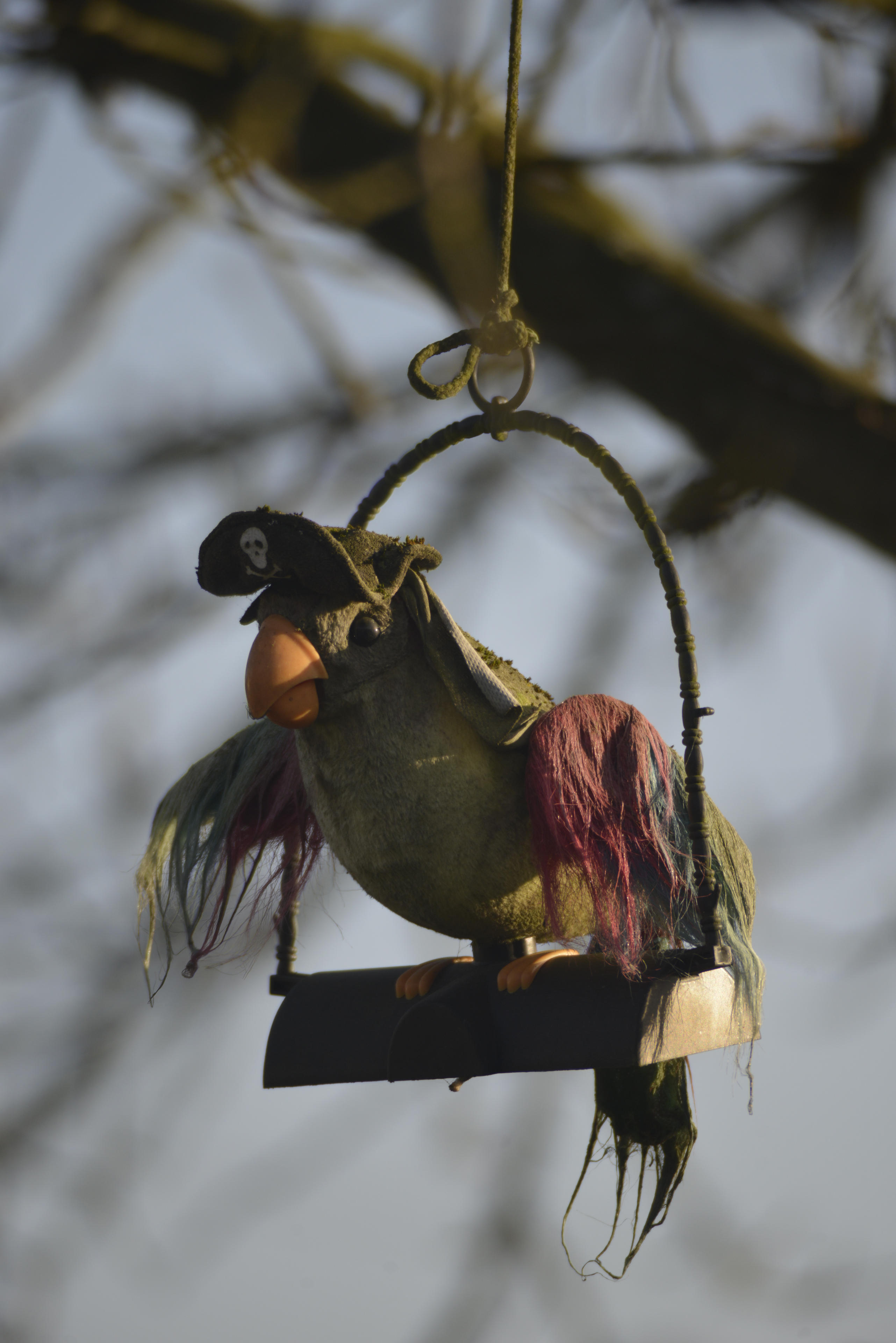 Noch ein Frühlingsbote: Die Taube. Die war allerdings so schnell aus der Hüfte geschossen, dass ich da natürlich keine Zeit für eine Belichtungskorrektur hatte. Die ist also nur anhant ihrer Silhouette als Taube zu erkennen. Der Halsring ist gerade so noch auszumachen, der Rest säuft in der Dunkelheit ab. Lora, die Piratrin, hingegen konnte ich mal aus einem ganz anderen Winkel als sonst einmessen. Lange Brennweiten machen andere Standorte möglich. Mit Offenblende gibt es sogar sehr viel Unschärfe im Hintergrund. Gut, bei 400mm auch nicht so erstaunlich.