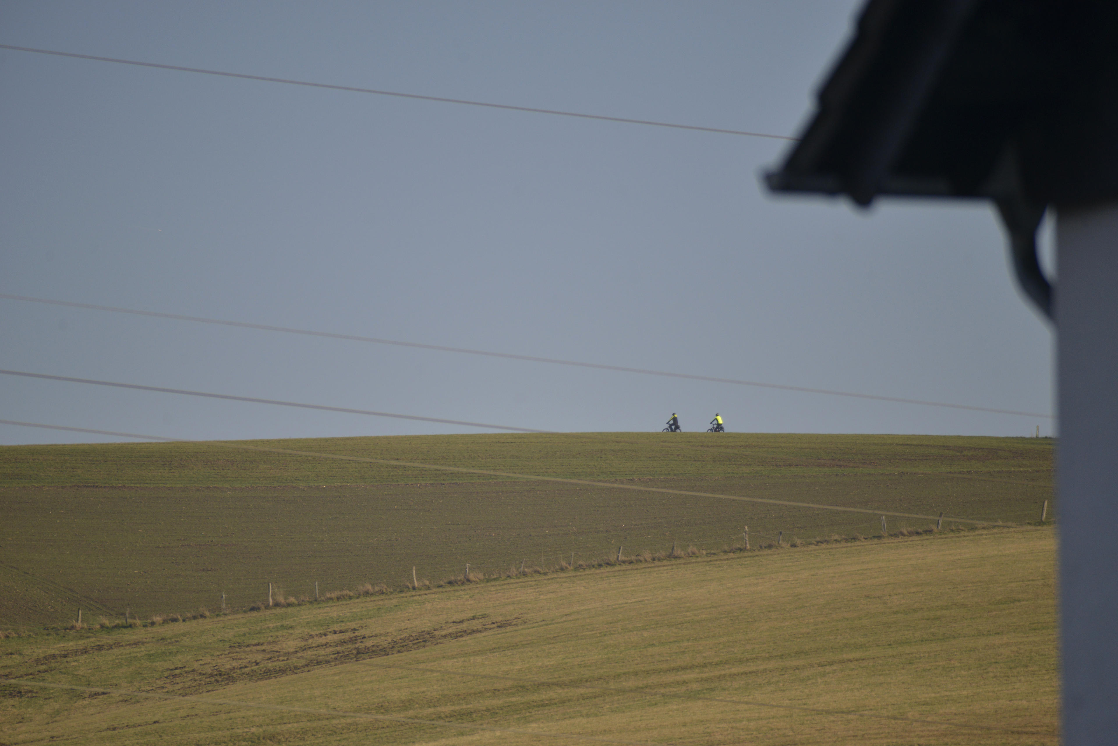Ein Blick hoch nach Kuhweid: Fahrradfahrer und Strohrollen. Beides lässt sich mit 400mm gut einfangen. Aber hier zeigt sich auch ein Problem dieses Objektivs, das ich bisher noch nicht bemerkt hatte: Es ist ein kleines bisschen kurzsichtig. Soll heißen, es schlägt zu früh bei Unendlich an. Wobei es dabei allerdings nicht richtig unscharf ist. Ich glaube, die Daten, die der Autofokus liefert, müssen nur ein bisschen weiter nach vorne korrigiert werden. Jedenfalls führt das dazu, dass die Kamera manchmal nicht auslösen will, weil sie den (vermeindlichen) Schärfepunkt nicht erreichen kann. Ich hab habe das daraufhin, als das Problem immer wieder mal auftrat, in der Kamera auf -5 korrigiert, aber ich glaube, das ist ein bisschen viel. Muss ich mal genau ausmessen. Ich hätte das vor allem mal früher machen sollen, dann hätte ich das unterwegs gleich mal testen können, wie sich das auf die anderen Bilder auswirkt. Jetzt muss ich dafür noch mal raus. "Muss". ;-)
