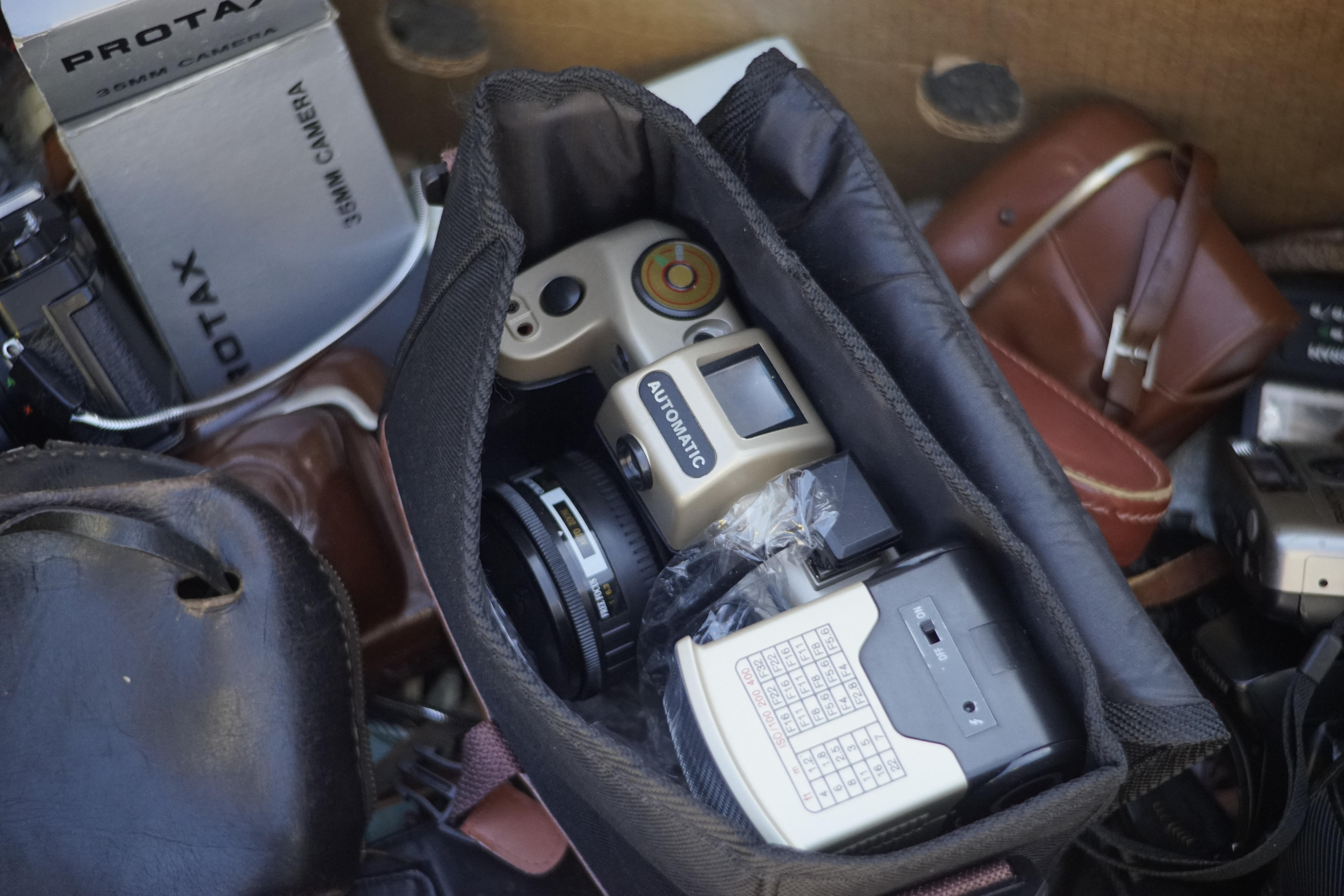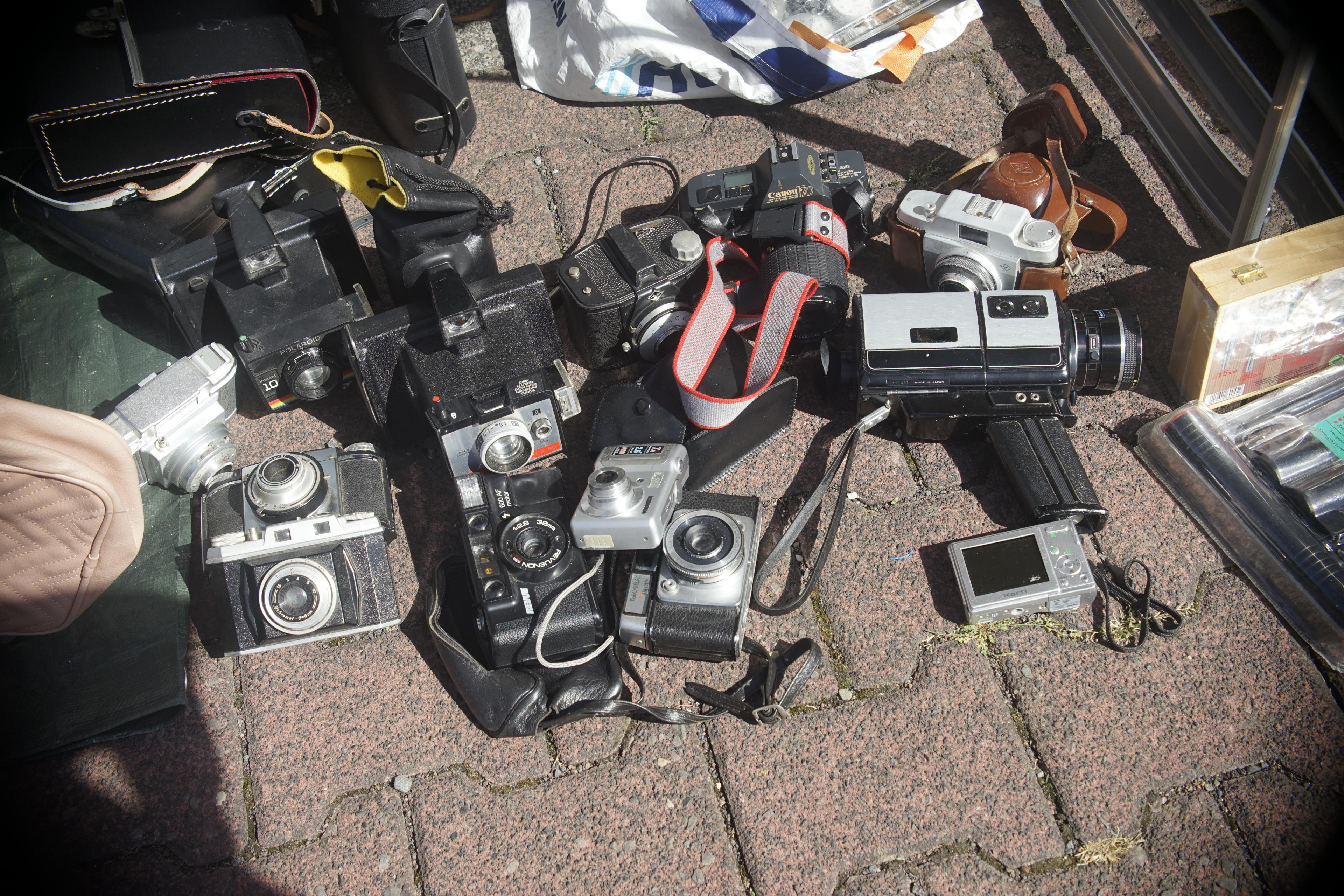 Wie immer, wenn ich auf den Flohmarkt gehe, habe ich alle Adapter dabei, die ich für die Sony habe. Damit ich Objektive testen kann, wenn ich welche finde. Aber am Anfang habe ich die alle nicht gebraucht, es gab keine einzelnen Objektive. Nur ganze Kameras. Uns sowas, was ich niemals als Kamera bezeichnen würde: Diese Fest-Fokus-f/6,3-Dinger tauchen echt ü-ber-all auf, wenn man danach die Augen offen hält. Wer sowas unter die Leute bringt und dafür auch noch gutes Geld verlangt hat, damals in der weiter zurück liegenden Vergangenheit, der sollte nachträglich noch mal kräftig vertrimmt werden. Totale Verarsche! Auf'm Flohmarkt natürlich voll richtig. Irgendwann nehme ich mal eine davon mit und zeig euch mal, wie unterirdisch die Dinger sind!