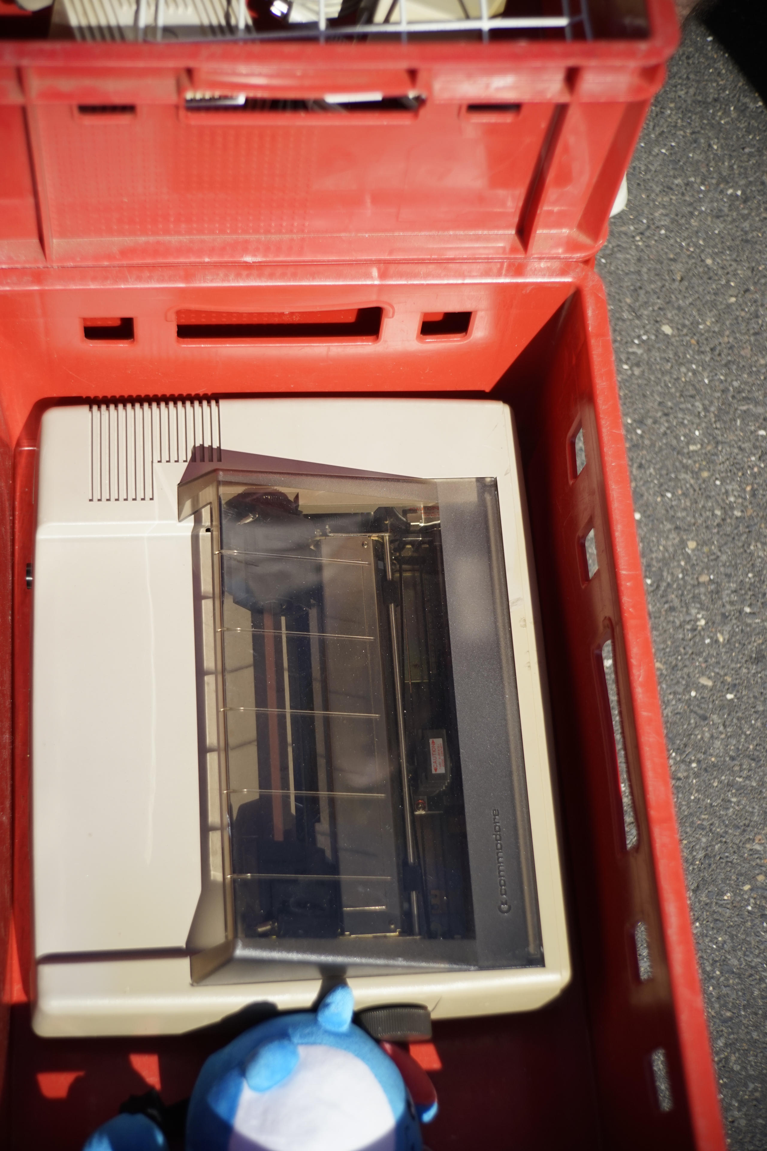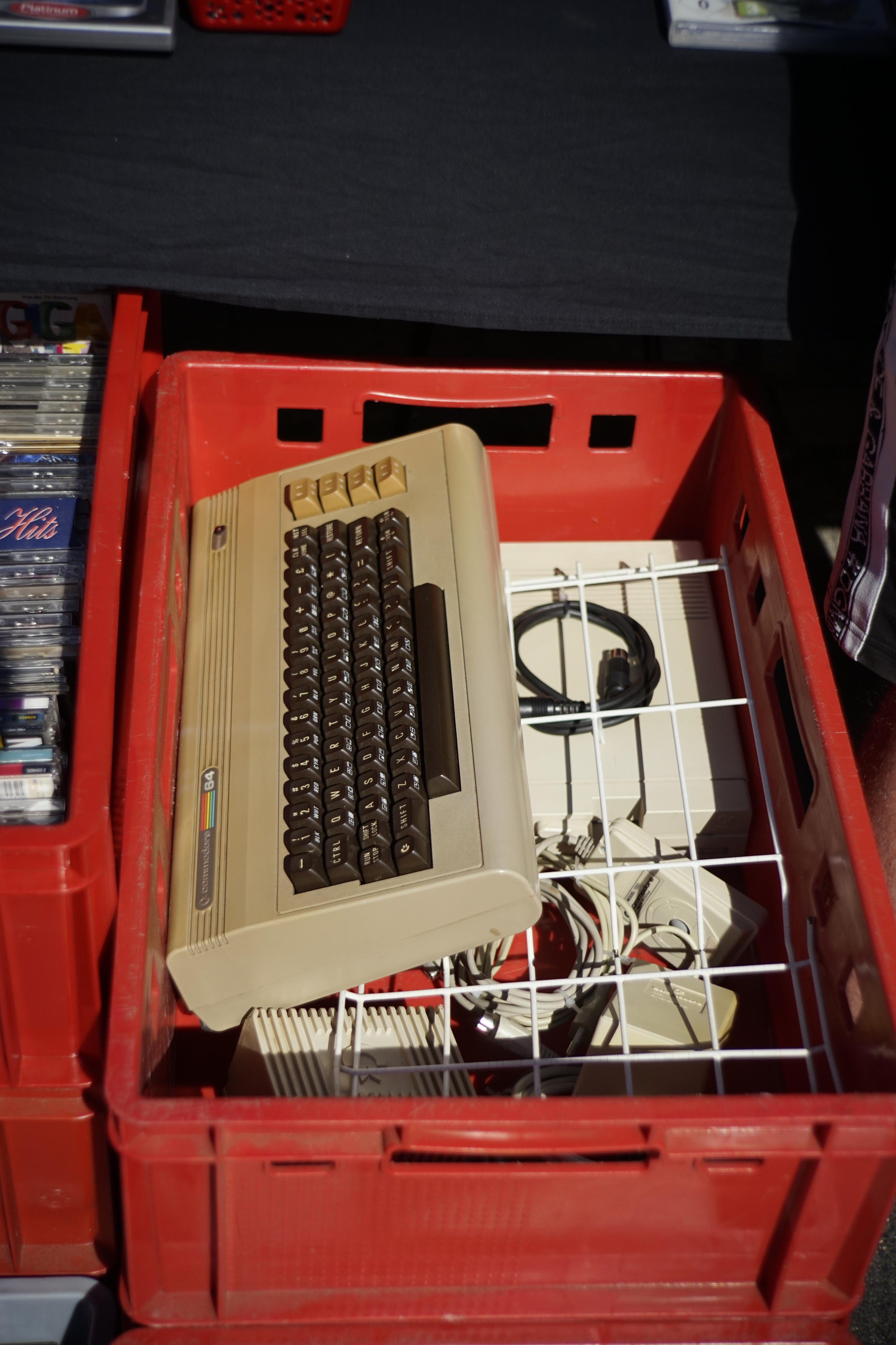 Interessanter war da der Brotkasten, den ich am Wegesrand gefunden habe. Leider war die Seriennummer abgefeilt, sodass ich nicht direkt sehen konnte, welche Version wir hier haben (zB sowas wie Longboard vs. Shortboard). Für 140 Euro (wenn ich mich recht erinnere) auch nicht ganz billig, dafür aber vollständig mit Floppy (1541-II, weshalb ich auch auf einen späten Brotkasten tippe) und Drucker und sogar mit Maus. Am Stand nebenan dann auch noch ein original verpackter C64 C. Oder II. Oder wie auch immer die den damals gebrandet haben. Auch mit einem Commodore-Drucker dabei, einem 1230. Ich höre die Nadeln kreischen, wenn ich nur dran denke!