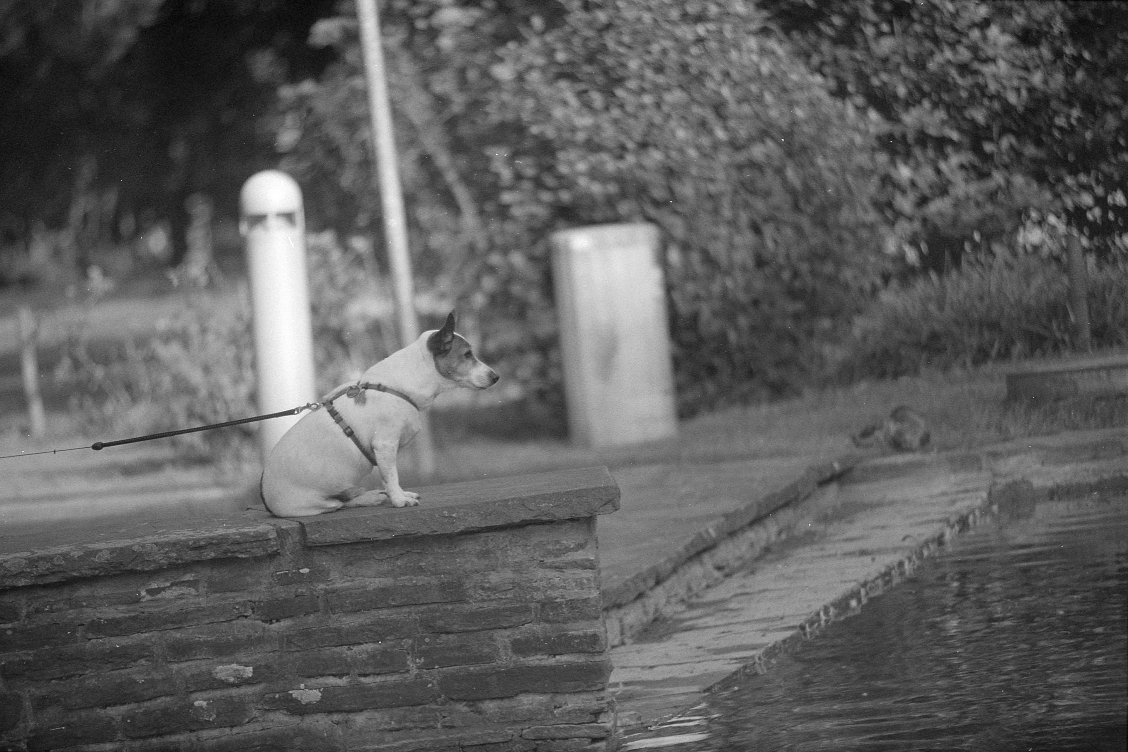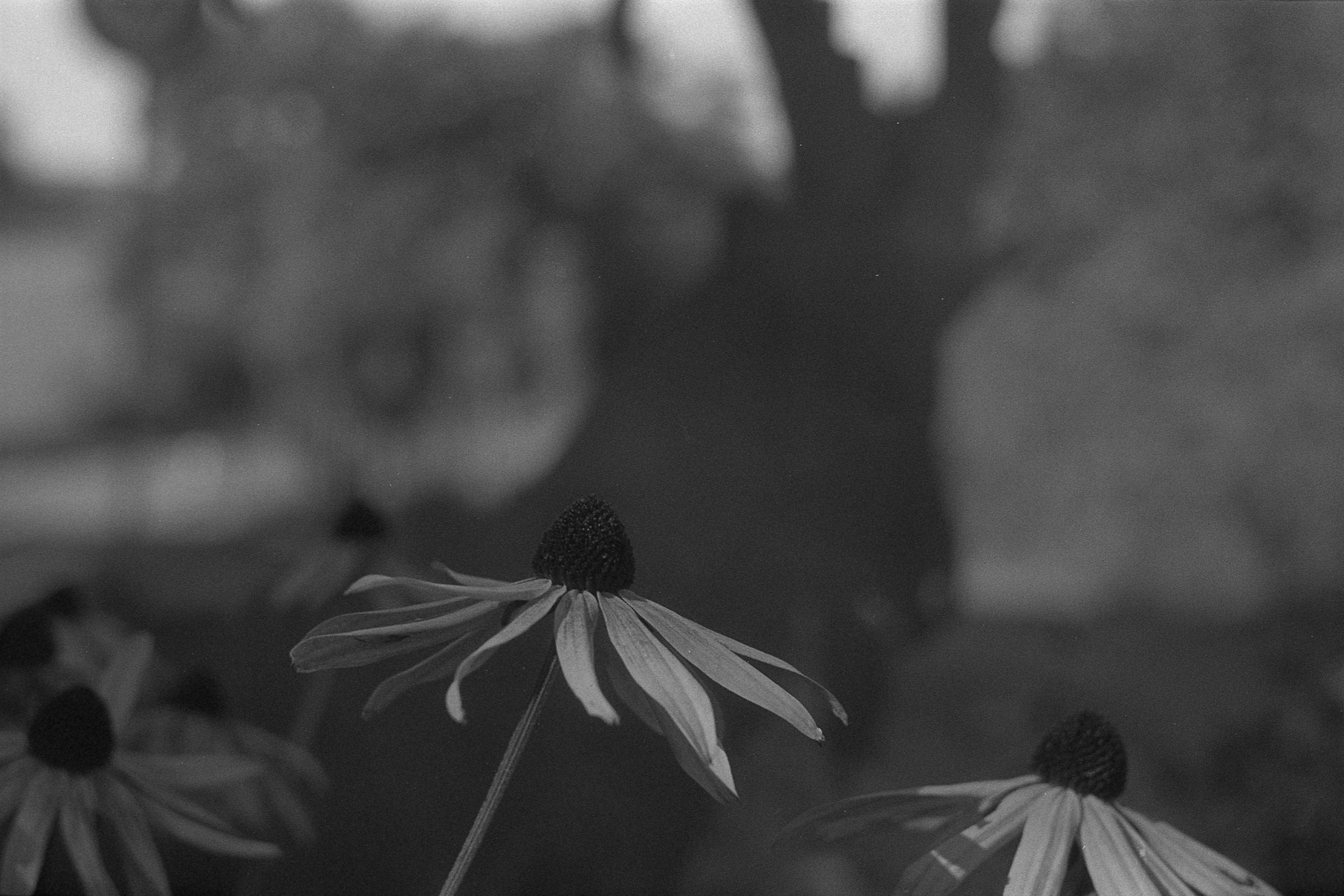 Richtig gut - obwohl auch nur s/w - gefällt mir hingegen die Rose, die da an der Seitenwand der Kirche steht. (Vivitar macro, 1/125s, f/8.) Faszinierend, wie groß die Steine im Hintergrund wirken, wenn man ein Tele für sowas verwendet. Könnte noch ein bisschen schärfer sein, die Fokusebene ist zu weit hinten. Aber insgesamt gut. Ich meine, mich zu erinnern, dass das Wetter an dem Tag leicht windig war; wahrscheinlich hat es die Blüte nur mal wieder aus dem Fokus heraus geweht.