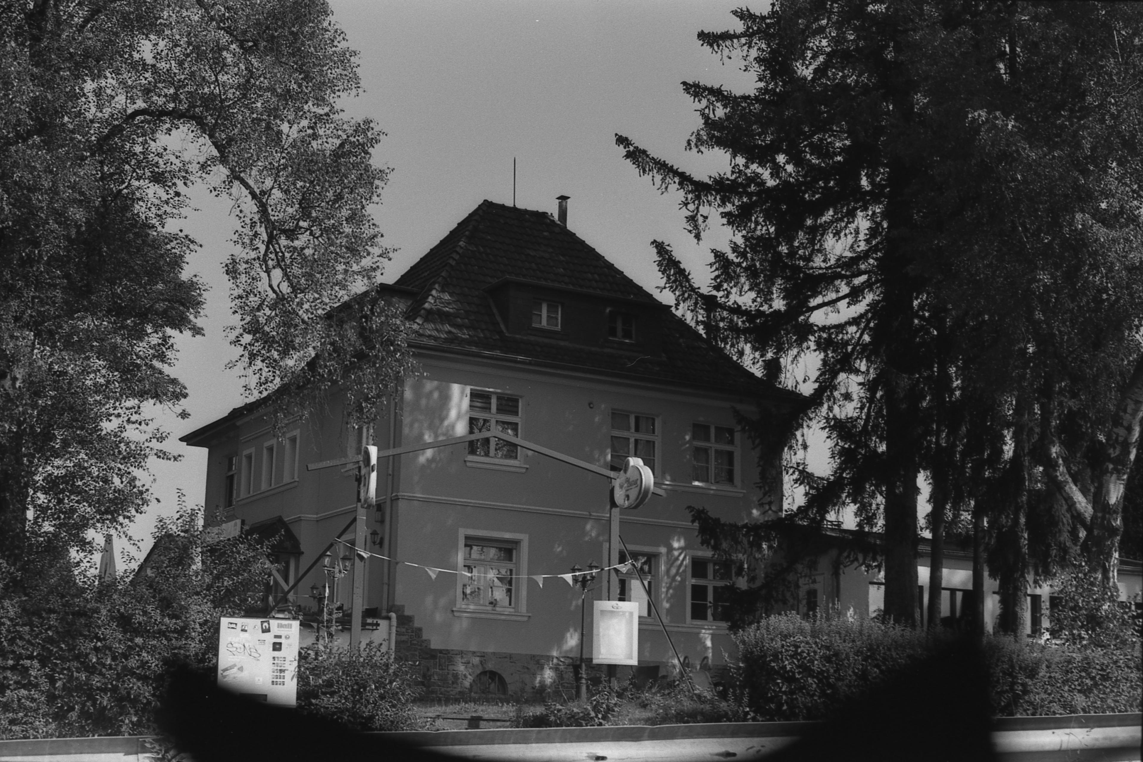 Das Stück im Vorgarten gegenüber hat weniger gelitten, da der Himmel eh so hell ist, dass er die Lampenaufhängung überstrahlt. (Helios, unbekannte Werte.) Da hatte ich gedacht, ich hätte das jetzt endlich mal anständig dokumentiert, ist das auch wieder nix. Na, aber egal, ich habe eh zu sehr in die Mitte gezielt; den Klotz weiter unten im Bild wäre besser gewesen.