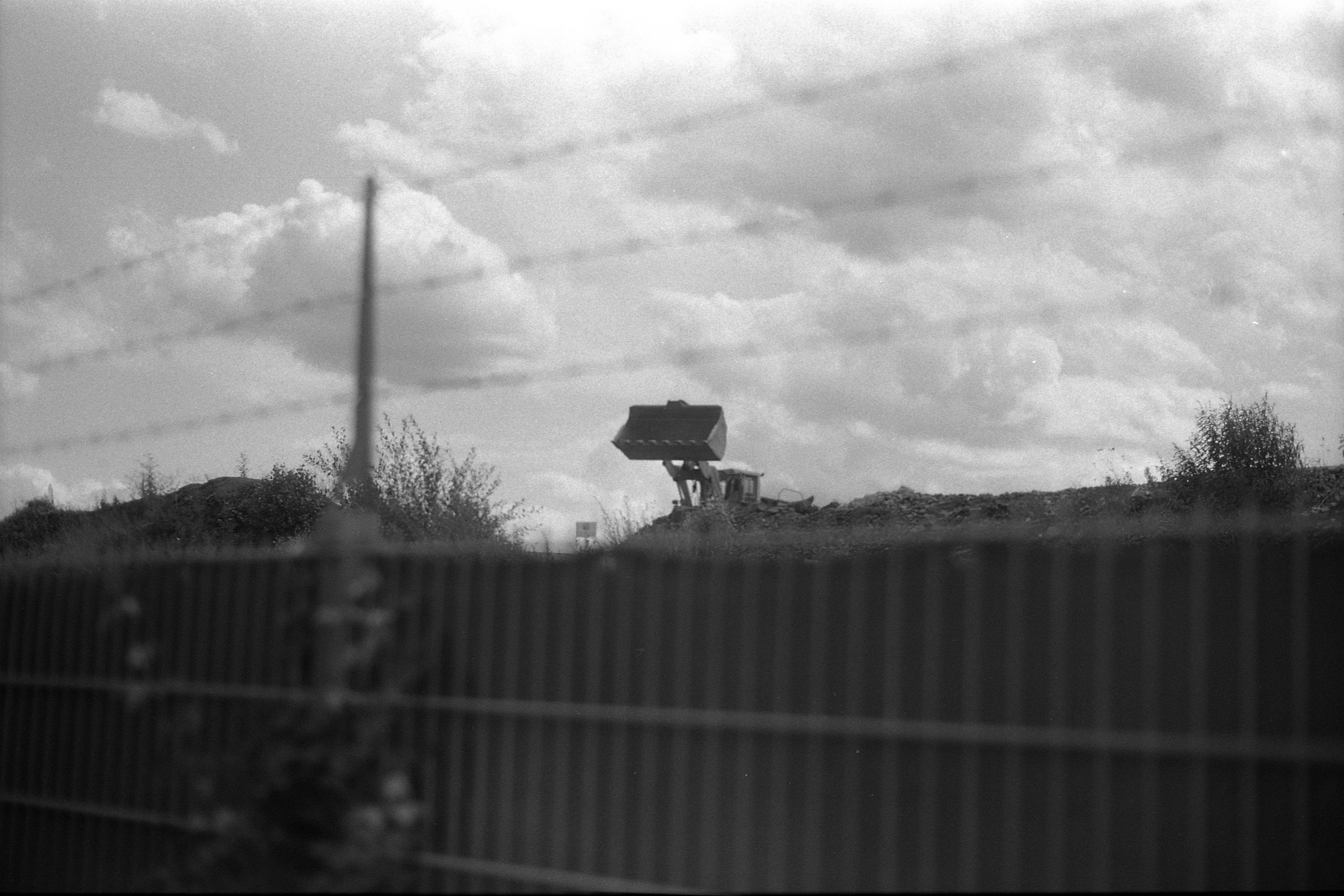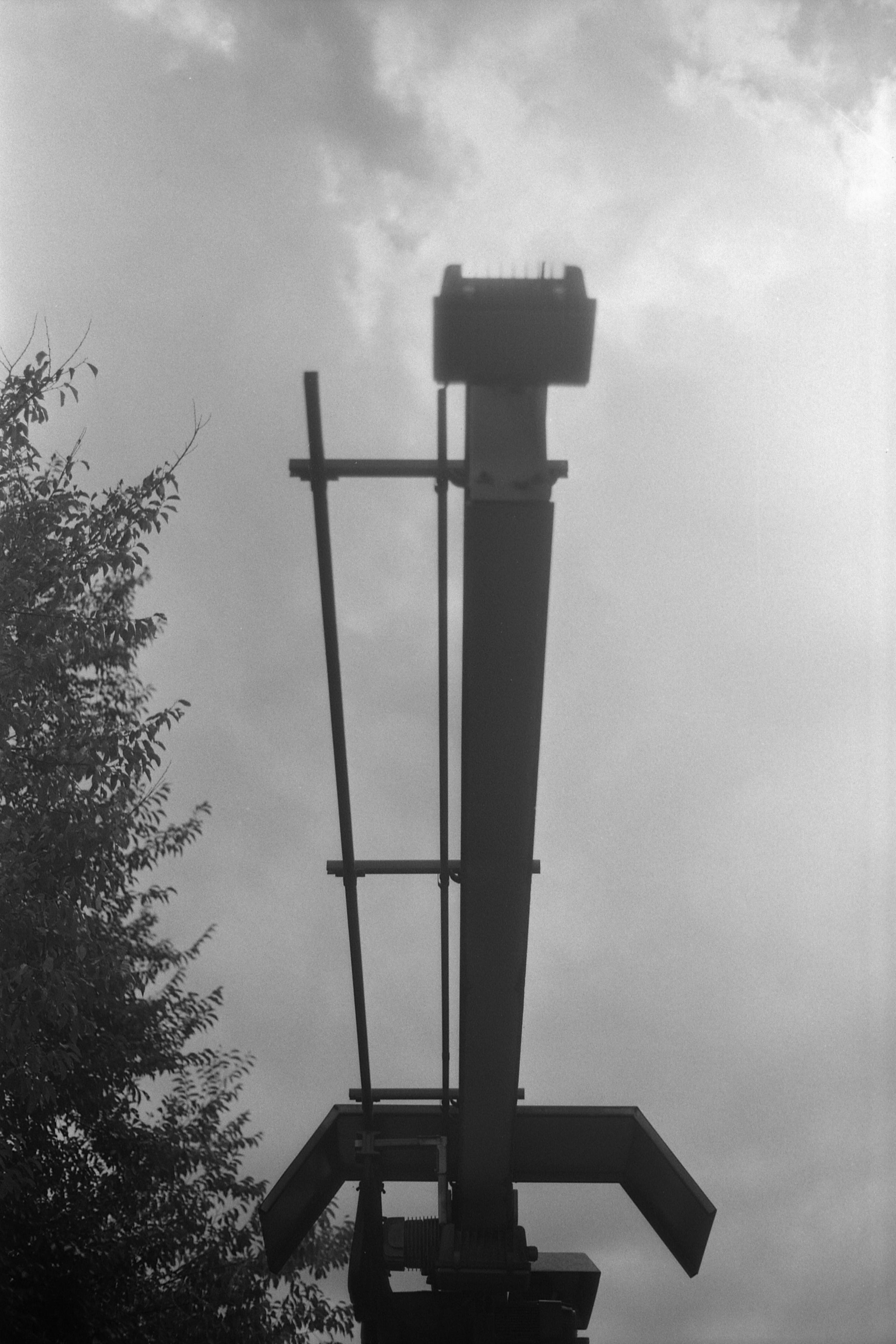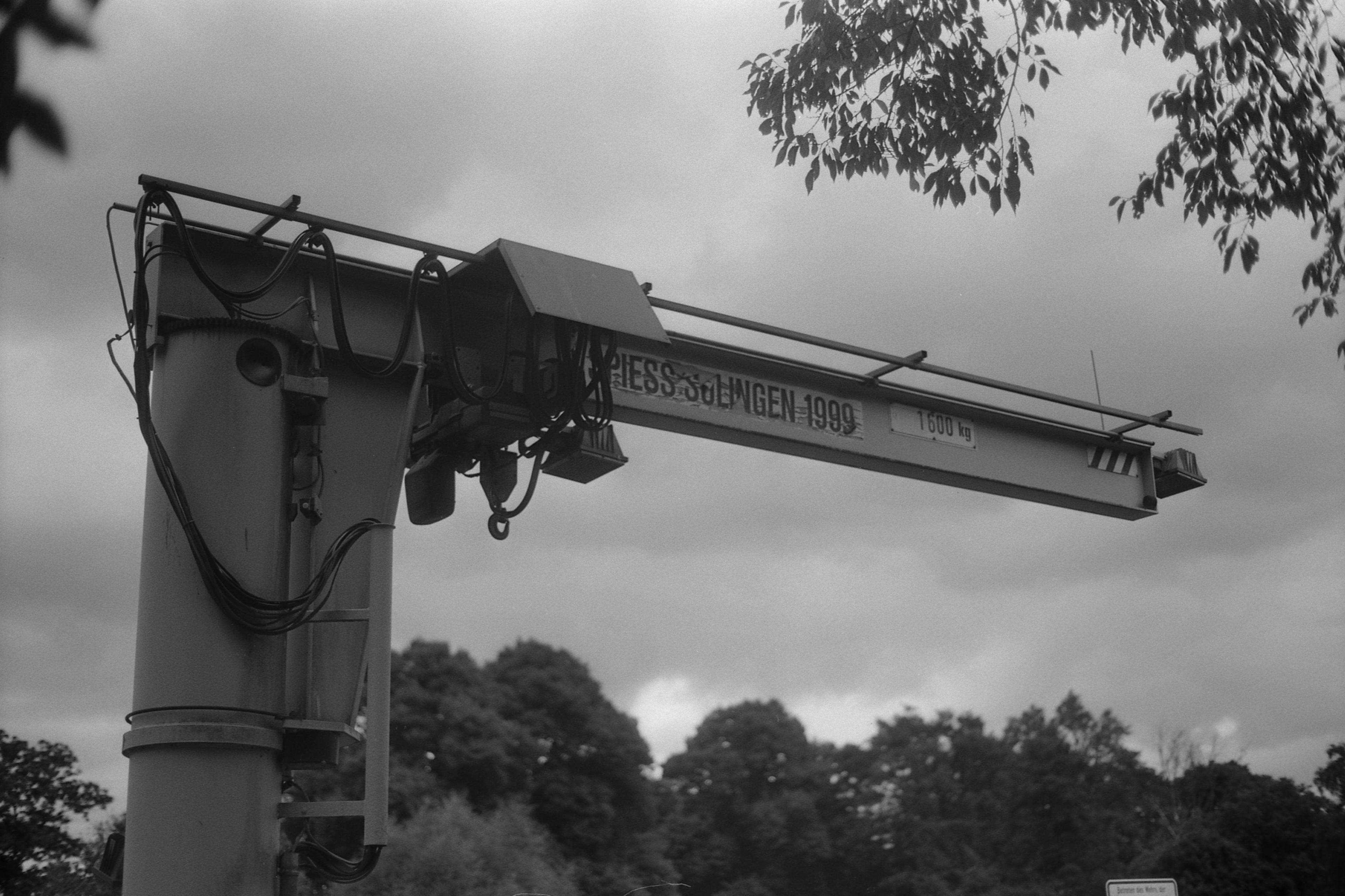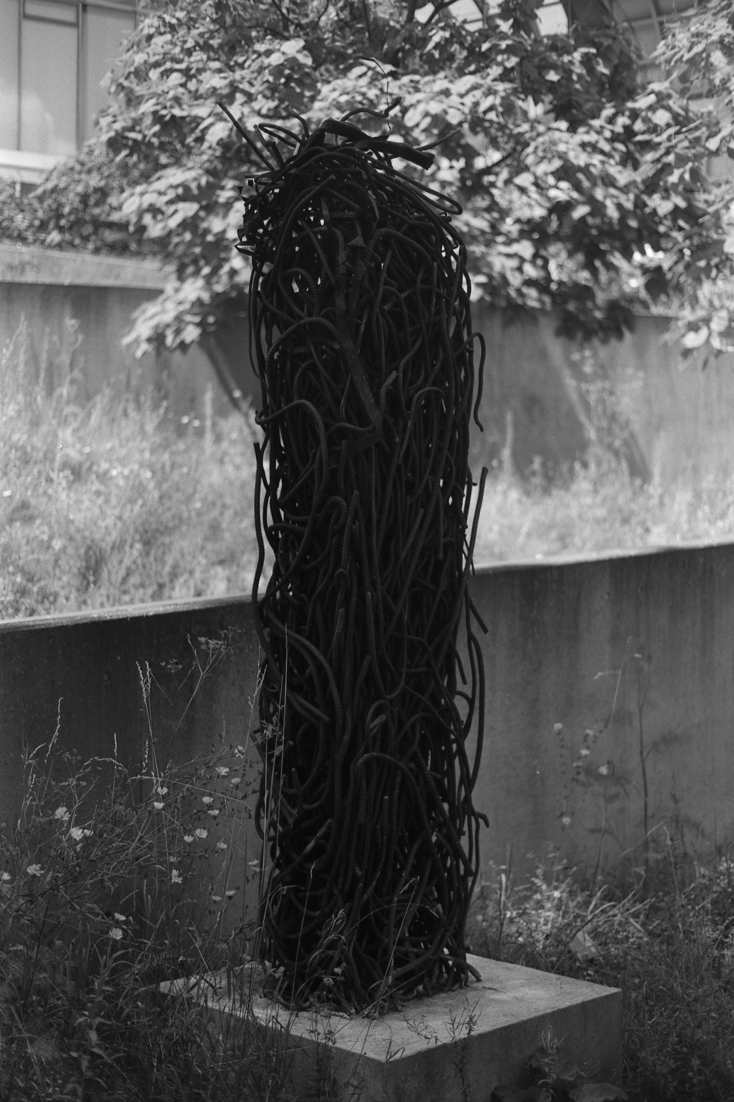 Apropos Kunst: Rot rostende Eisengedönse kommen auf s/w-Film von Foma immer sehr, sehr dunkel daher. (M, 1/500s, f/2.) Und ich konnte manuell die Blende mal ein wenig weiter offen halten. Durch Kontrast und Hintergrundunschärfe hebt sich dieses drahtige Phallus-Symbol schon recht deutlich von seiner Umgebung ab. Krass! Spannendes Foto, finde ich.