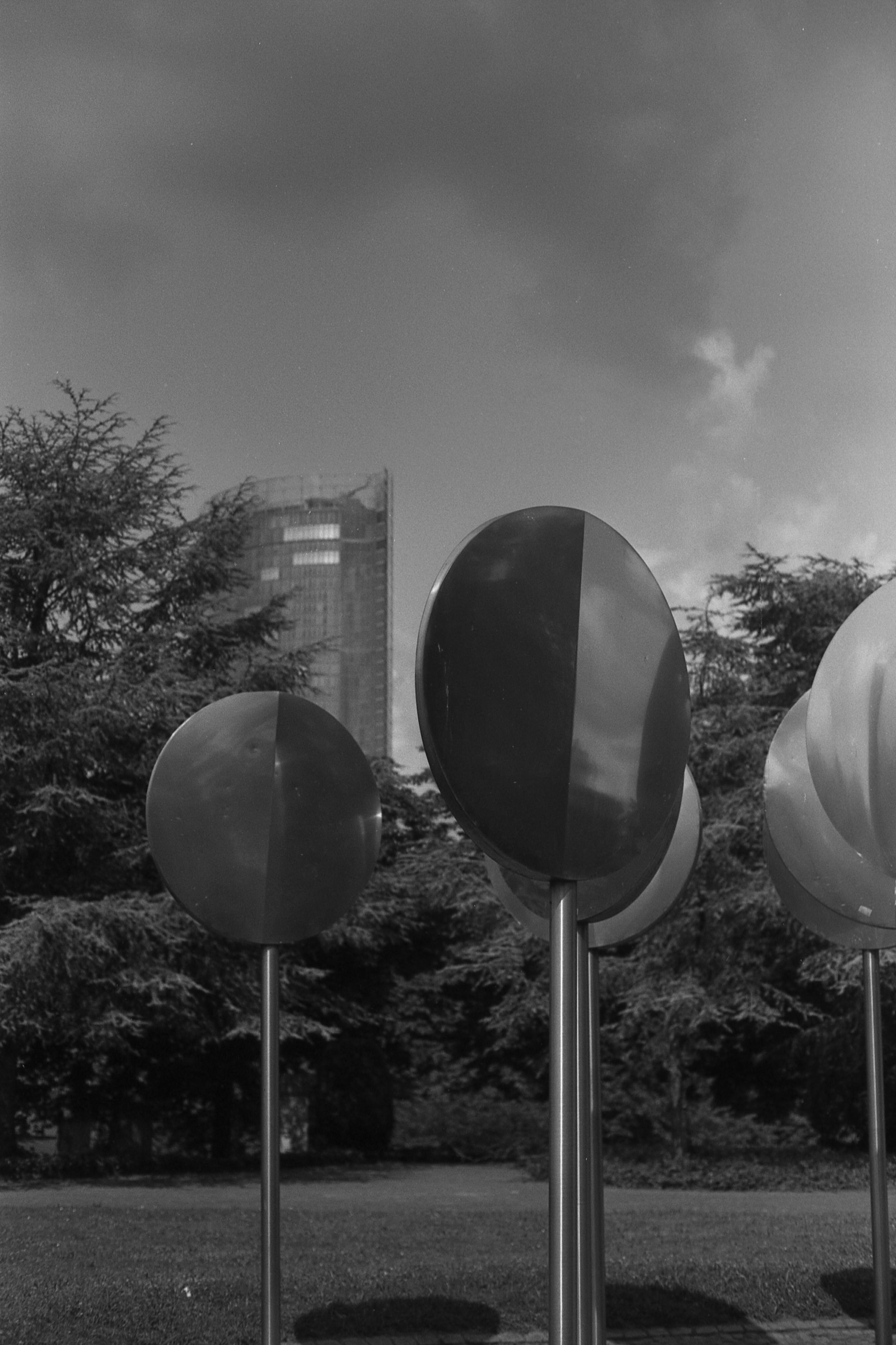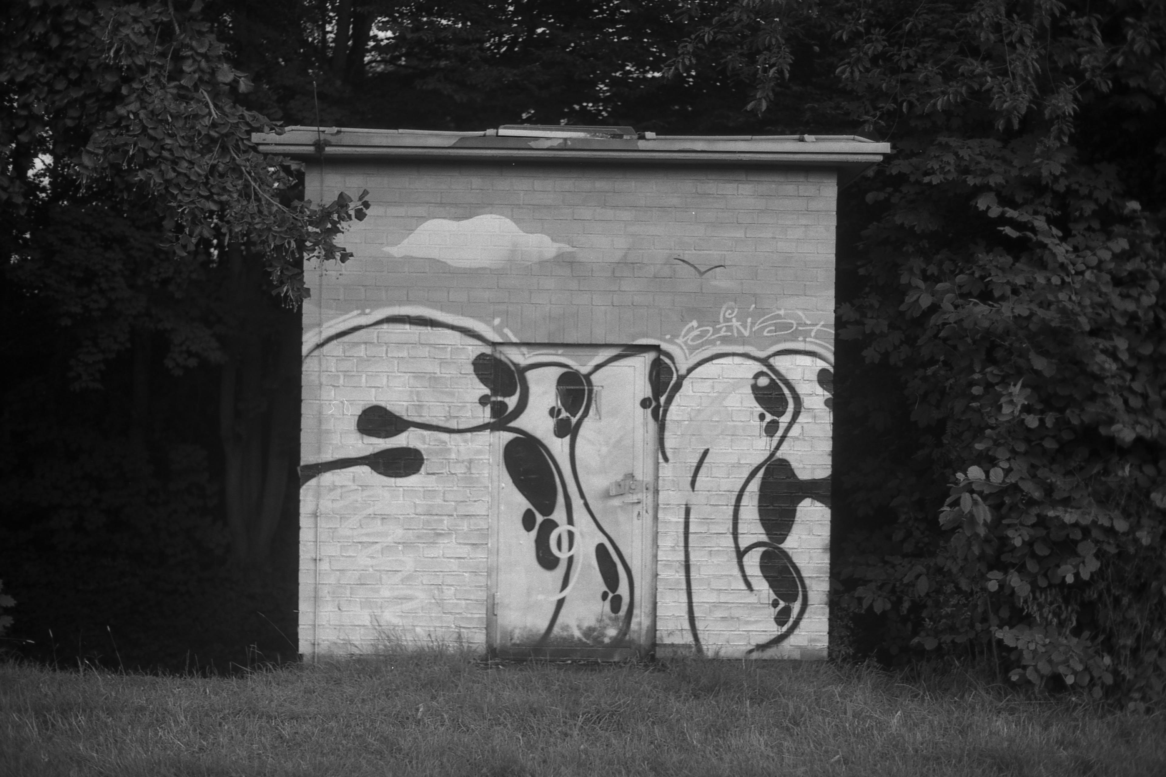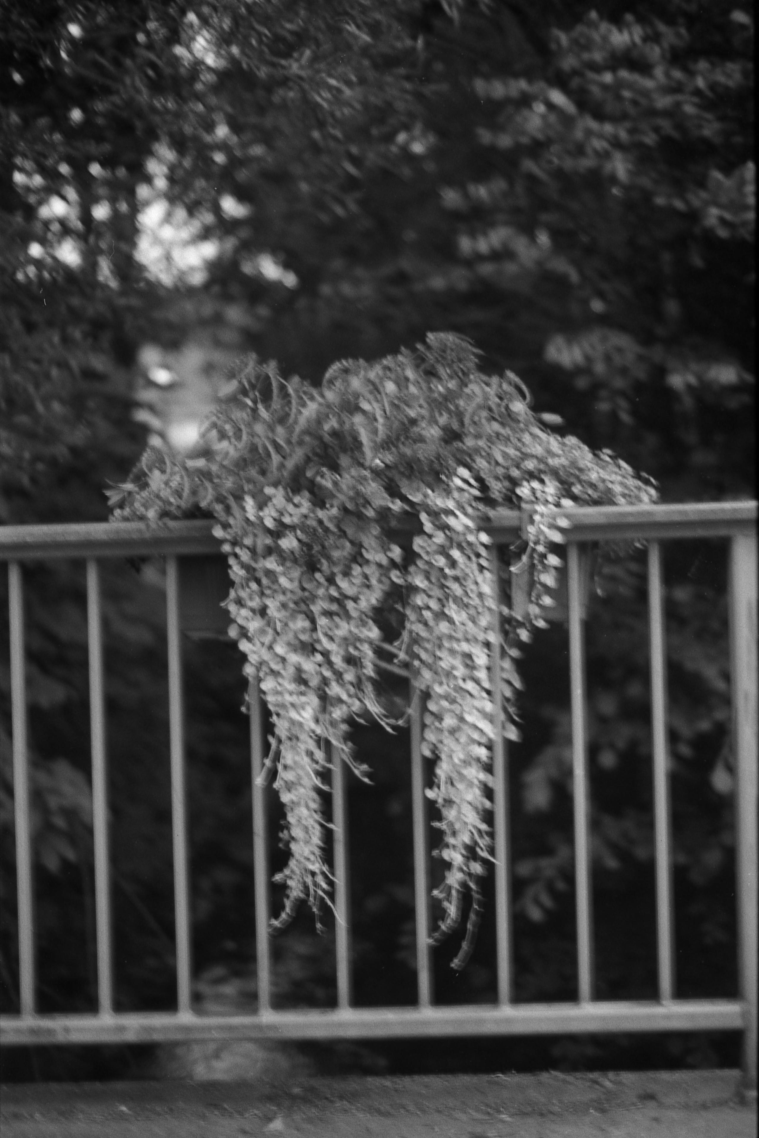 Apropos Kunst: Rot rostende Eisengedönse kommen auf s/w-Film von Foma immer sehr, sehr dunkel daher. (M, 1/500s, f/2.) Und ich konnte manuell die Blende mal ein wenig weiter offen halten. Durch Kontrast und Hintergrundunschärfe hebt sich dieses drahtige Phallus-Symbol schon recht deutlich von seiner Umgebung ab. Krass! Spannendes Foto, finde ich.