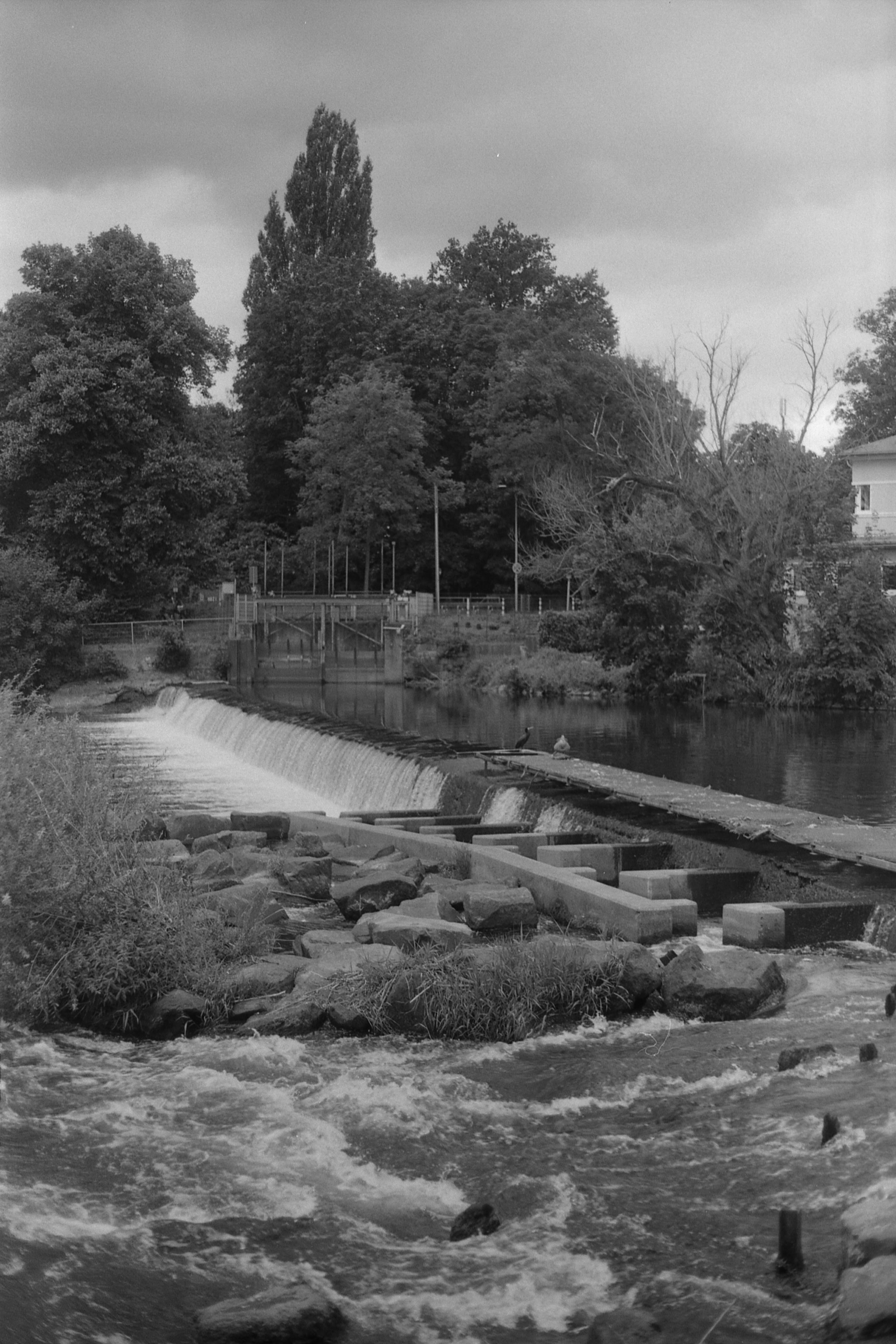 Zu guter Letzt noch ein Blick über den Zaun: Der Gang über die Steine im Wasser am (abgeschalteten) Wasserfall war wegen Renovierung geschlossen. (P, 1/180s, f/4,5.) Auch eine eher uninteressante Ansicht, wenn man mal von besagtem Wasserfall absieht. Ich weiß gar nicht, jetzt waren wir dieses Jahr schon mehrfach in den Rheinauen, haben aber noch gar nicht geschaut, ob die das hier mal wieder frei gegeben haben... Hm... Ich rieche noch ein paar weitere s/w-Fotos in meiner Zukunft!